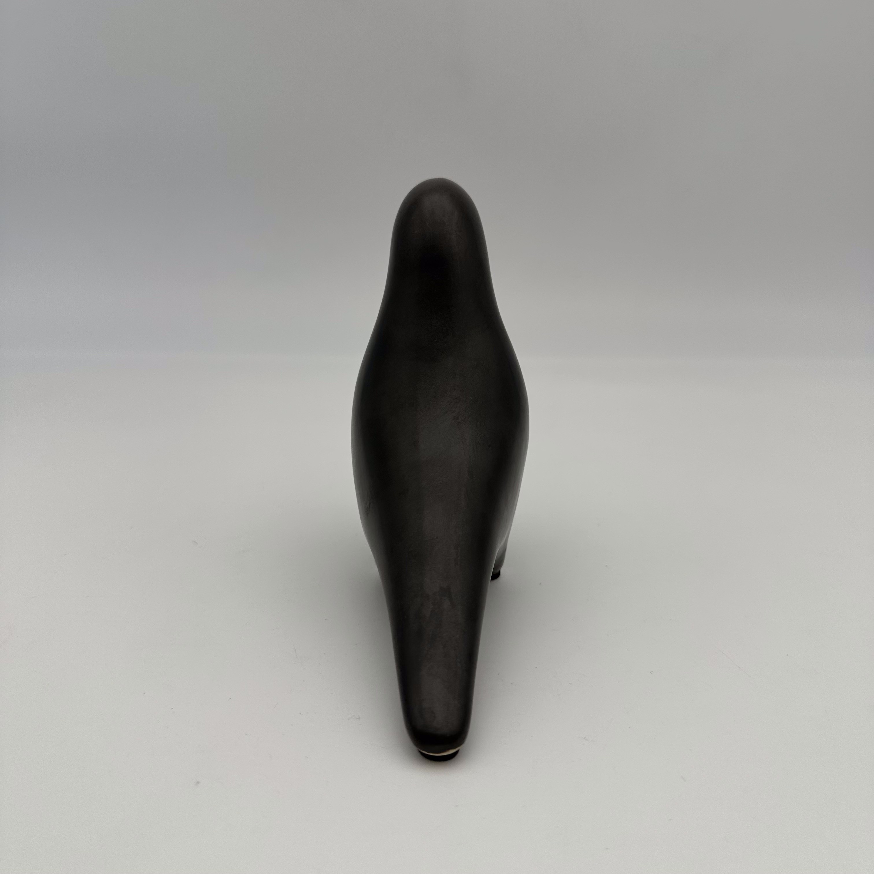 Avec ses 16 cm de long, l'oiseau séduit par son profil aérodynamique, sa fluidité organique et l'extrême douceur de ses courbes. La volonté de dépouillement est totale : l'œil est à peine suggéré, le bec fusionne avec la tête, et la queue s'étire en une ligne fuyante. Le choix de la matière sublime cette abstraction : une superbe glaçure noire, dense et subtilement satinée, vient accrocher la lumière sur les rondeurs de la céramique tout en lui conférant un aspect très tactile.