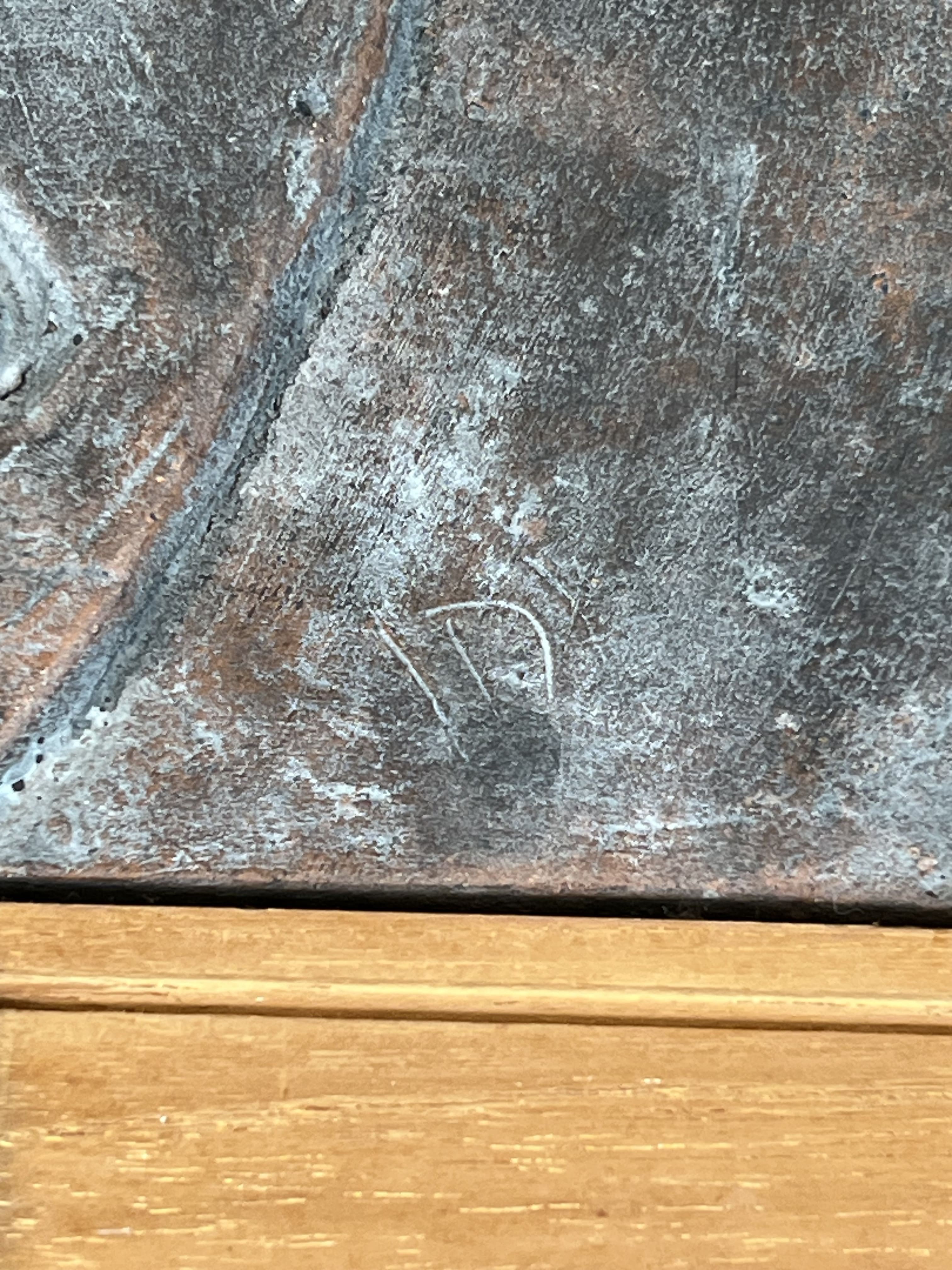 Ce tableau mural est constitué d'une importante plaque en céramique enchâssée dans un sobre cadre à profil plat en bois massif. L'œuvre présente un traitement en bas-relief souligné par de profonds traits incisés dans la matière. Le motif figure un visage humain hautement stylisé, déconstruit selon les codes géométriques du mouvement cubiste (superposant simultanément une vue de face et de profil). L'esthétique brute de la composition est renforcée par l'application d'une glaçure sombre, d'un gris anthracite nuancé à reflets métallisés, imitant techniquement l'aspect de la fonte de fer ou du plomb oxydé.