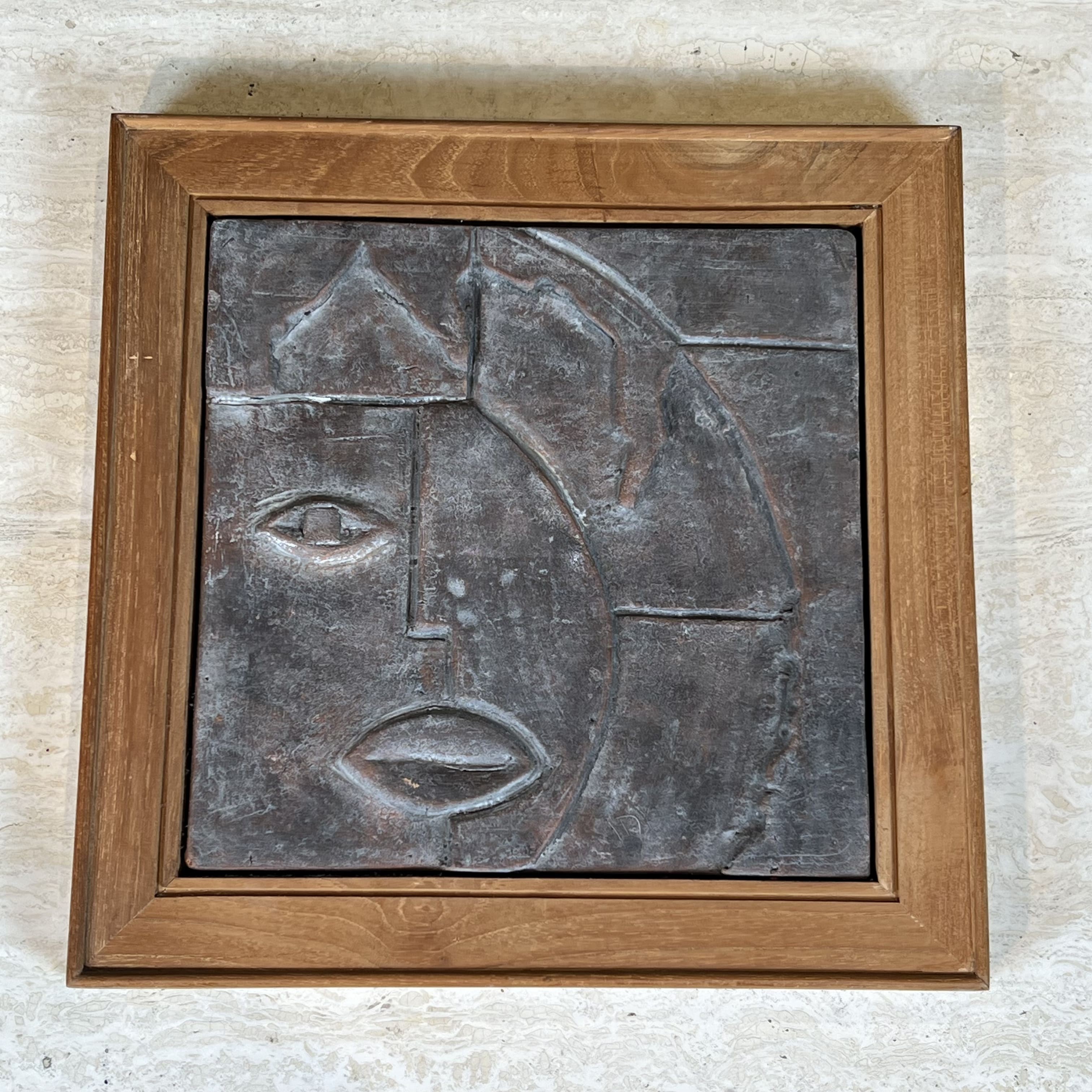 Plaque murale décorative encadrée. Céramique modelée en bas-relief figurant un visage stylisé d'inspiration cubiste. Glaçure sombre à reflets métalliques. Encadrement d'origine en bois massif. Dimensions : Largeur : 39,5 cm | Profondeur : 3,5 cm | Hauteur : 39,5 cm.