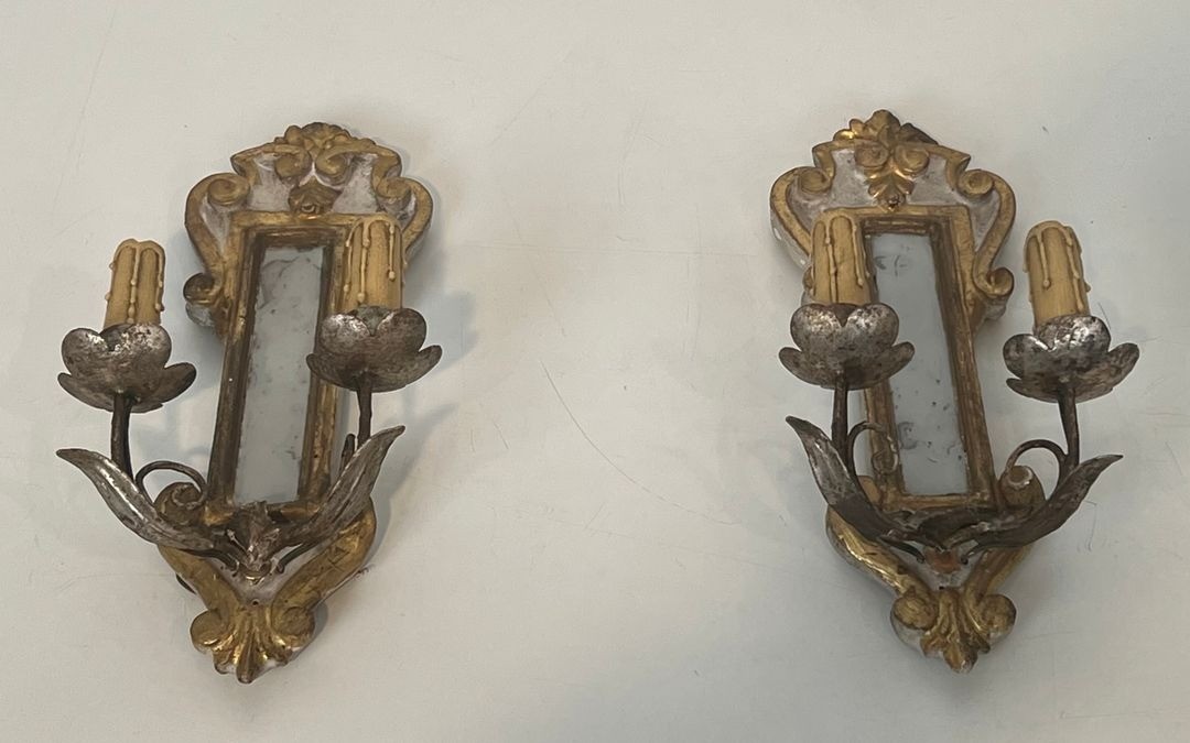 Paire d'appliques en bois sculpté et métal patiné argenté et doré présentant un miroir en leur centre. Travail Italien. Vers 1940