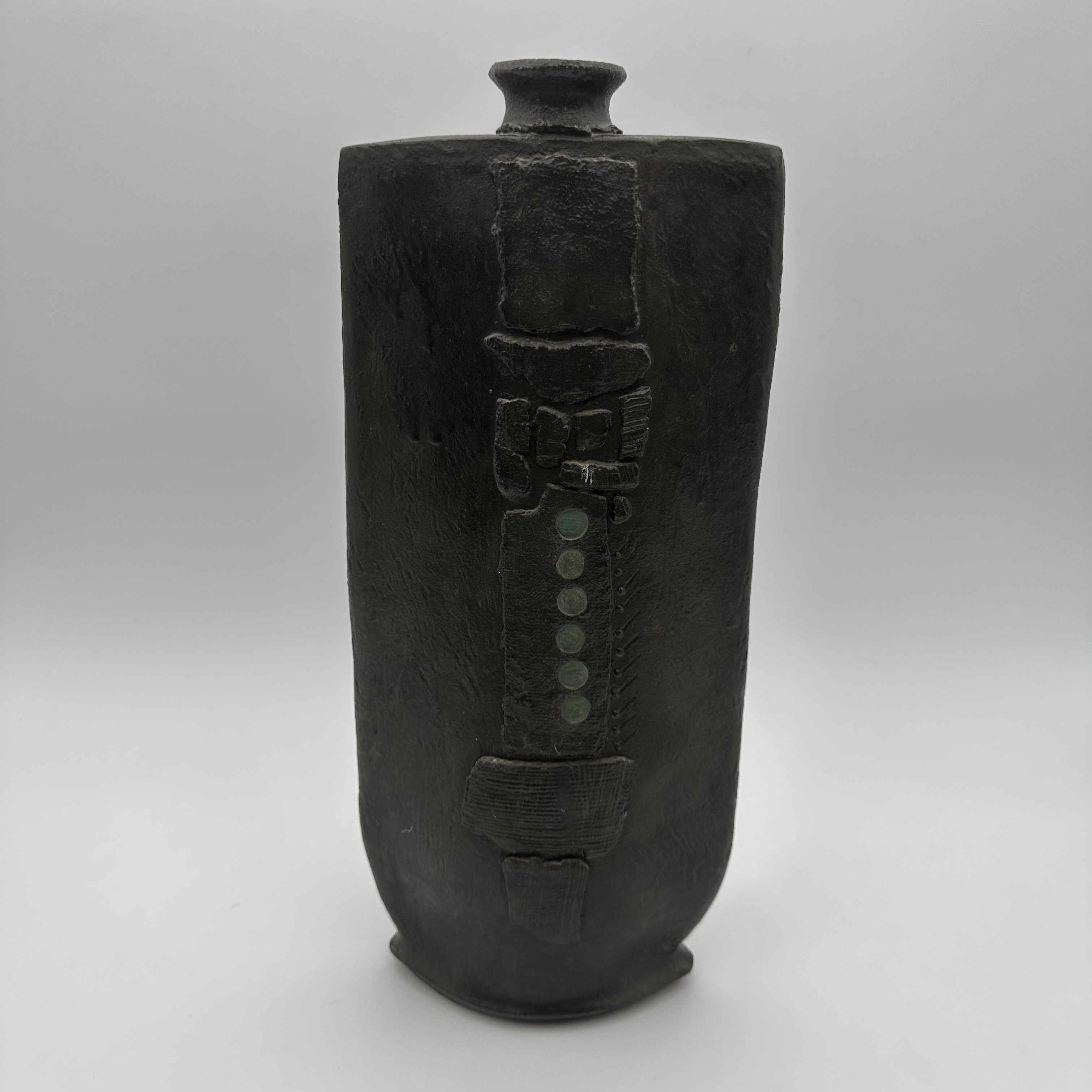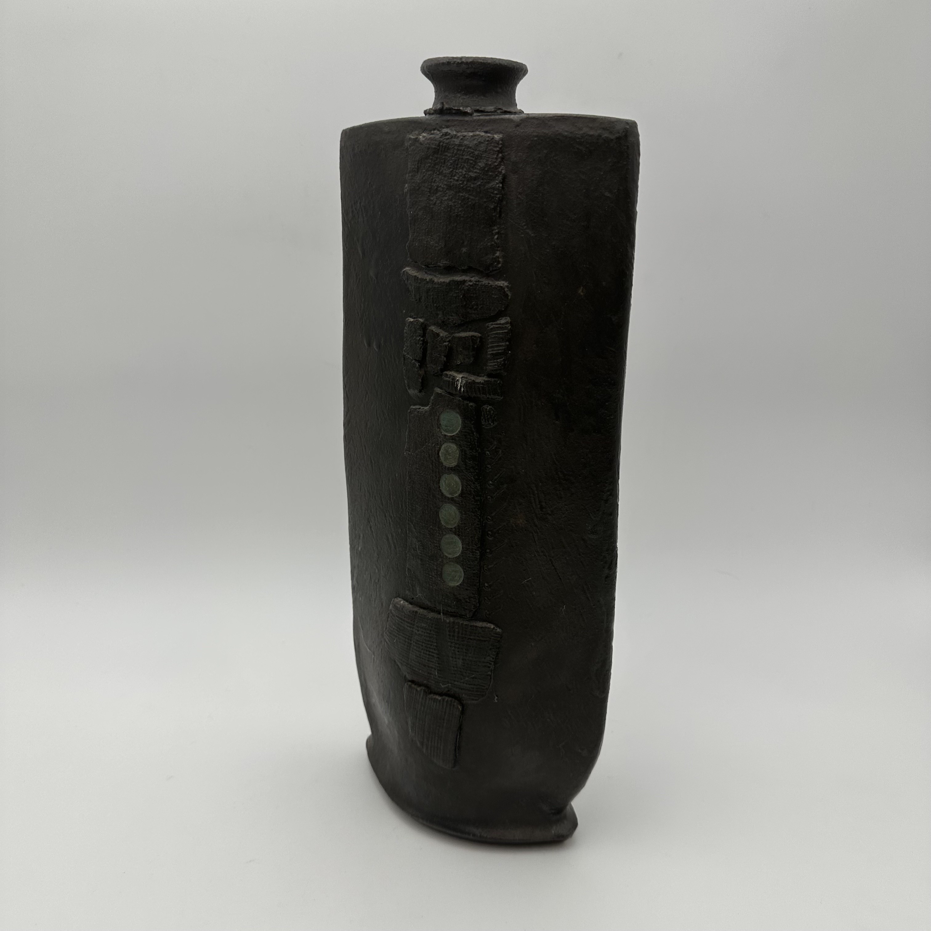 With its impressive height of 38.5 cm, the piece surprises with its flattened profile and small, constricted neck. The true power of the work lies in its surface treatment: the ceramic is covered in a rough, matte black glaze that absorbs the light. The main facade is animated by a masterful applied relief decoration. This vertical, almost totemic motif mixes striated textures, raw geometric blocks, and a series of small circular indentations that give rhythm to the composition. The piece bears an incised signature, guaranteeing its authenticity as a unique studio creation.