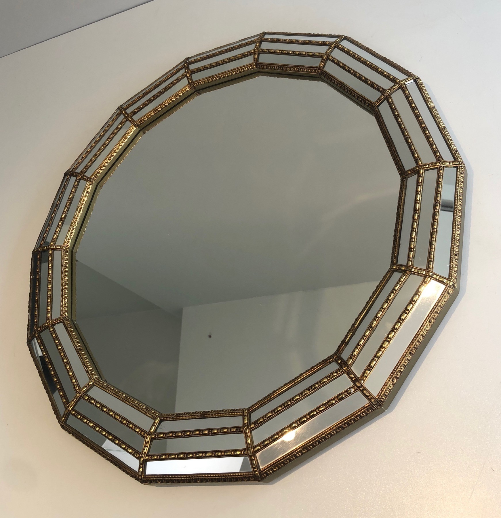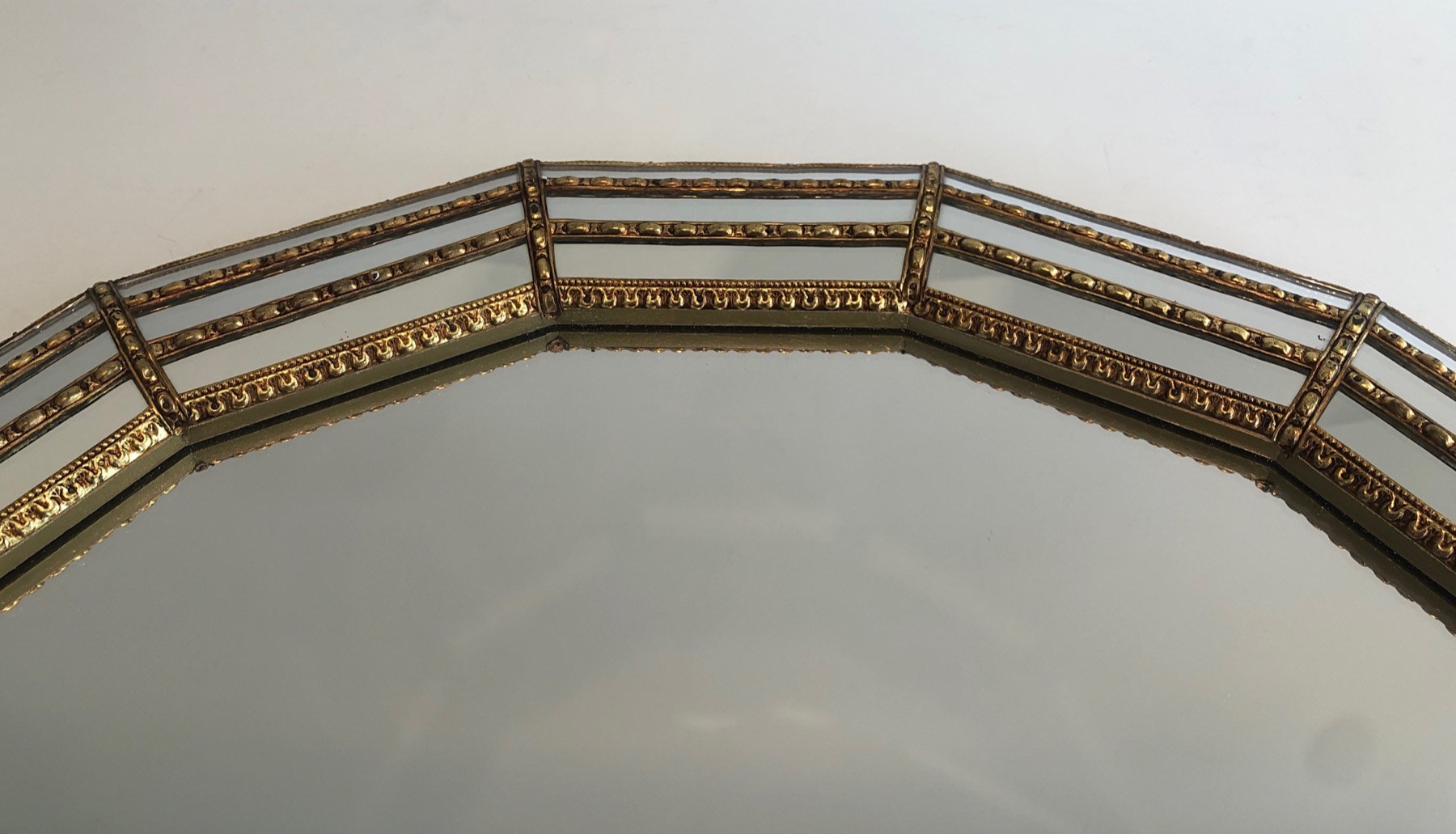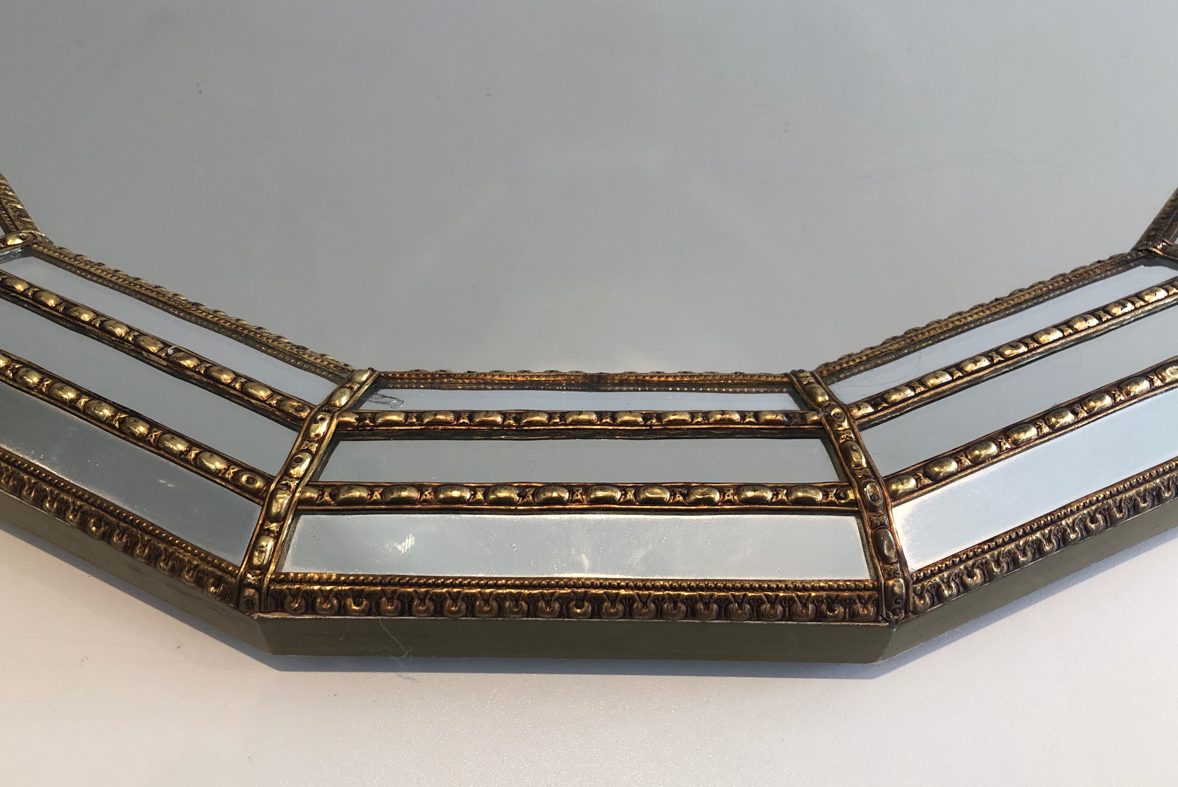 This octagonal wall mirror features a multi-faceted architectural structure. The assembly scheme revolves around a large central mirror plate, bordered by an angled frame consisting of eight peripheral mirror sections. The various glass panels are set and secured by a gilded brass frame, finely detailed with a raised continuous garland motif. This angled arrangement of the borders multiplies the reflections and adds depth and volume to the object.