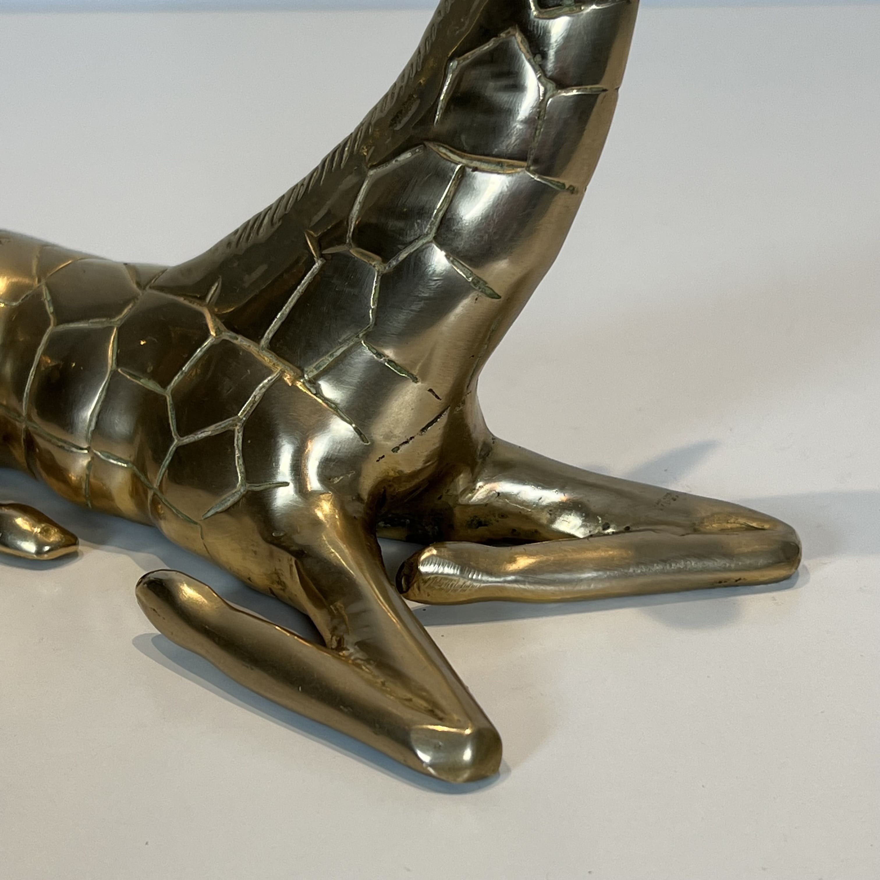 This pair of sculptures is a characteristic creation of 1970s decorative arts. The set features two giraffes in complementary postures: the first stands on all four legs, while the second is depicted lying down with its limbs folded beneath its body. The execution relies on solid cast brass. The visual interest of these pieces lies in their surface treatment: the metal, intensely polished to catch the light, is traversed by a network of incised lines accurately imitating the animal's geometric (reticulated) coat. Anatomical details (ossicones, ears, snout) are finely highlighted.