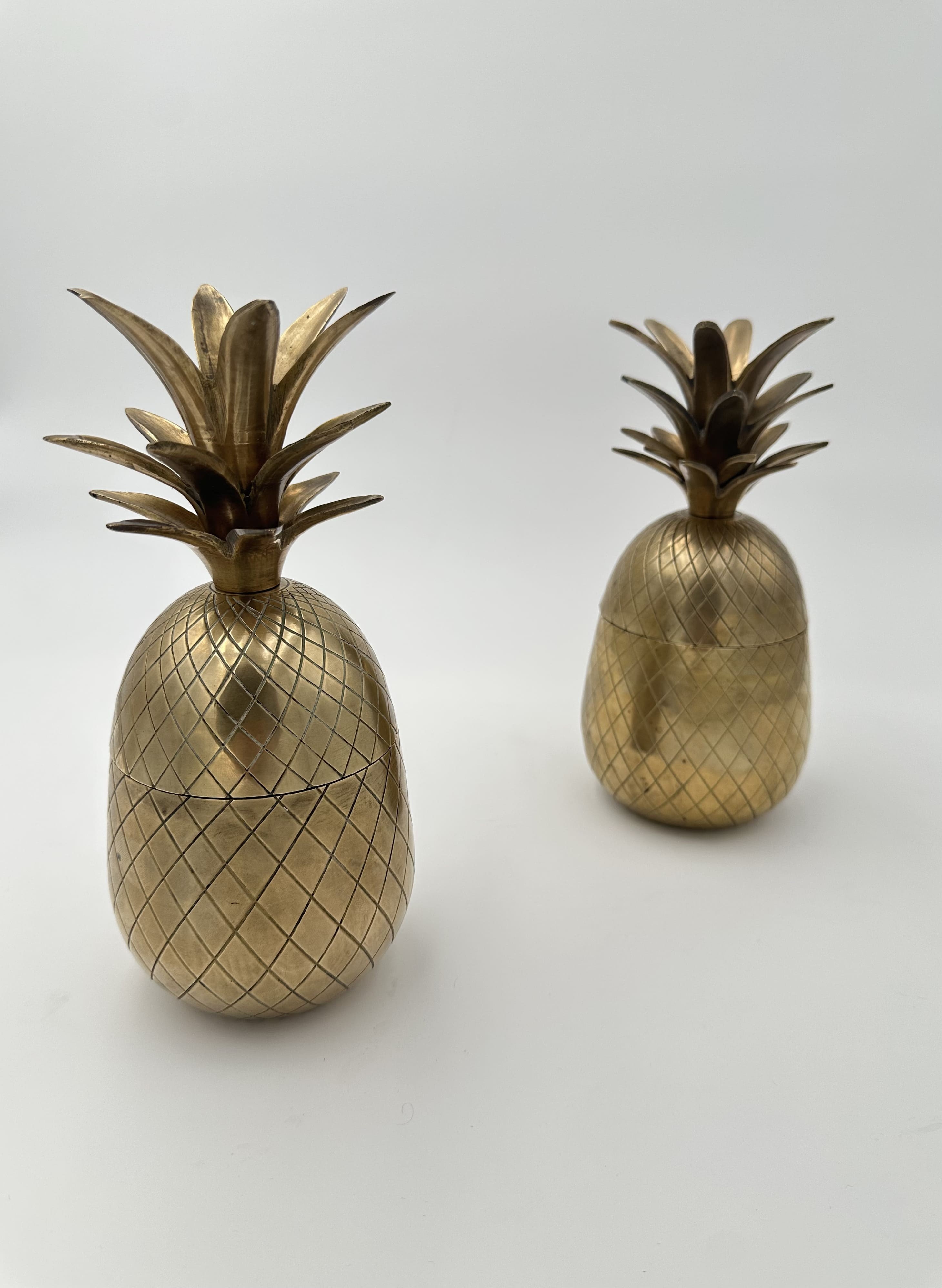 This pair of bar accessories belongs to the luxury metalwork and tableware of the 1970s. The structural design of each piece takes the shape of a pineapple, composed of two solid brass hemispheres that interlock at mid-height. The surface of the body is entirely chased with a geometric network (lozenge crosshatches) strictly imitating the texture of the fruit's rind. The upper section, serving as a removable lid, is crowned with an imposing tuft of serrated cast brass leaves.