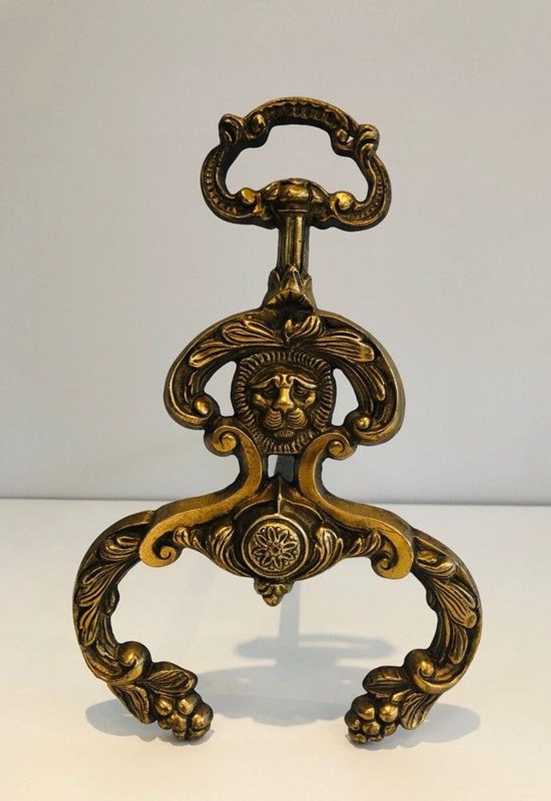 This handsome pair of bronze and wrought iron andirons, made in France around 1940, continues the long tradition of neoclassical revival bronzework that flourished in Parisian decorative arts from the Restauration onwards and found a renewed audience in the interwar period. Each piece is conceived as a tiered composition of extraordinary plasticity: at the base, two robust C-scroll acanthus volutes provide stability and visual weight; at the centre, a lion mascaron — its mane rendered in bold relief, its expression combining strength and decorative fantasy — serves as the focal ornament; and at the crown, a delicate arched handle with leafy scrollwork completes the vertical rhythm.