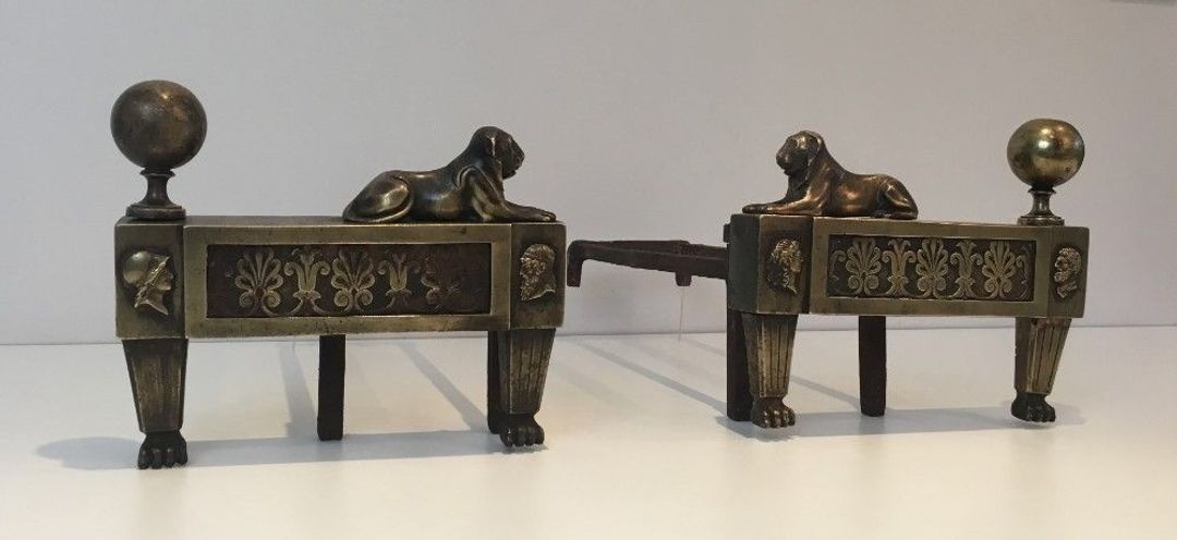 Pair of Empire-Period Bronze Andirons with Recumbent Lions, France, circa 1850
