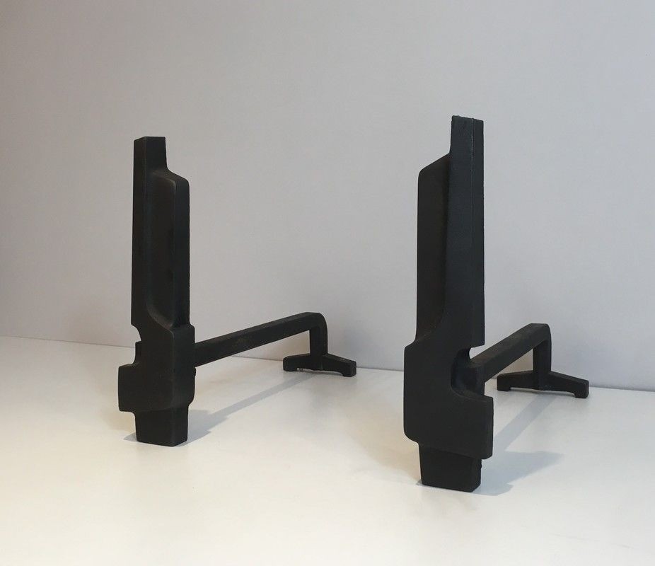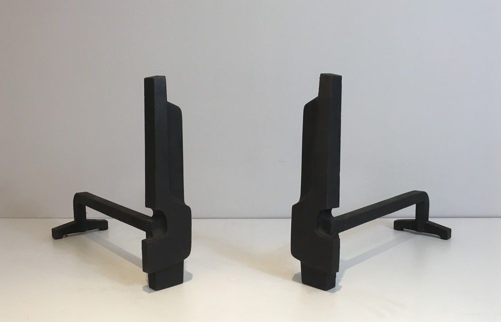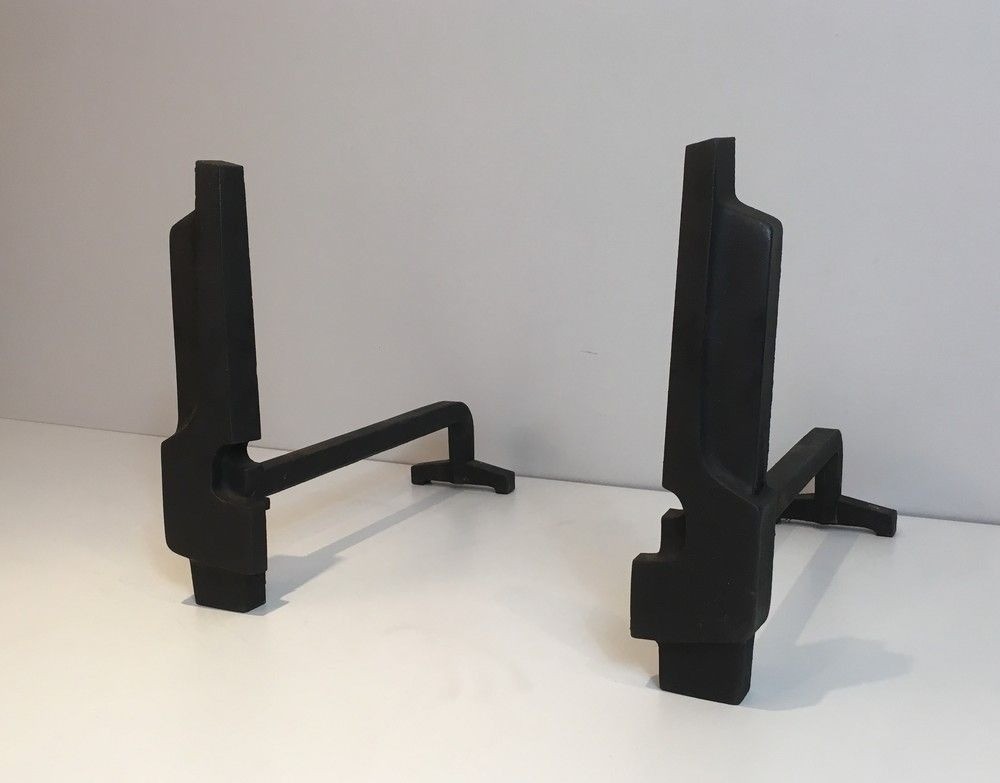 This striking pair of andirons is executed in cast iron and wrought iron, combining the weight and solidity of cast metal with the suppler, sculptural potential of forged iron. The forms are boldly geometric, stripped of all historical ornament in favour of a vocabulary of pure abstraction that speaks directly to the modernist movement and its conviction that beauty resides in structure rather than decoration. The proportions are powerful, the silhouettes clean and assured — objects conceived not merely to support logs in a grate but to be seen and admired.