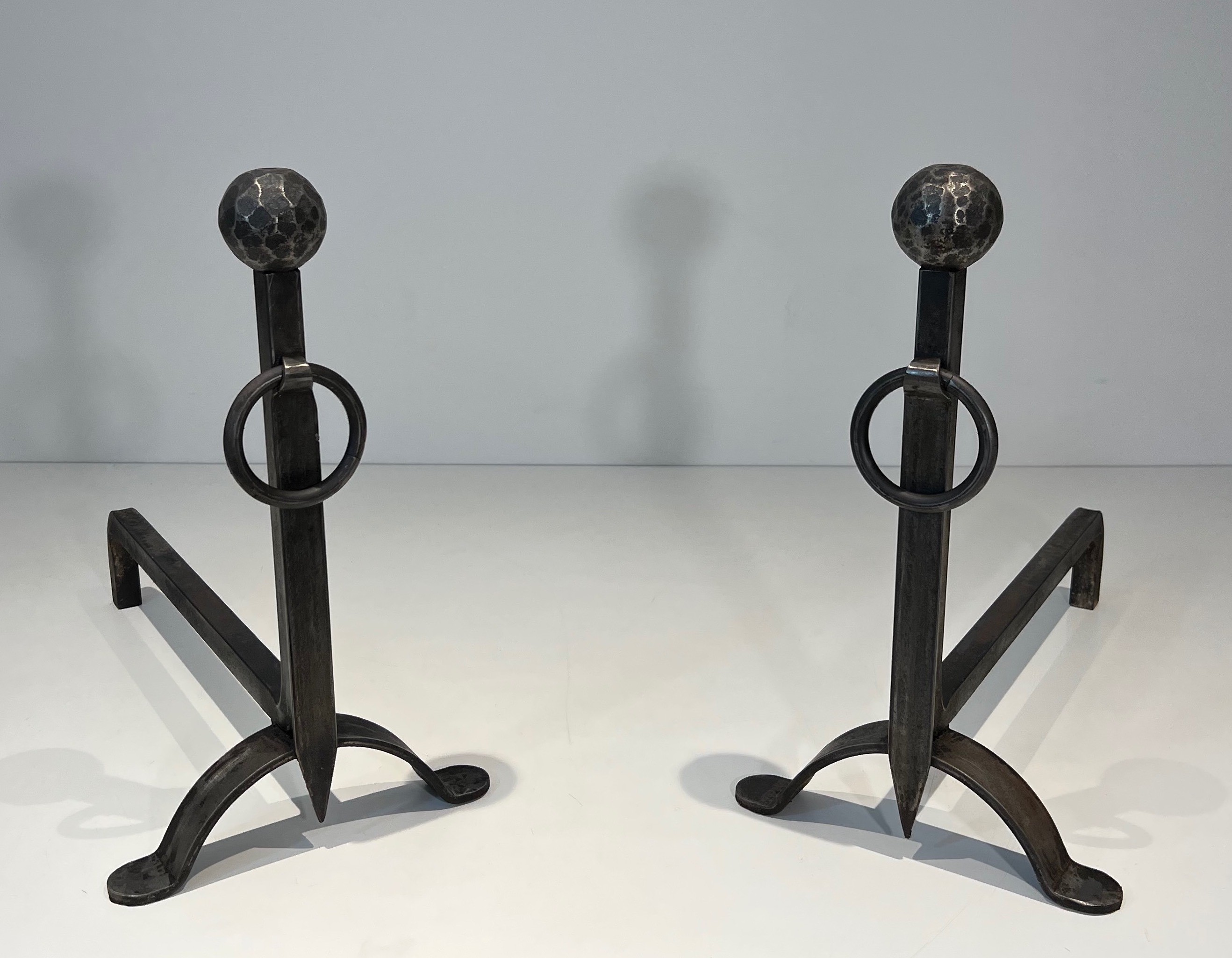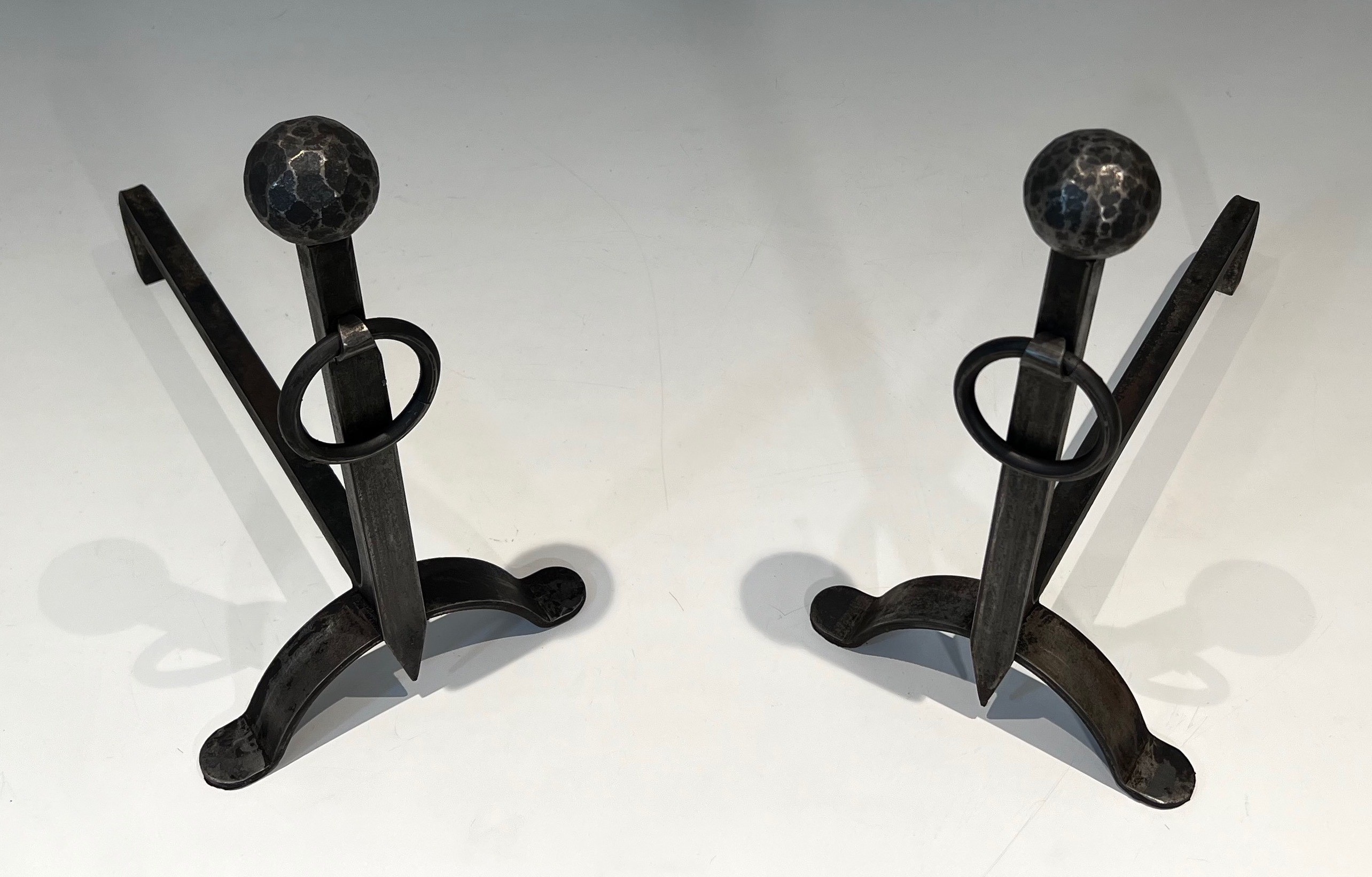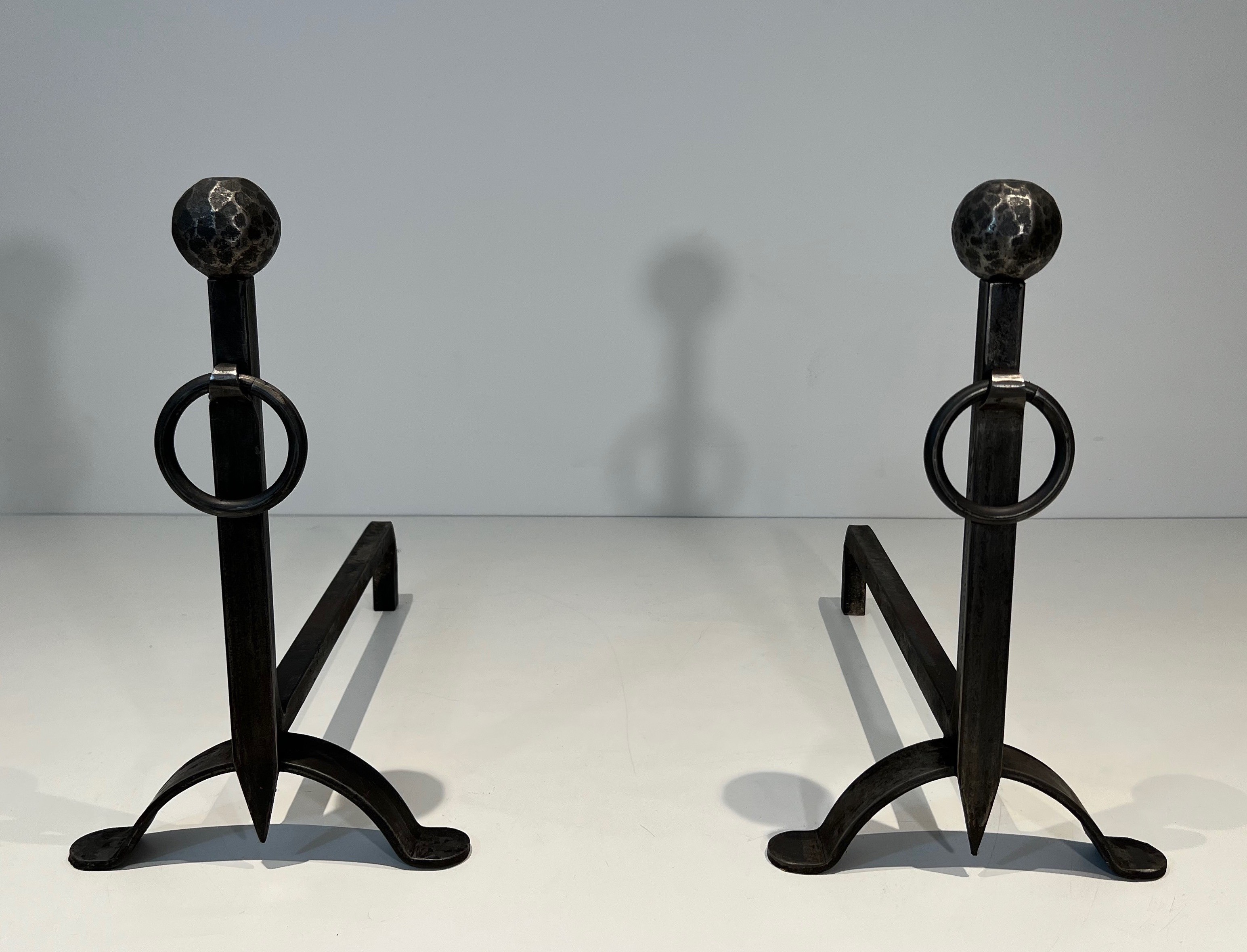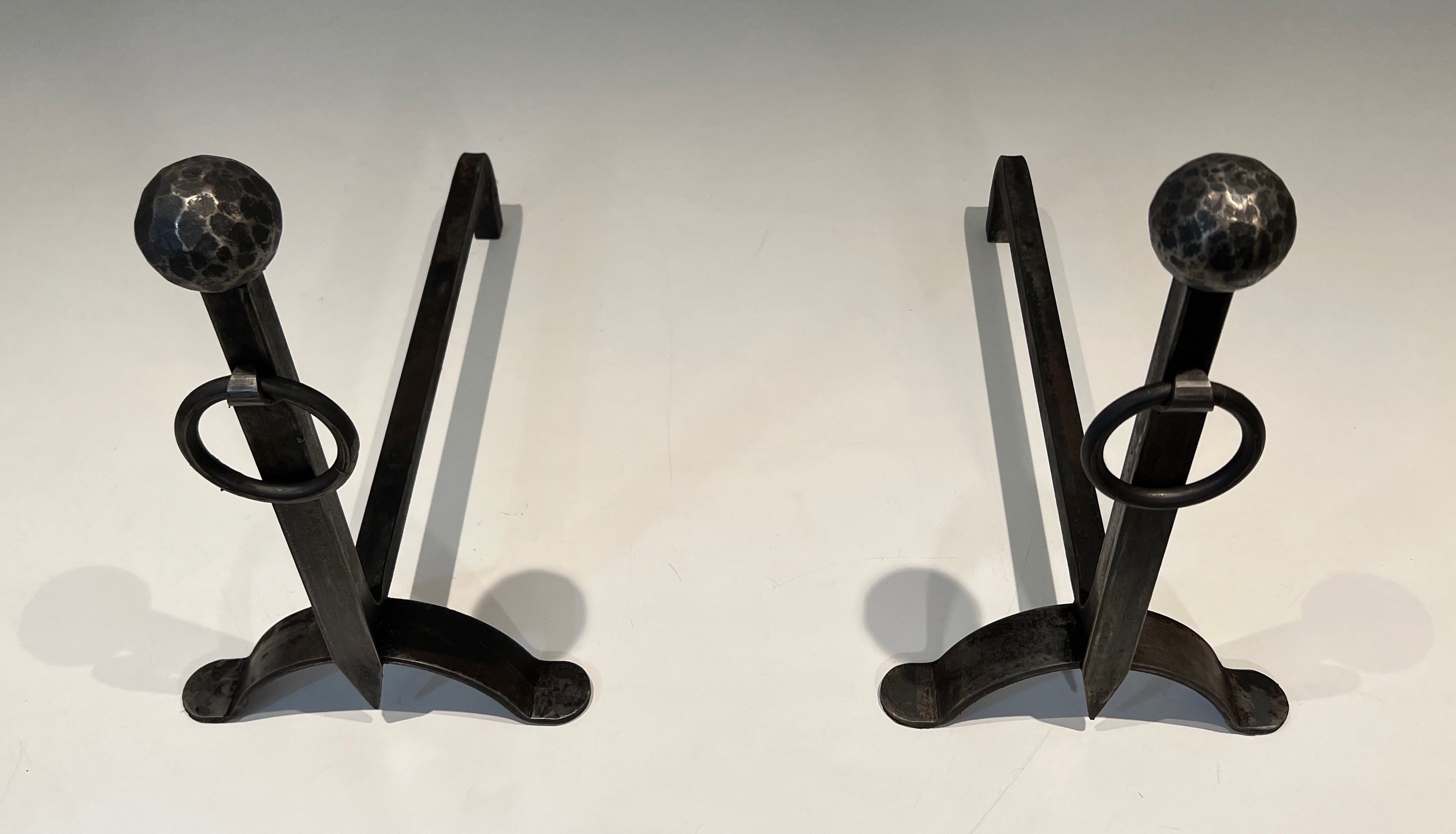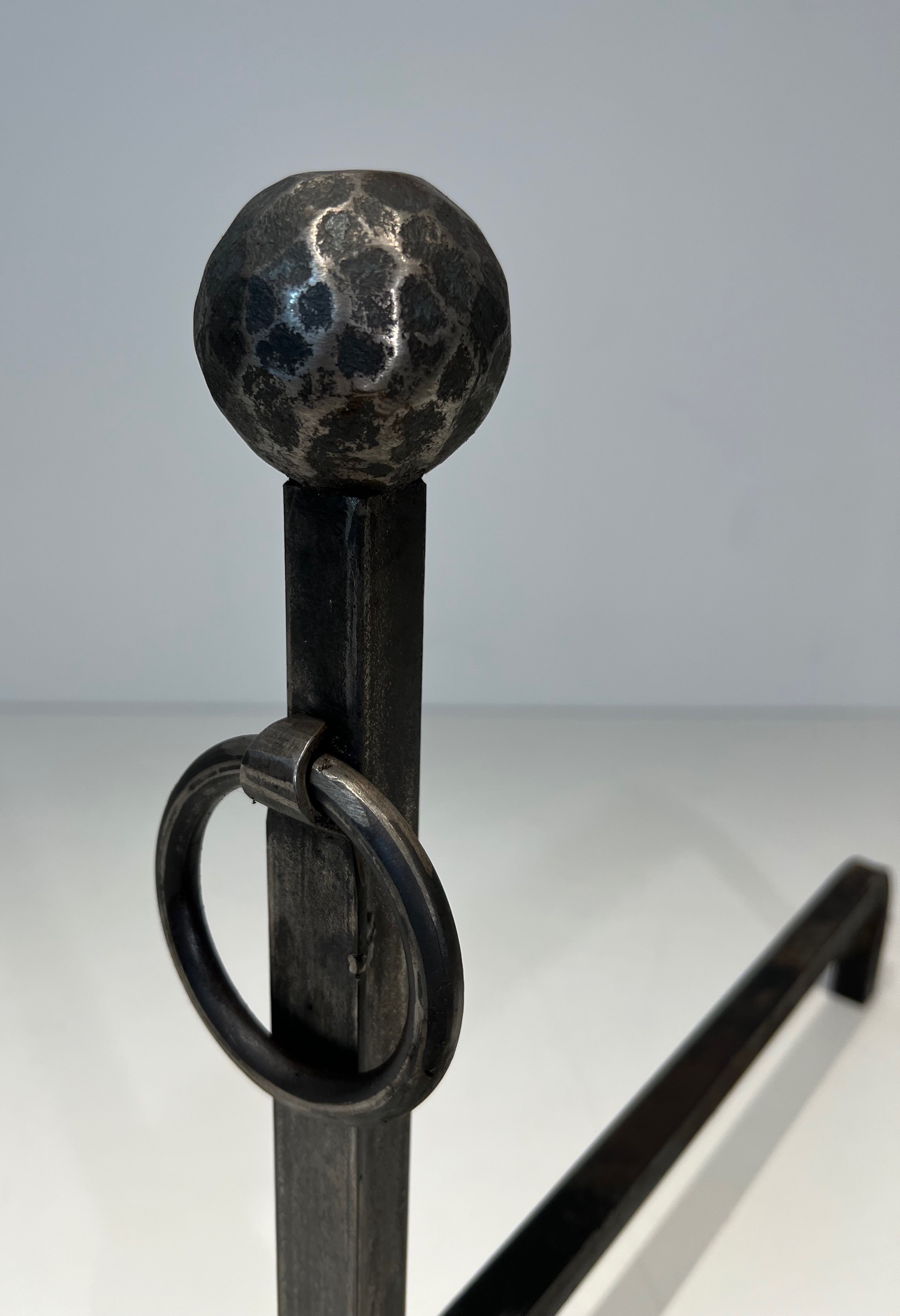 These andirons would bring a note of handmade authenticity and artisanal dignity to any fireplace. The hammered texture is particularly beautiful in firelight, the faceted surface catching the dancing flames and casting shifting shadows across the metal. A pair of great character and presence for the collector who values craft above decoration.