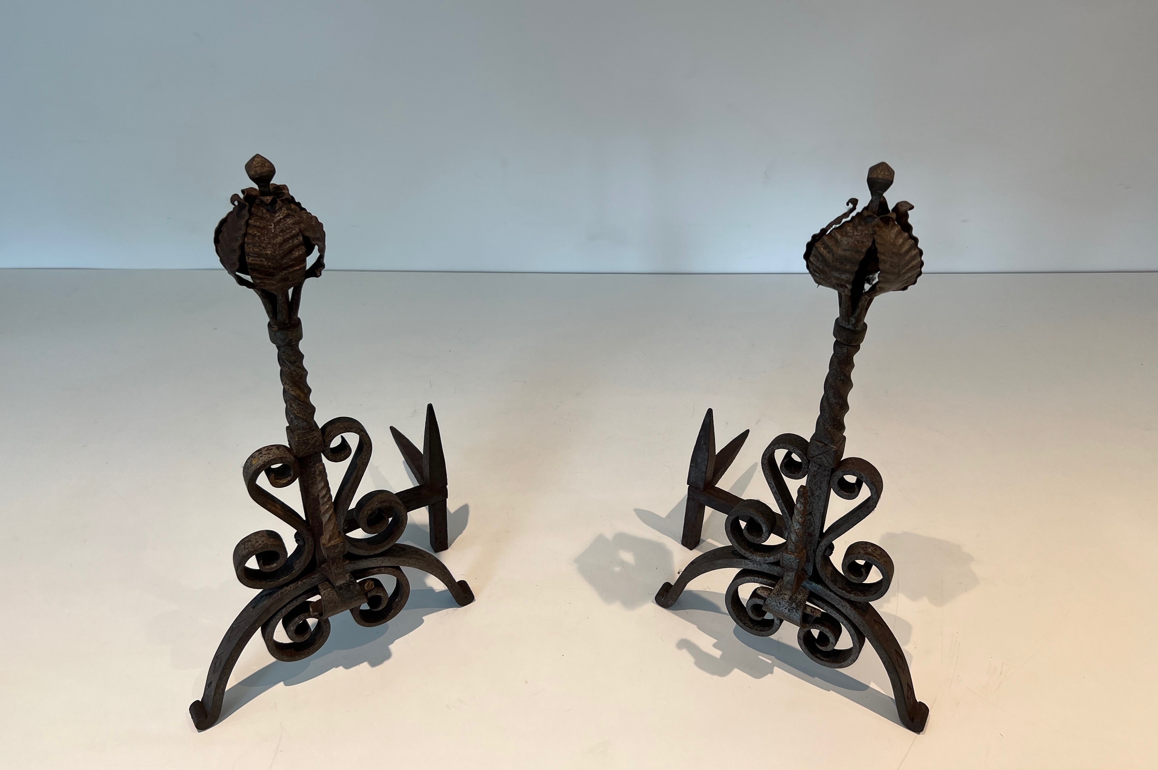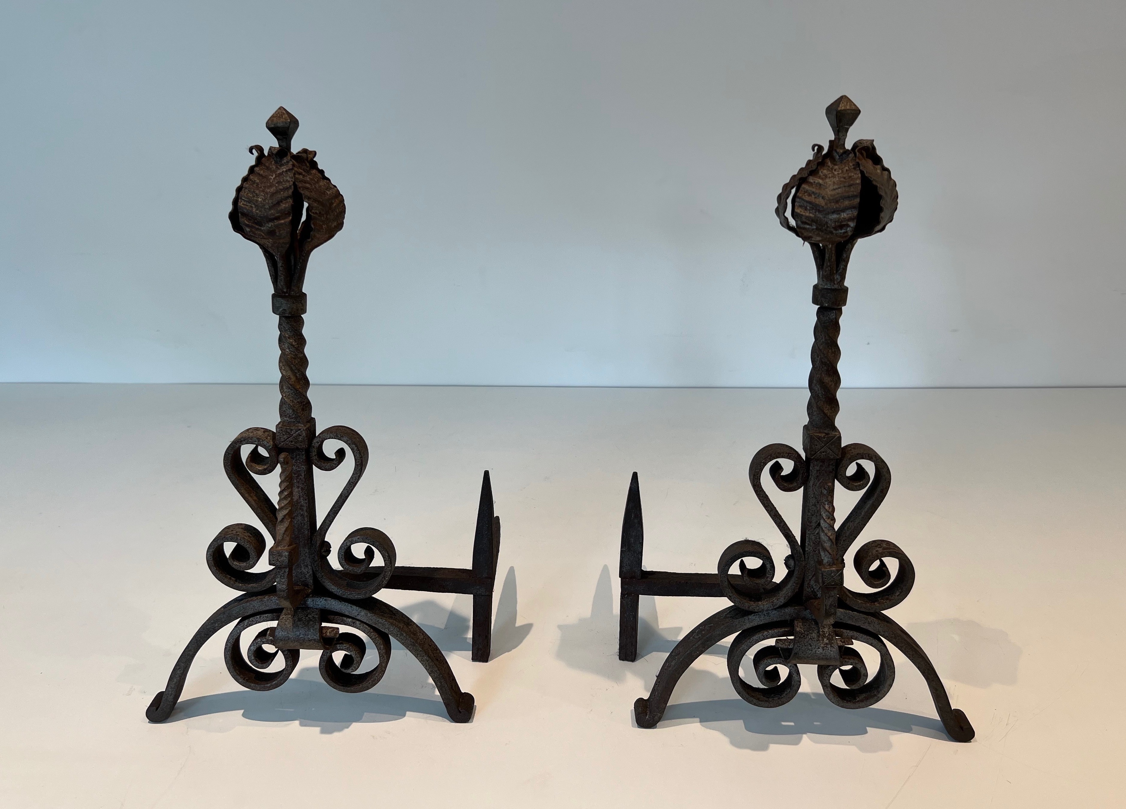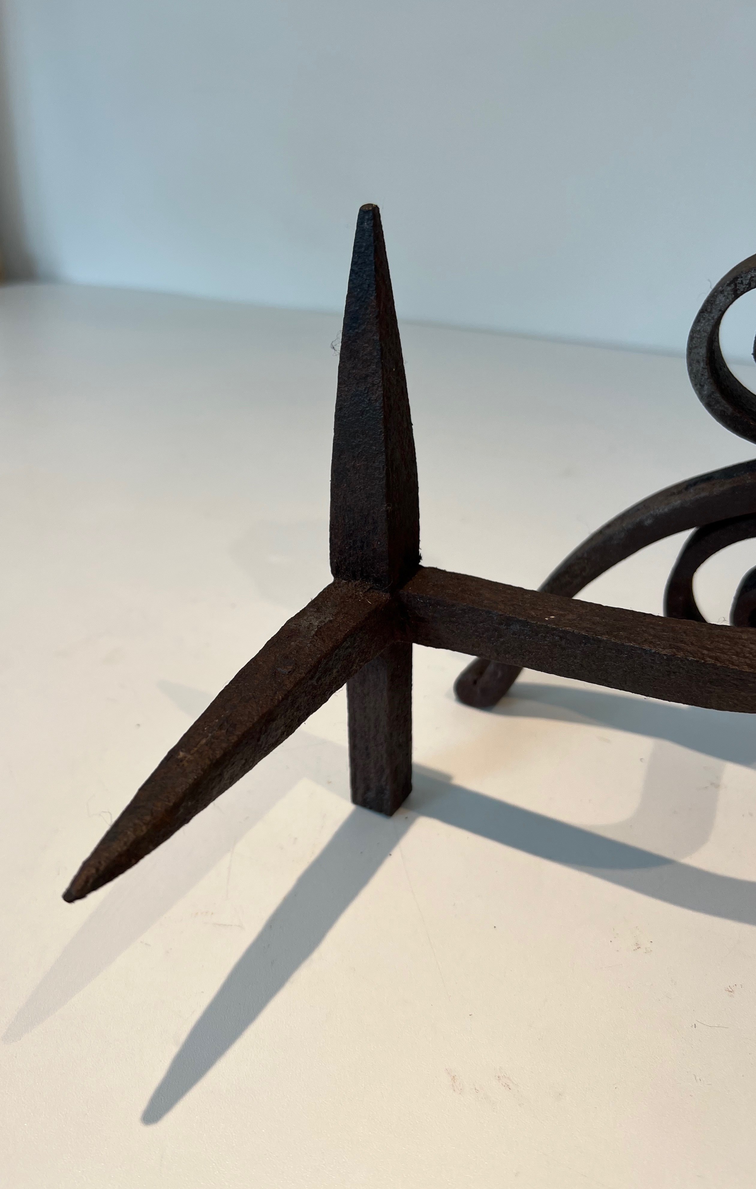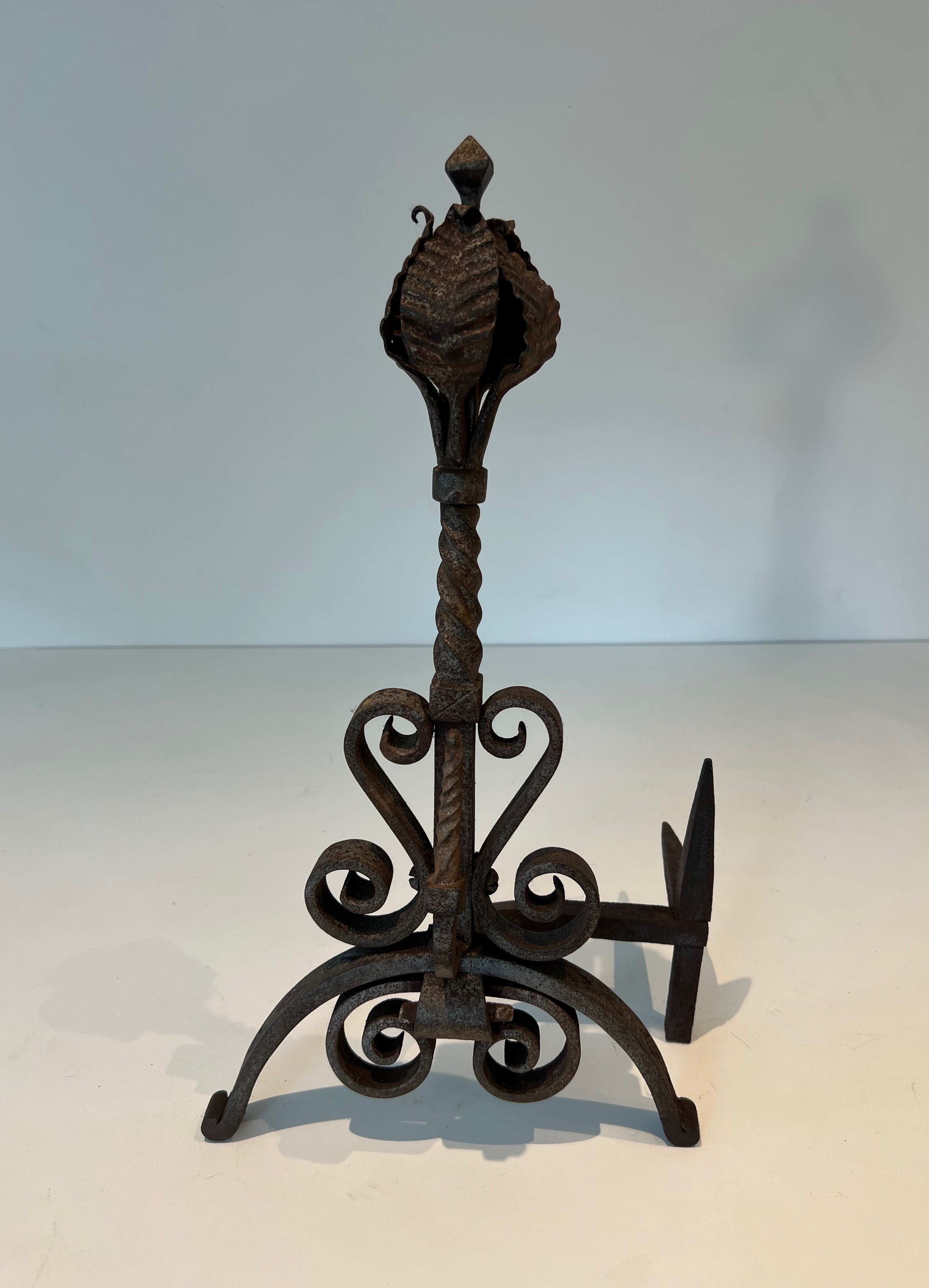 Wrought iron andirons of this decorative type were produced in significant numbers in France during the Belle Époque, a period that saw an extraordinary revival of interest in fine metalwork driven by the Art Nouveau movement and its celebration of natural forms. The great French ironworkers of this era — drawing on the traditions of the medieval and Renaissance forge while embracing the organic vocabulary of the new style — produced fireplace accessories and architectural metalwork of exceptional quality, much of which remains highly sought after today. Pieces decorated with foliage and scrolls in this manner embody the finest tendencies of the period.