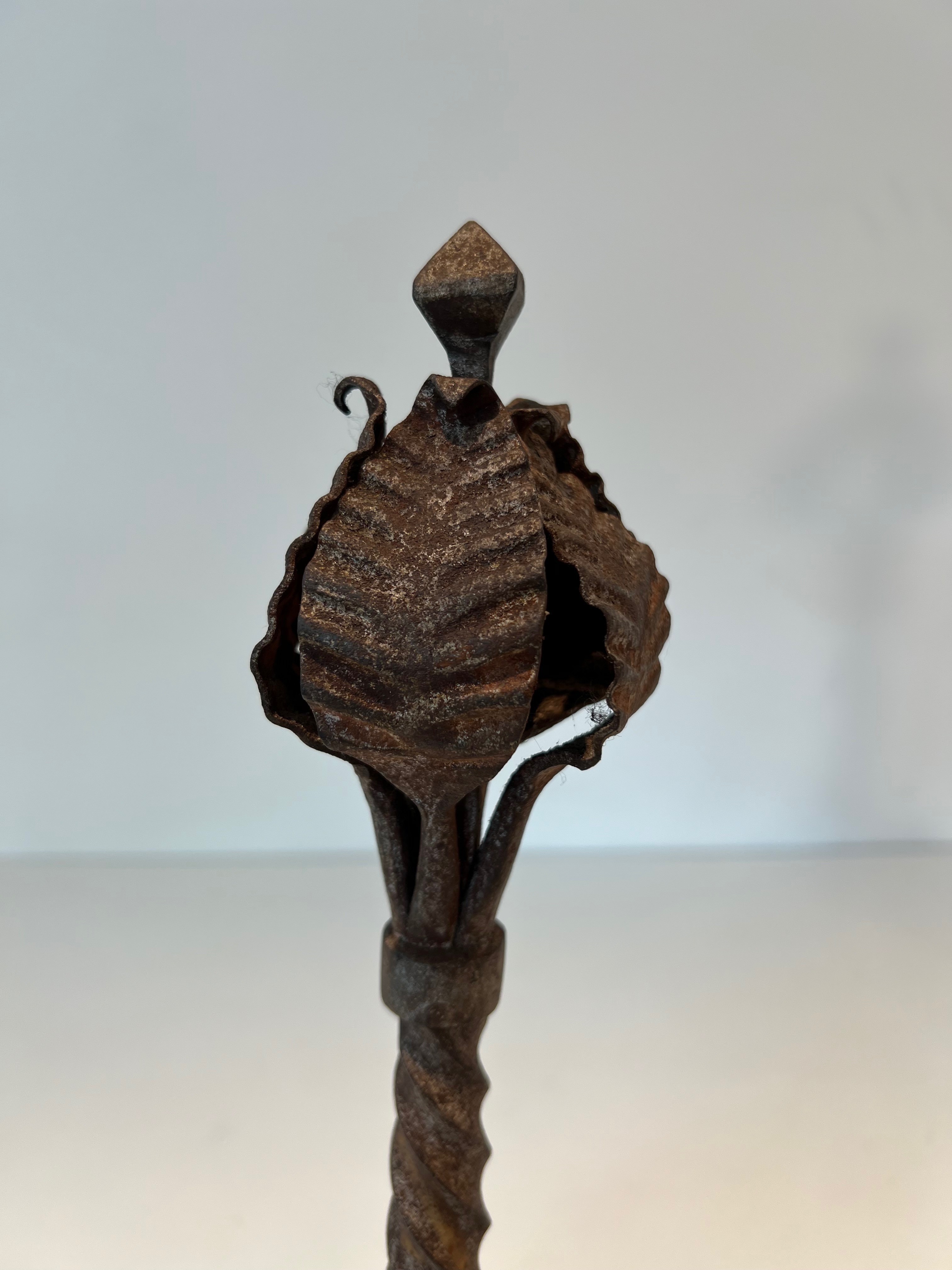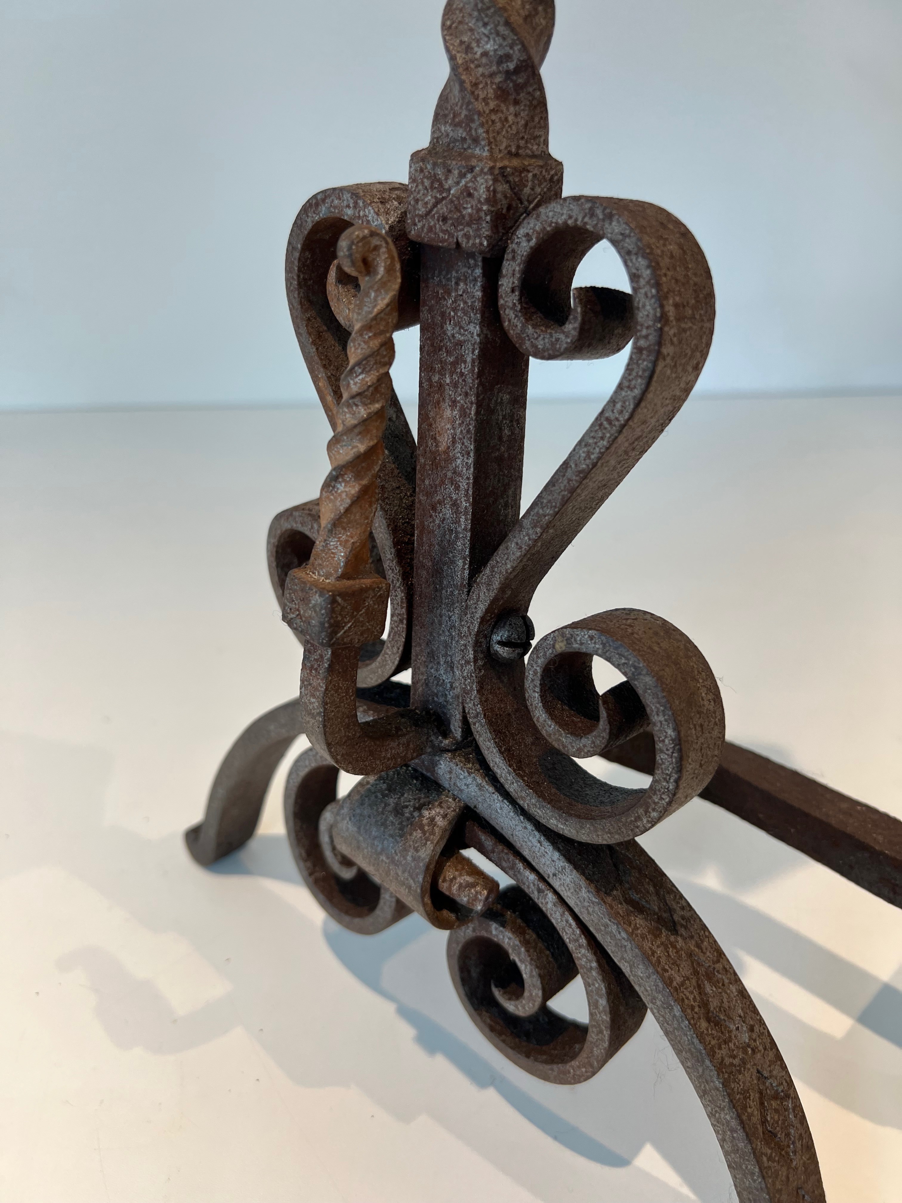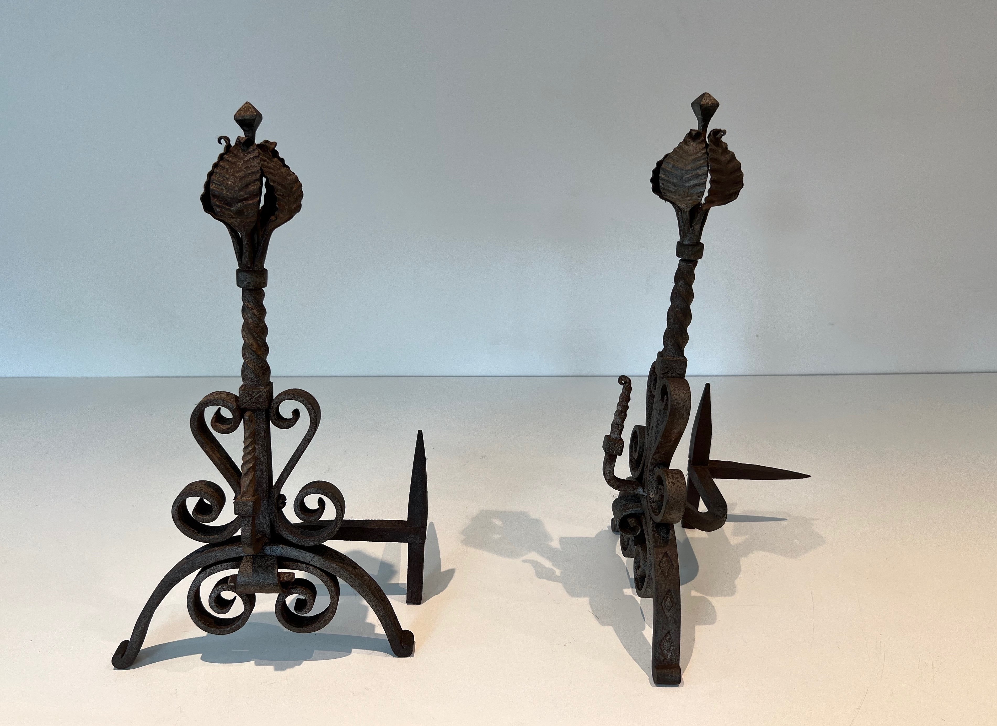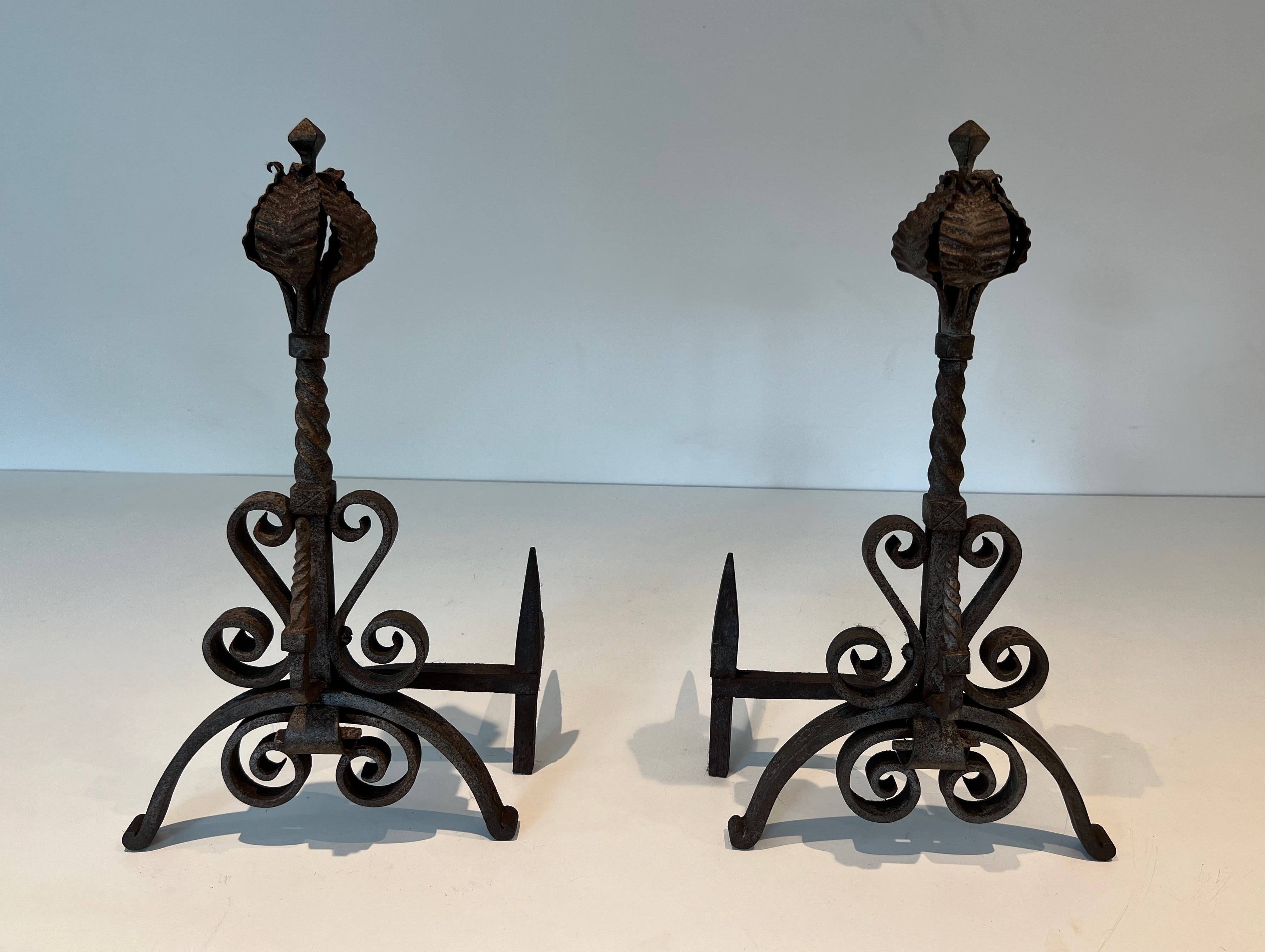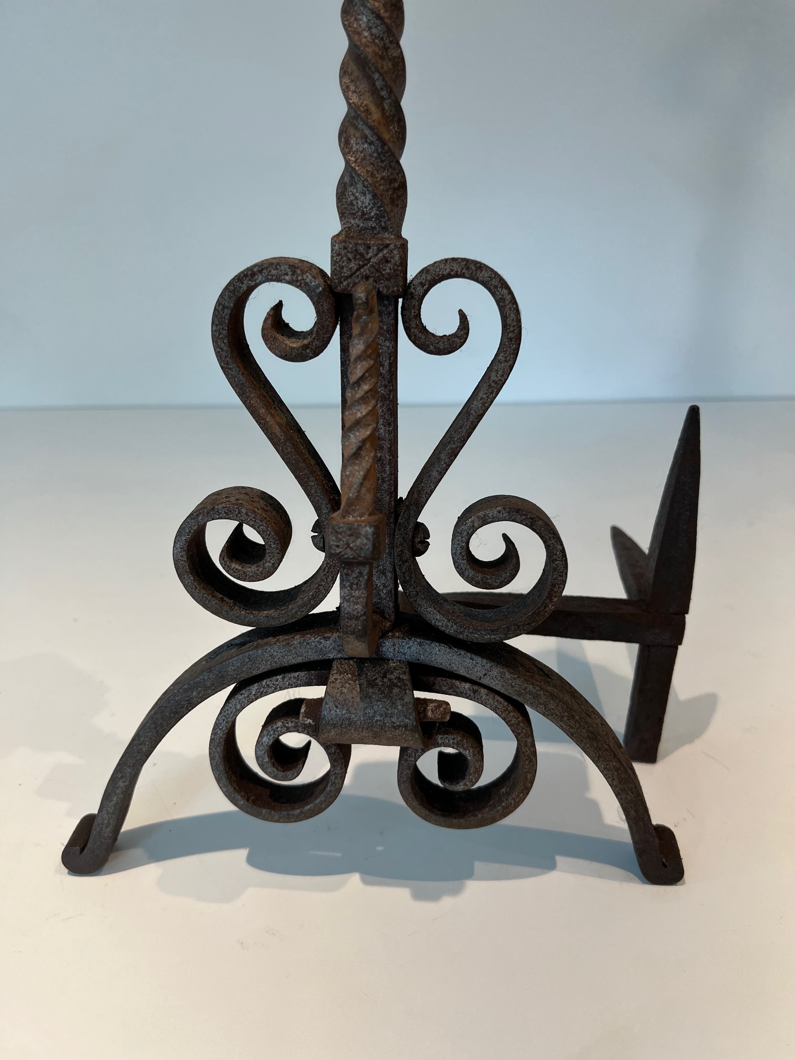 Wrought iron andirons of this decorative type were produced in significant numbers in France during the Belle Époque, a period that saw an extraordinary revival of interest in fine metalwork driven by the Art Nouveau movement and its celebration of natural forms. The great French ironworkers of this era — drawing on the traditions of the medieval and Renaissance forge while embracing the organic vocabulary of the new style — produced fireplace accessories and architectural metalwork of exceptional quality, much of which remains highly sought after today. Pieces decorated with foliage and scrolls in this manner embody the finest tendencies of the period.
