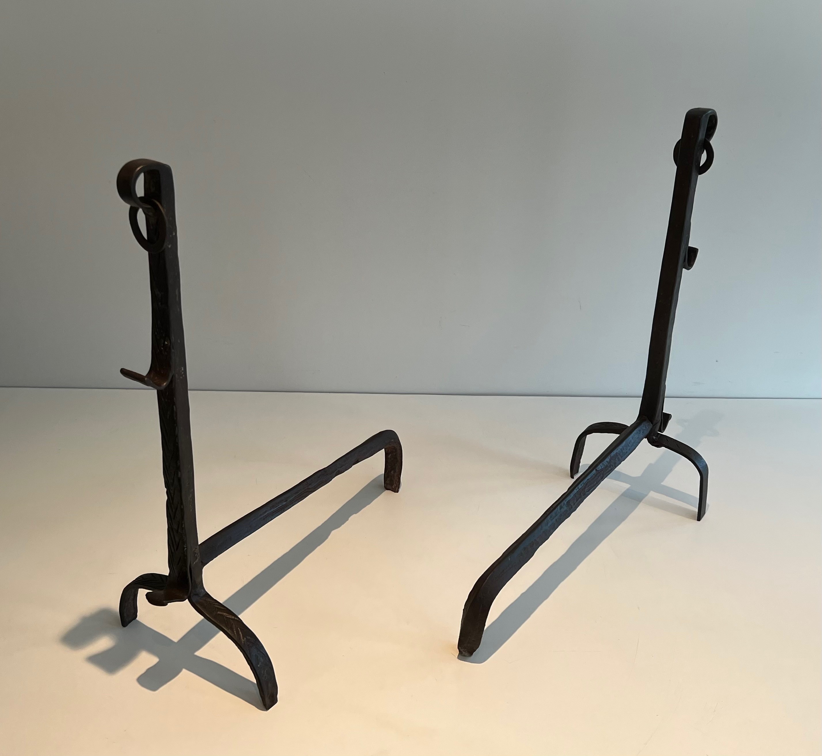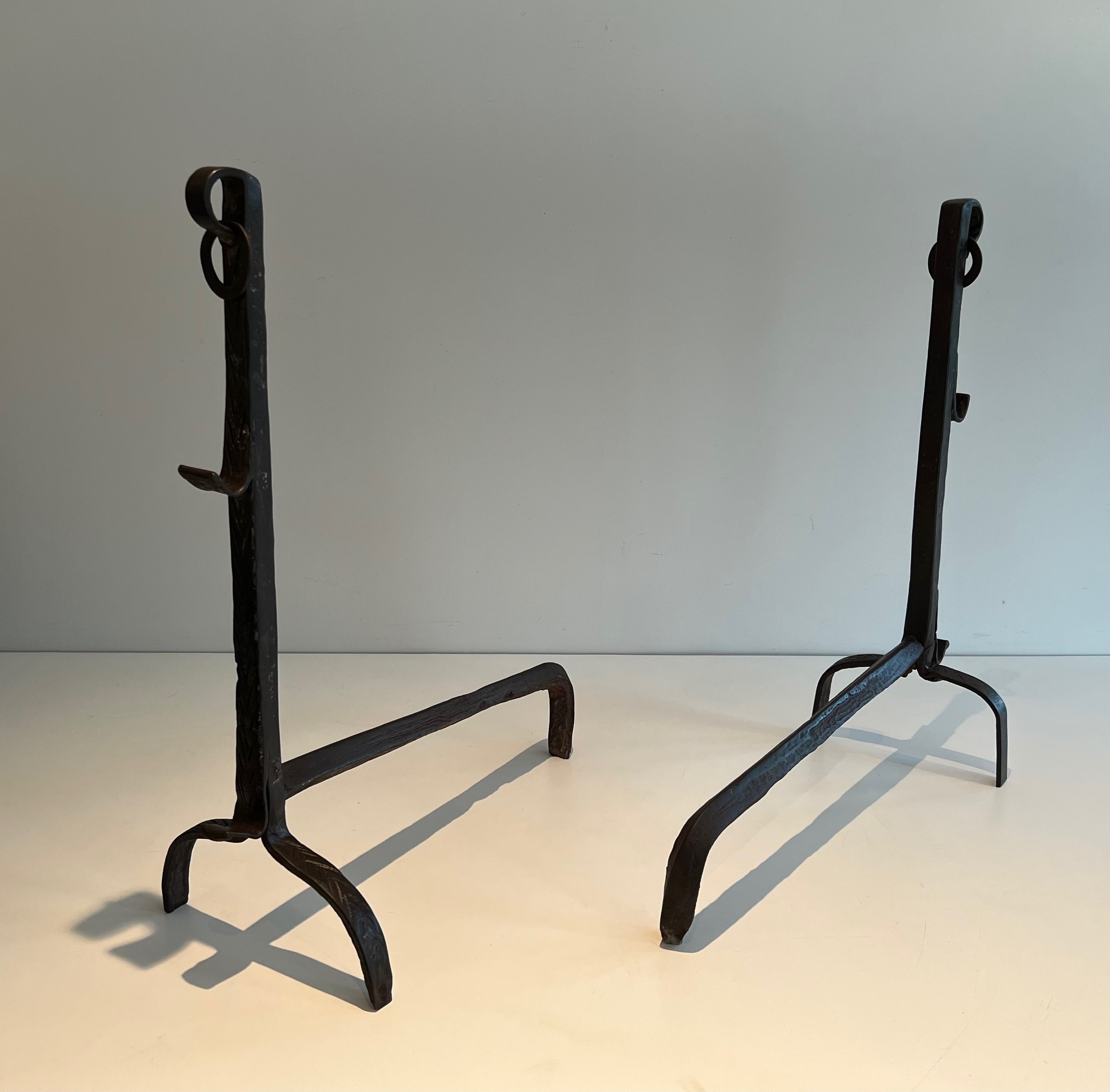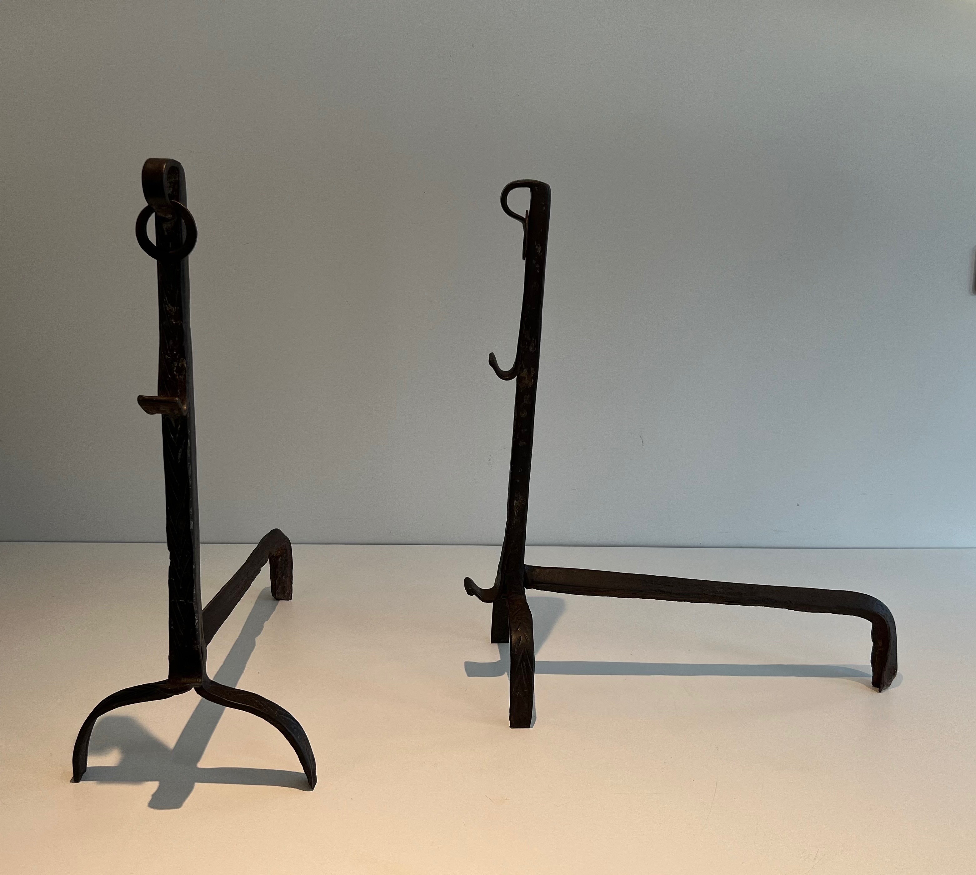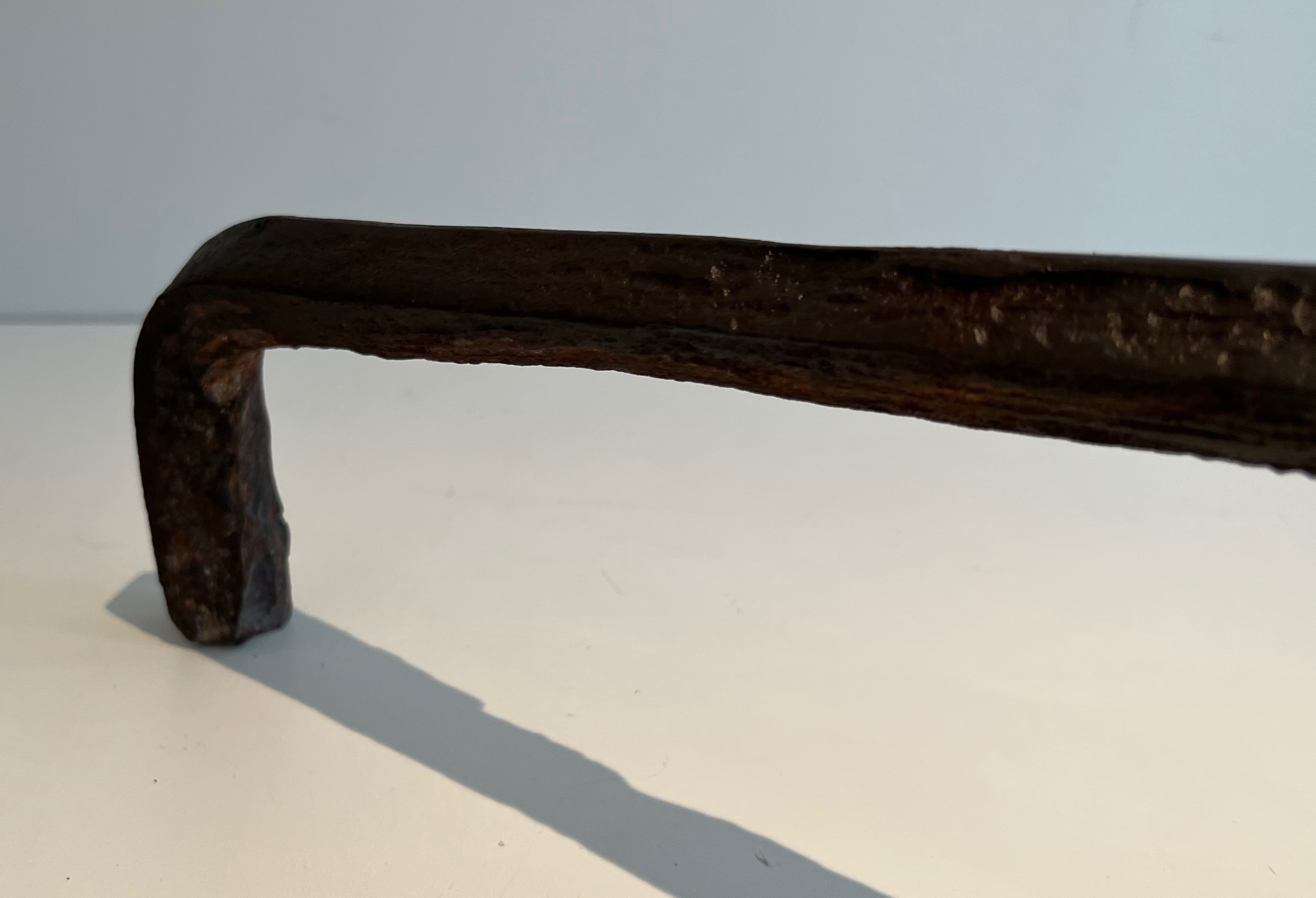 A pair of landiers of this age and quality transcends utility to become a work of decorative art in its own right. They would bring historical gravitas and tactile beauty to a large fireplace — whether in a country house, a converted barn, or a salon that appreciates the patina of authentic period ironwork. An exceptional acquisition for the collector of French decorative metalwork and vernacular antiques.