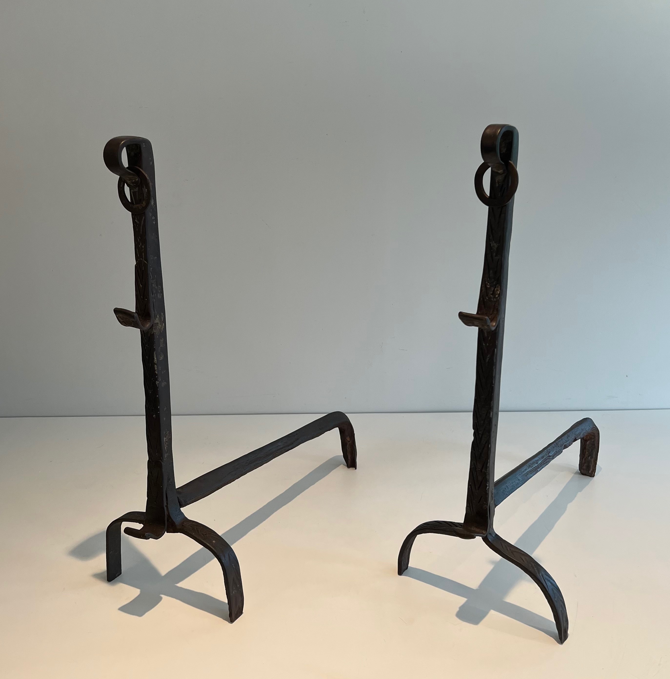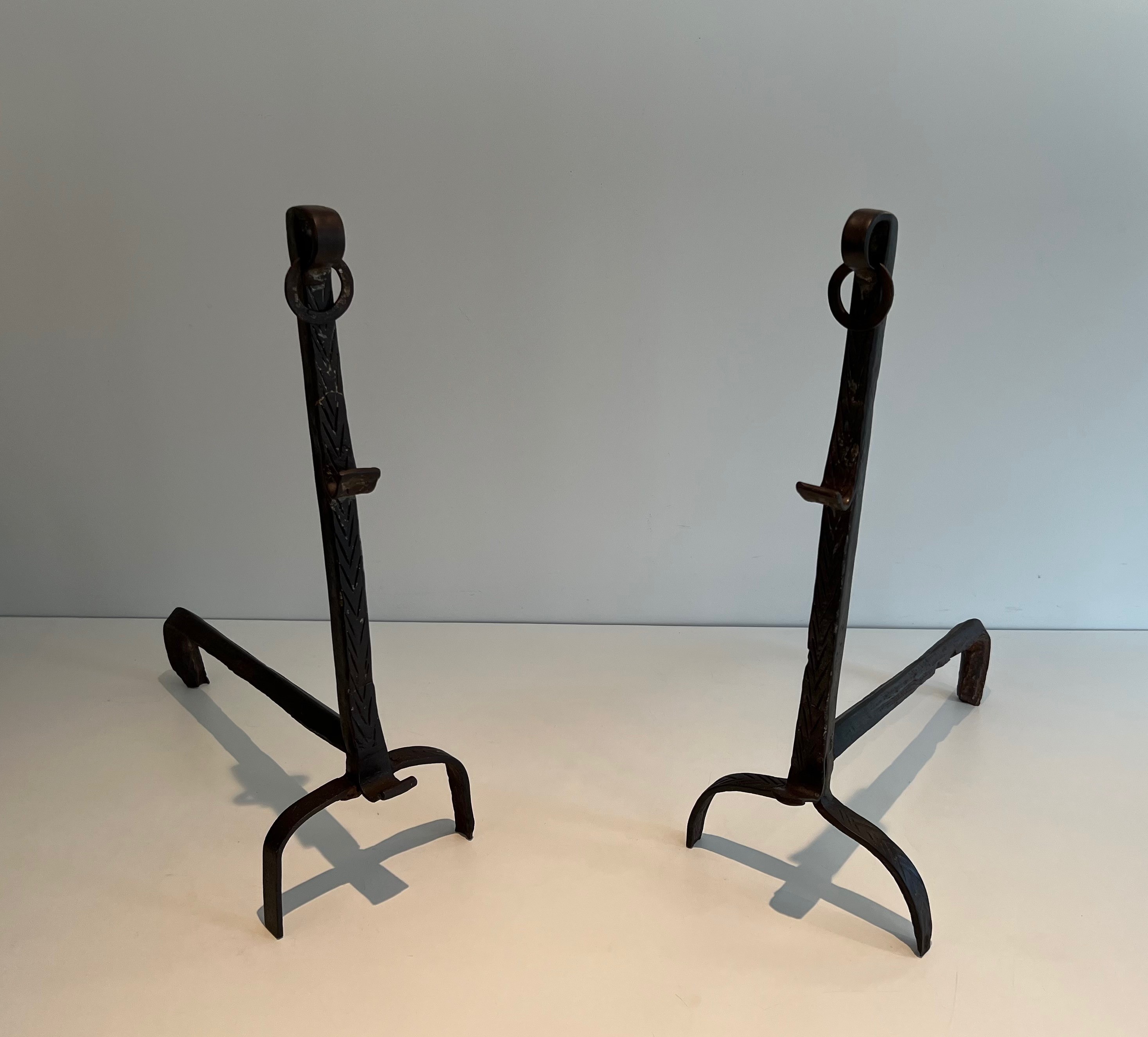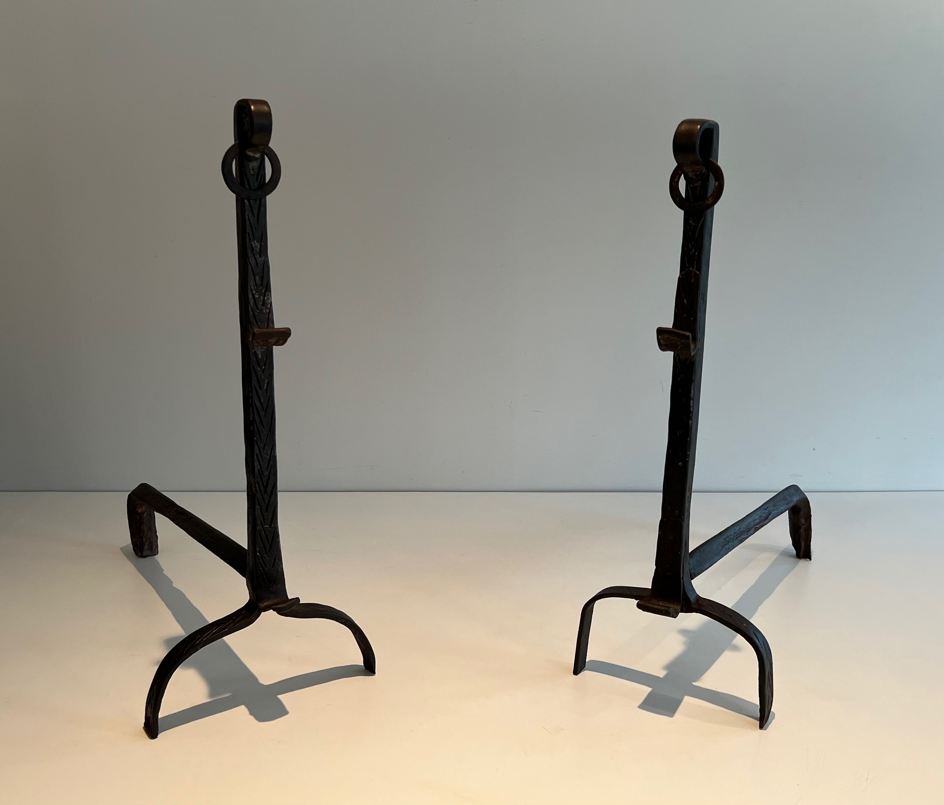 A pair of landiers of this age and quality transcends utility to become a work of decorative art in its own right. They would bring historical gravitas and tactile beauty to a large fireplace — whether in a country house, a converted barn, or a salon that appreciates the patina of authentic period ironwork. An exceptional acquisition for the collector of French decorative metalwork and vernacular antiques.
