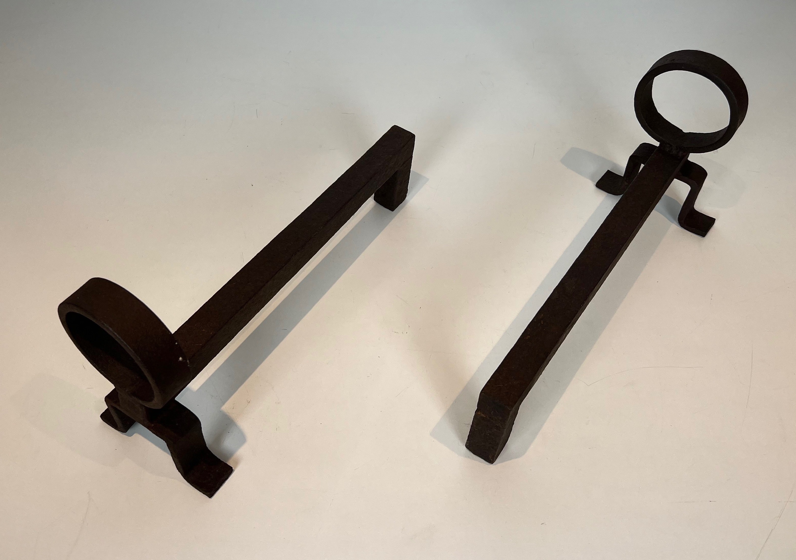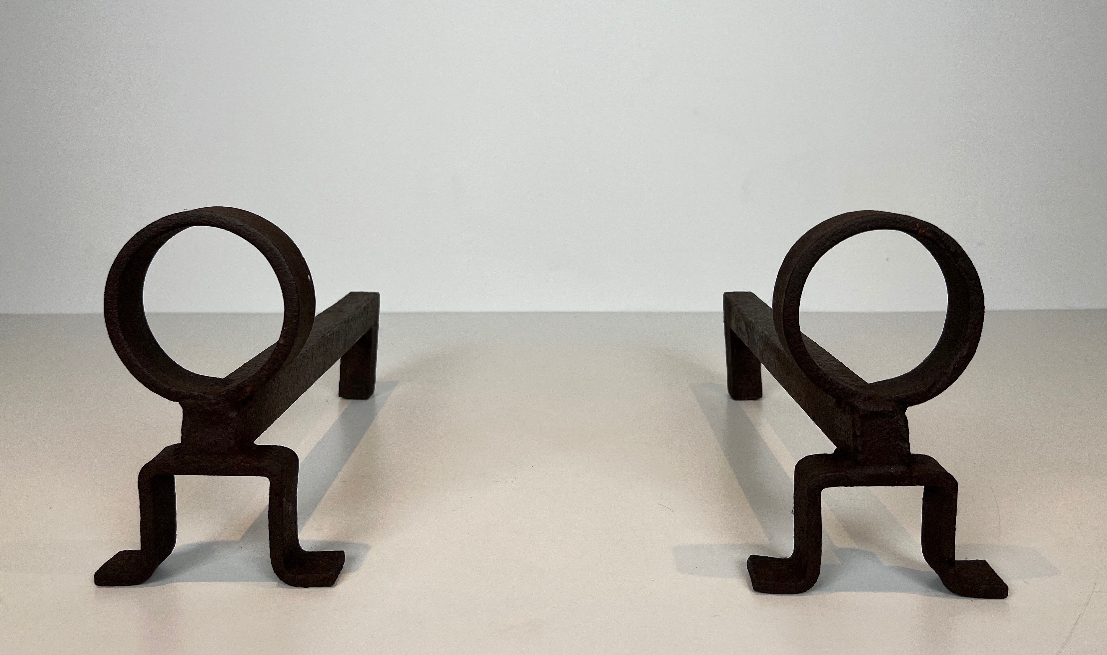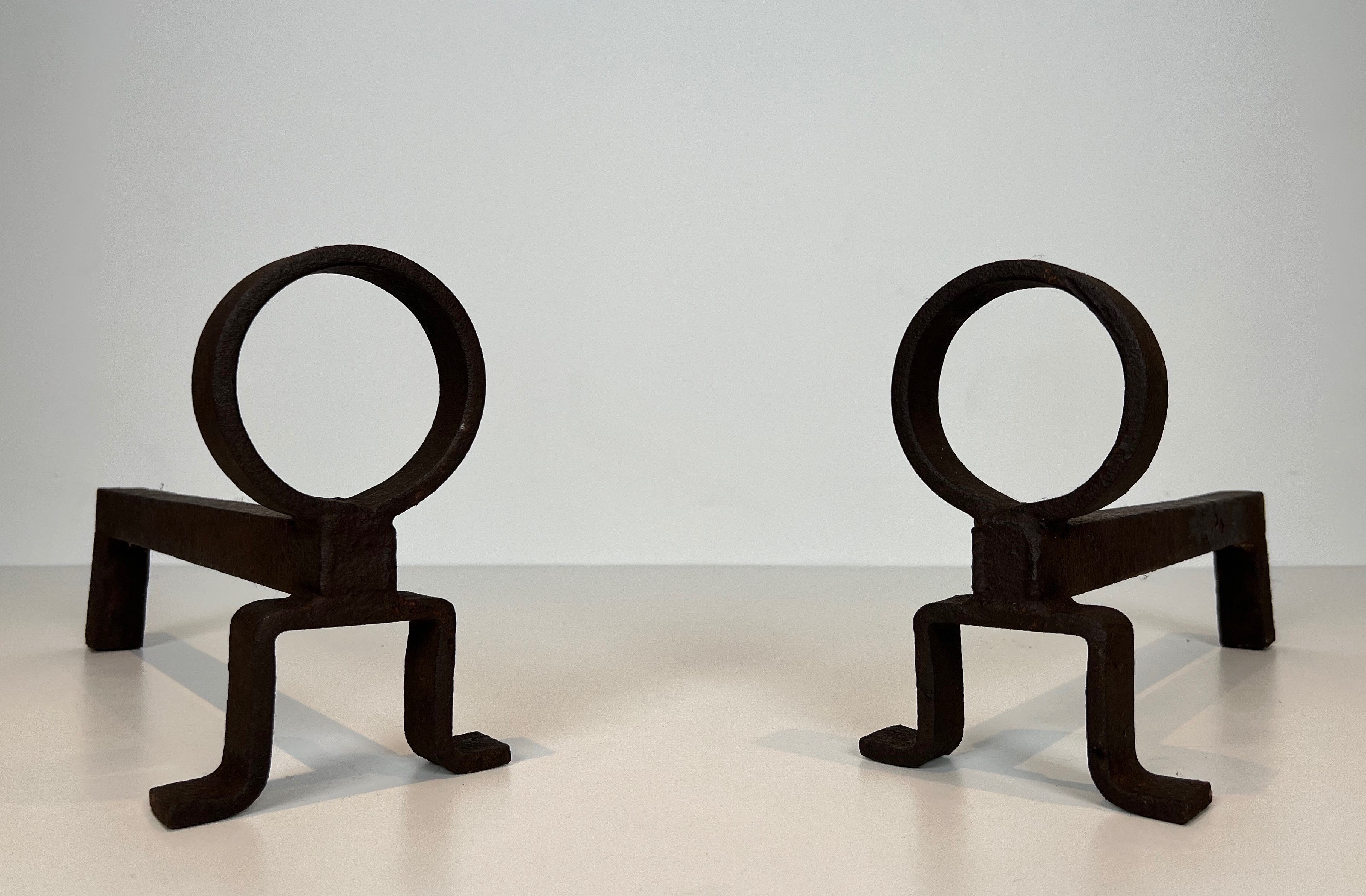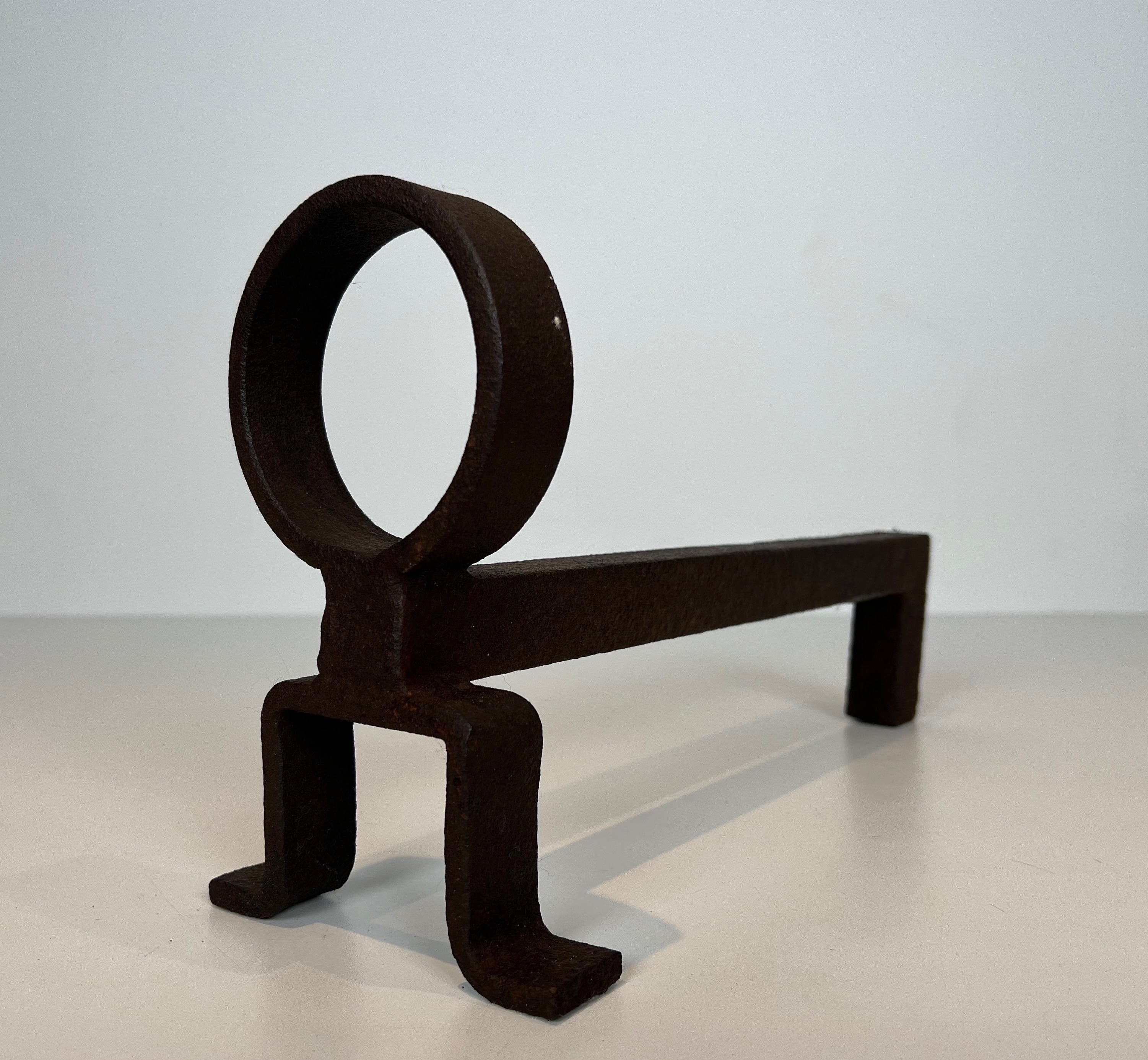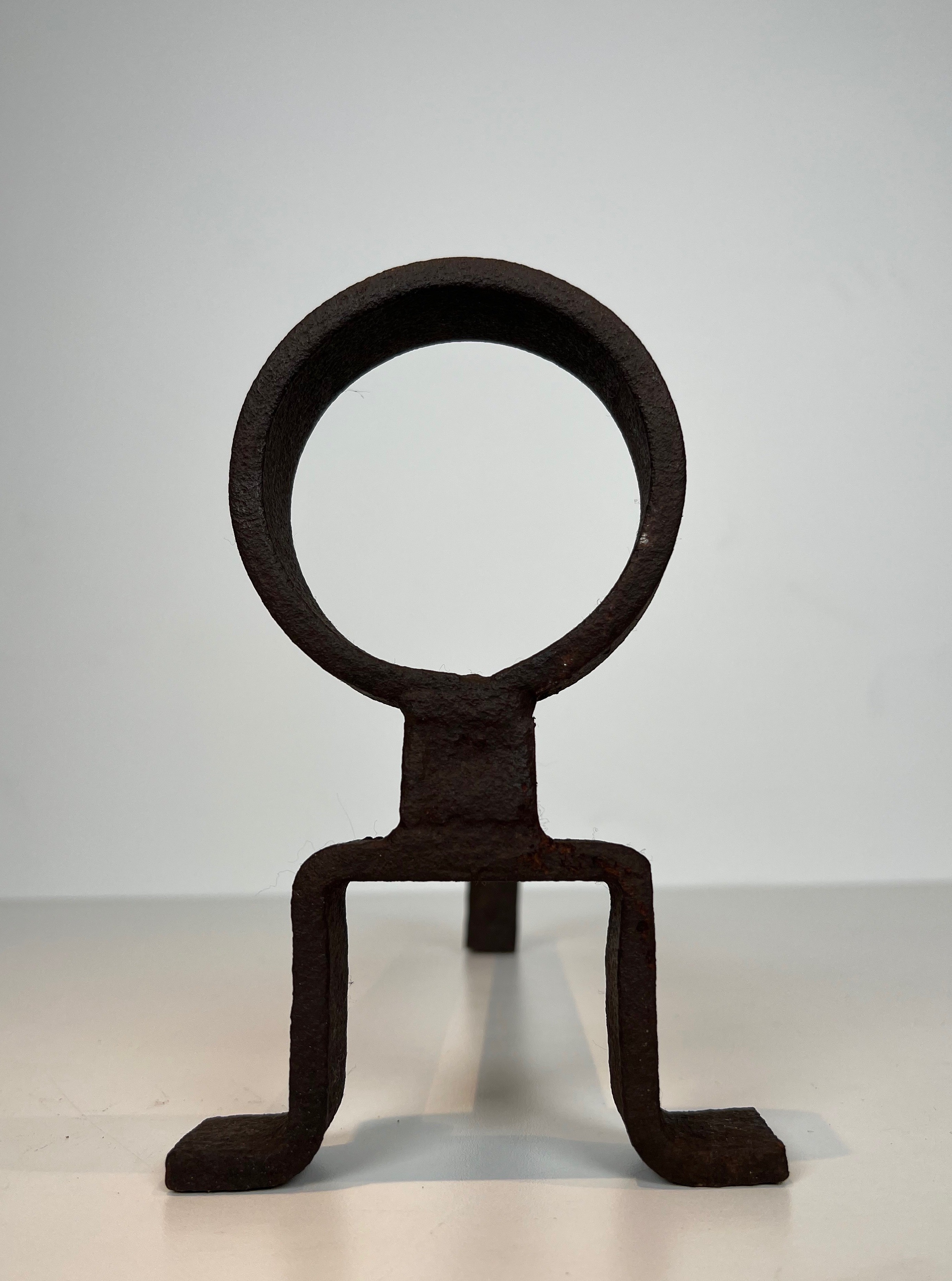 This compelling pair of andirons is fashioned from wrought iron in a modernist idiom that embraces sculptural form over historical precedent. Each andiron exhibits a fluidity and organic energy characteristic of the finest French blacksmithing of the 1950s, the iron worked to suggest movement and vitality rather than mere structural function. The overall composition is bold yet refined, the dark patina of the metal lending the pair an almost totemic presence when set before an open fire.