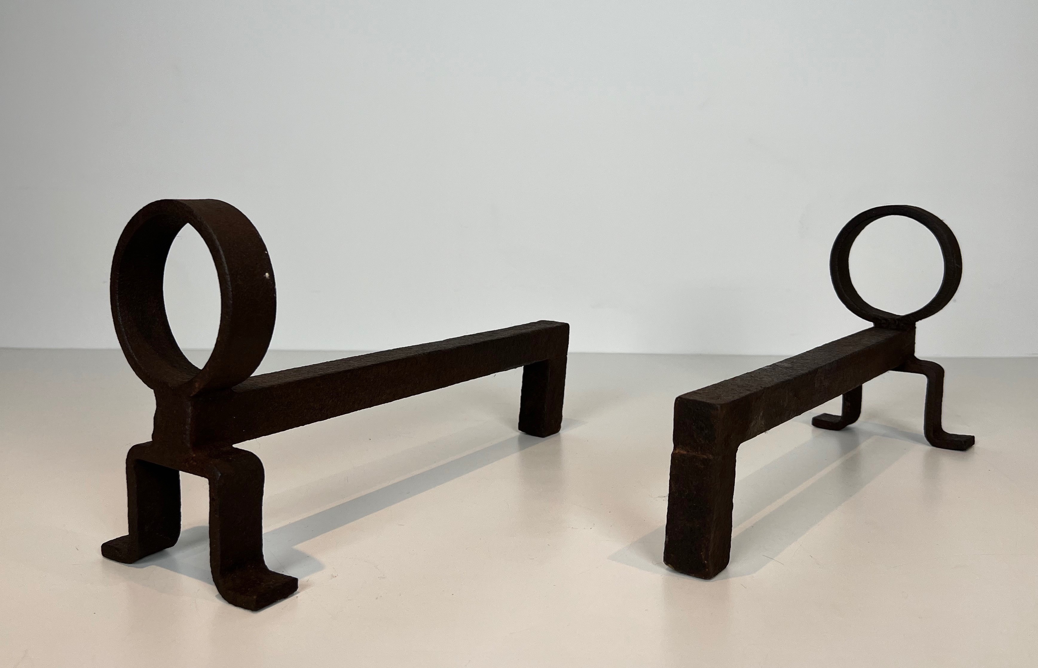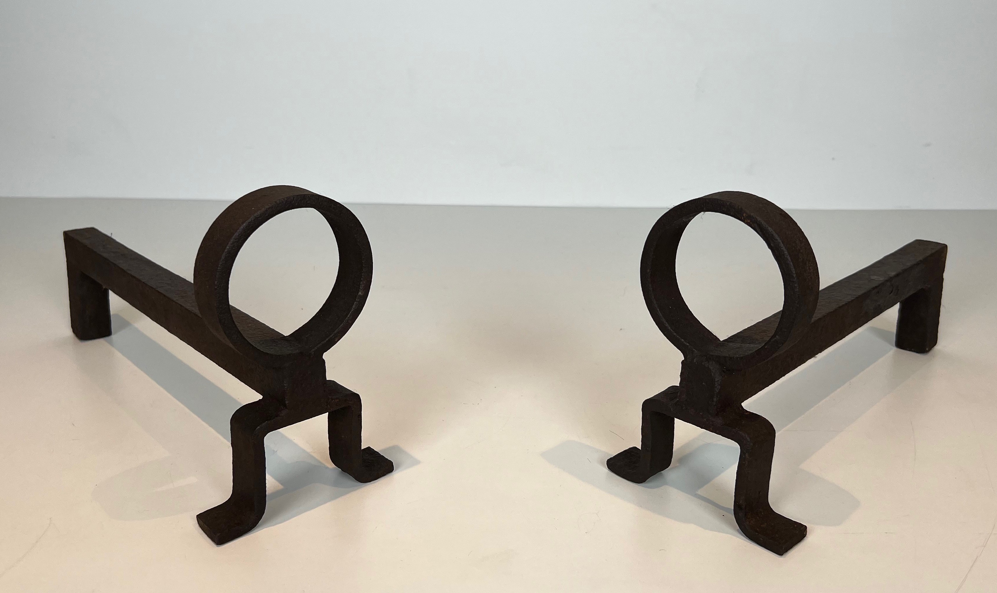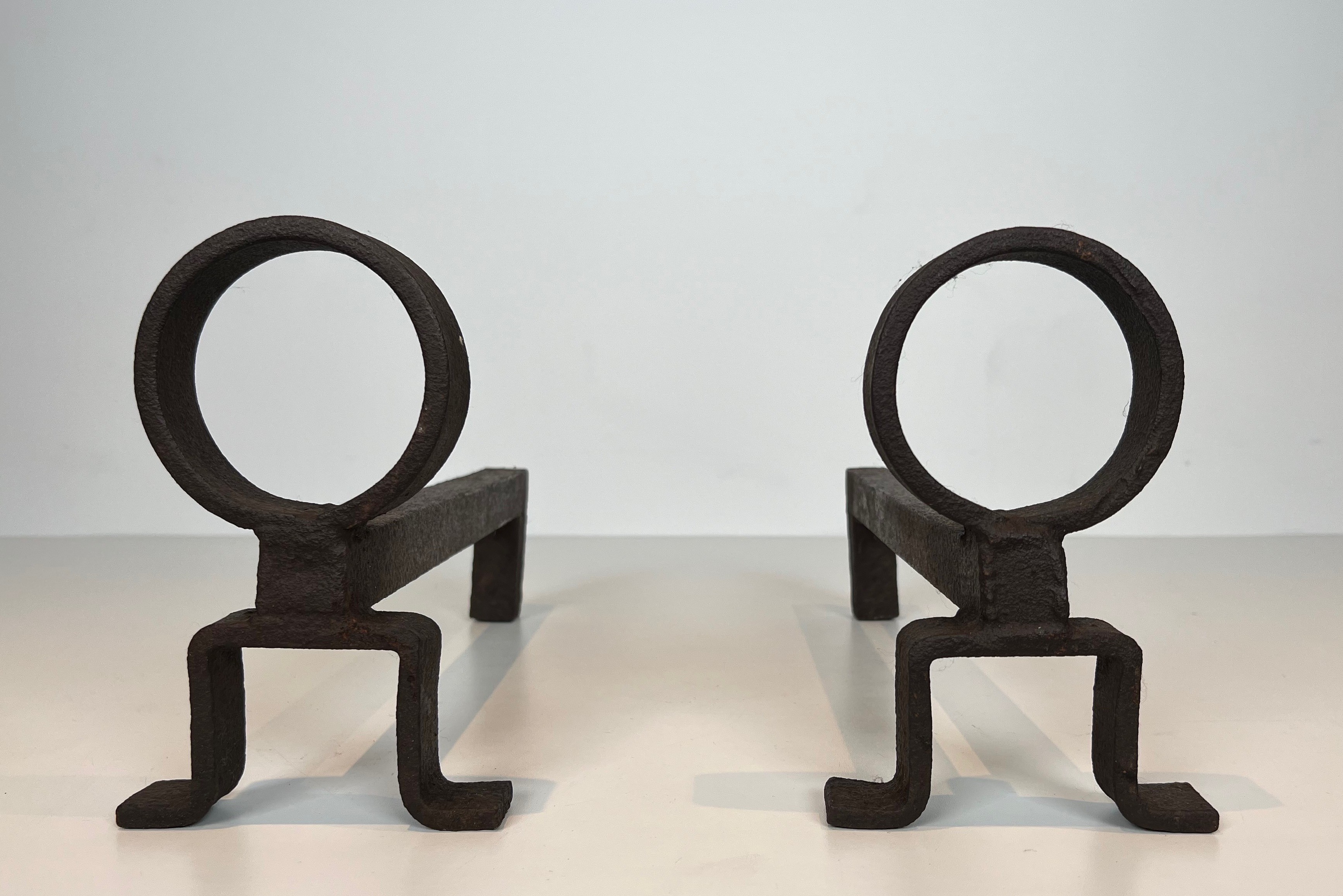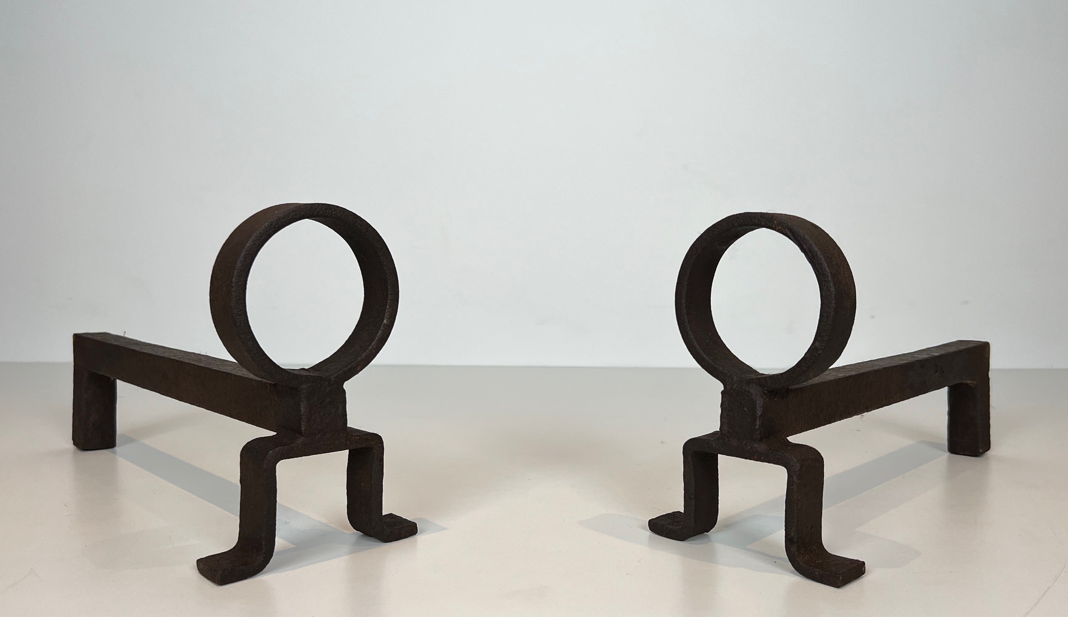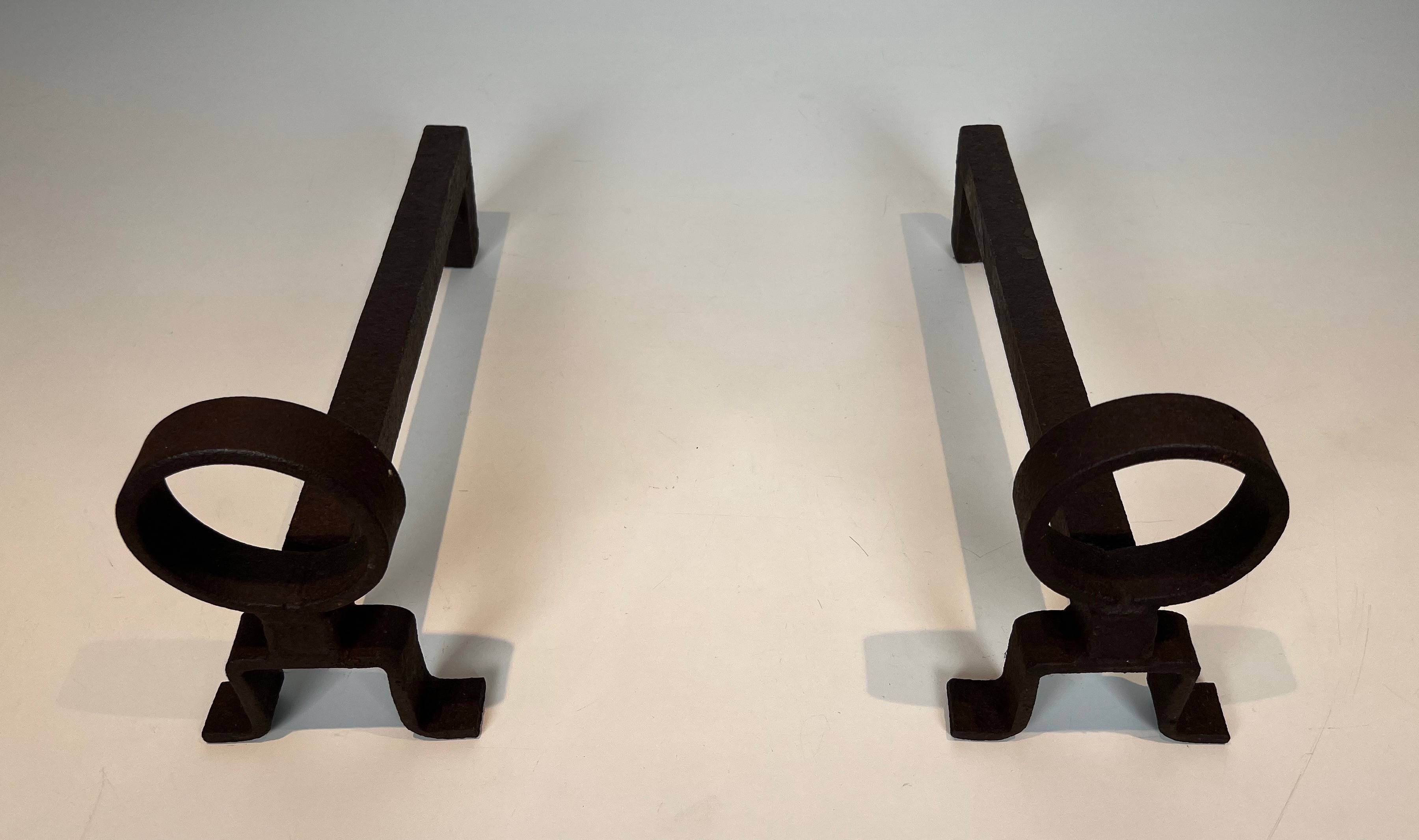 This compelling pair of andirons is fashioned from wrought iron in a modernist idiom that embraces sculptural form over historical precedent. Each andiron exhibits a fluidity and organic energy characteristic of the finest French blacksmithing of the 1950s, the iron worked to suggest movement and vitality rather than mere structural function. The overall composition is bold yet refined, the dark patina of the metal lending the pair an almost totemic presence when set before an open fire.