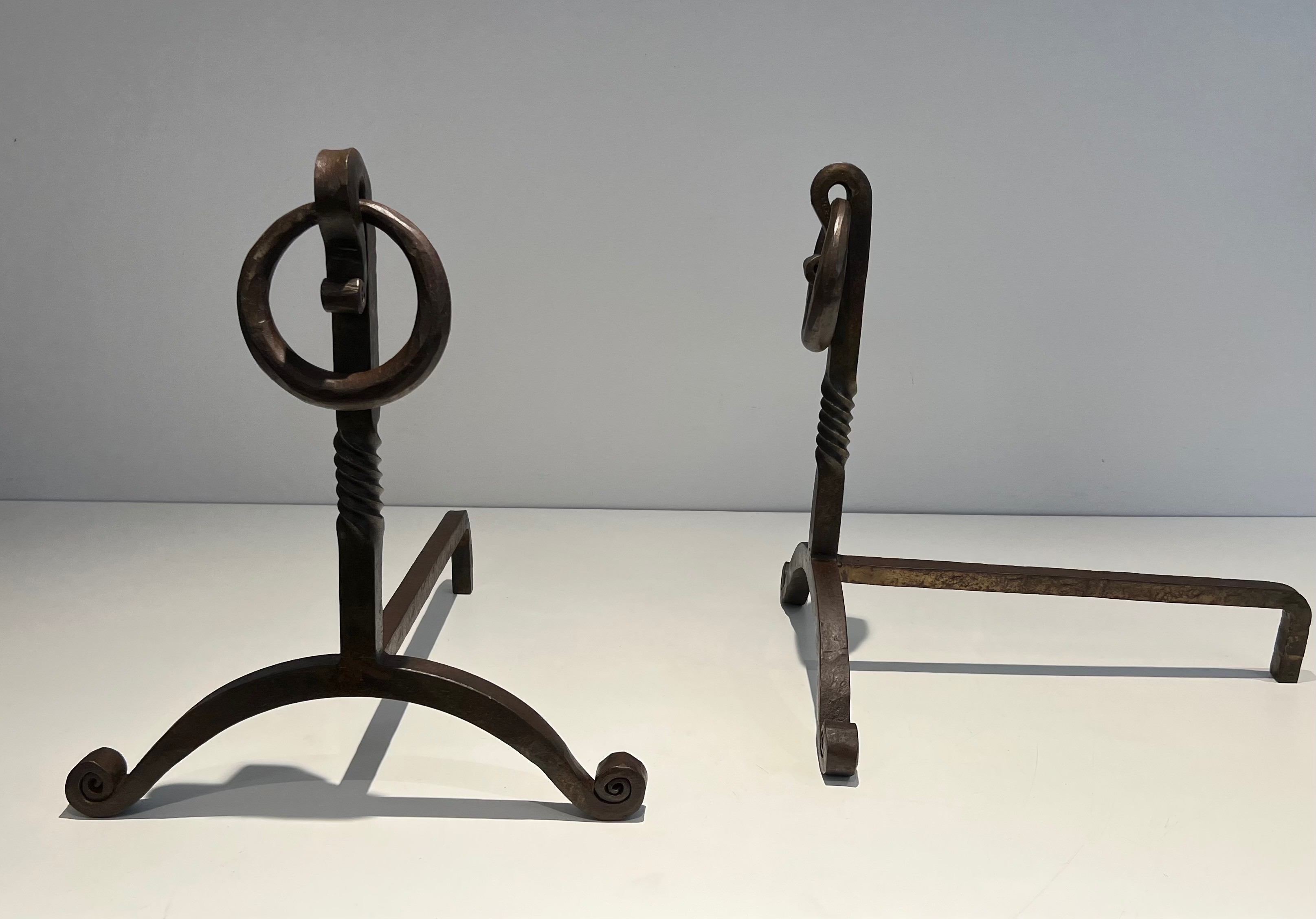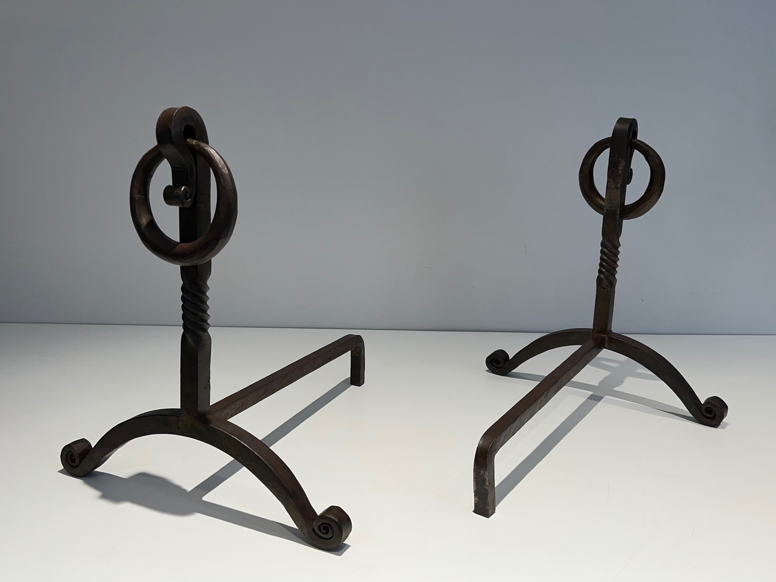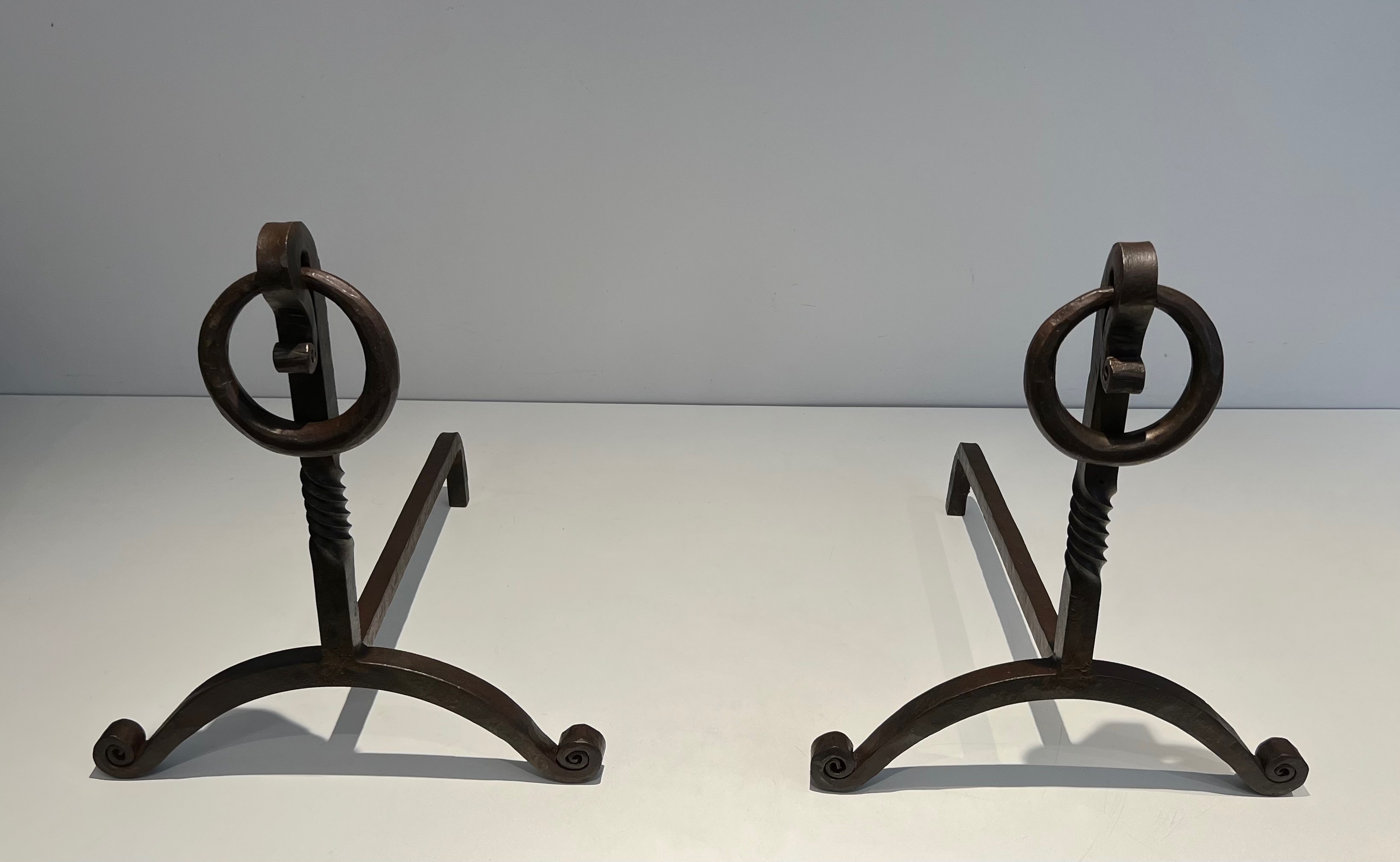 A pair of andirons such as these is at once practical and deeply ornamental — capable of grounding the hearth of a classical salon, a modernist interior, or a country house with equal authority. Their austere beauty deepens in the flickering light of a fire, the iron taking on a rich, almost bronzed quality. An excellent acquisition for the collector of French postwar decorative metalwork.