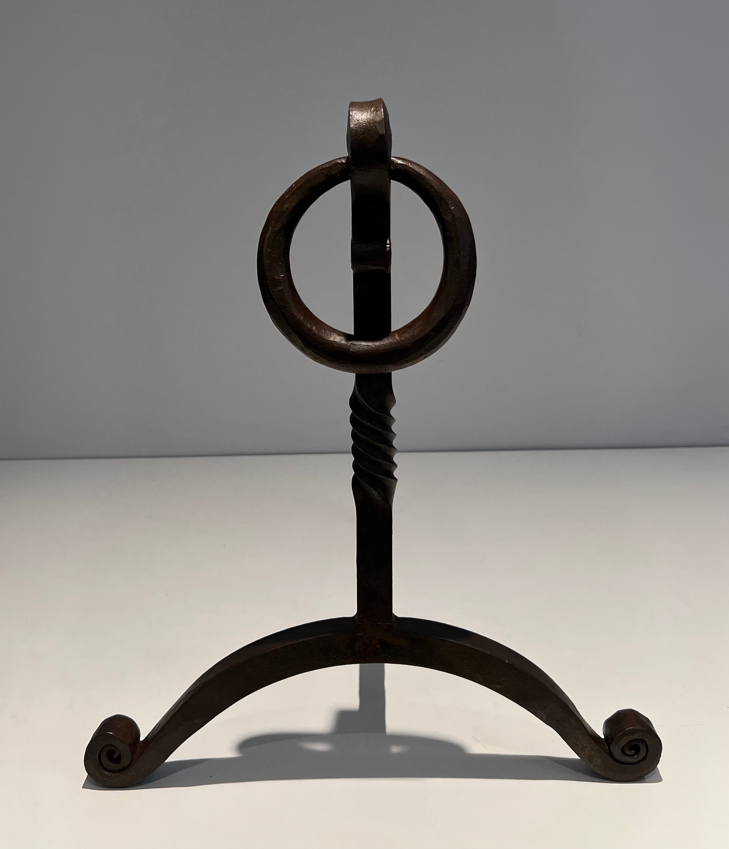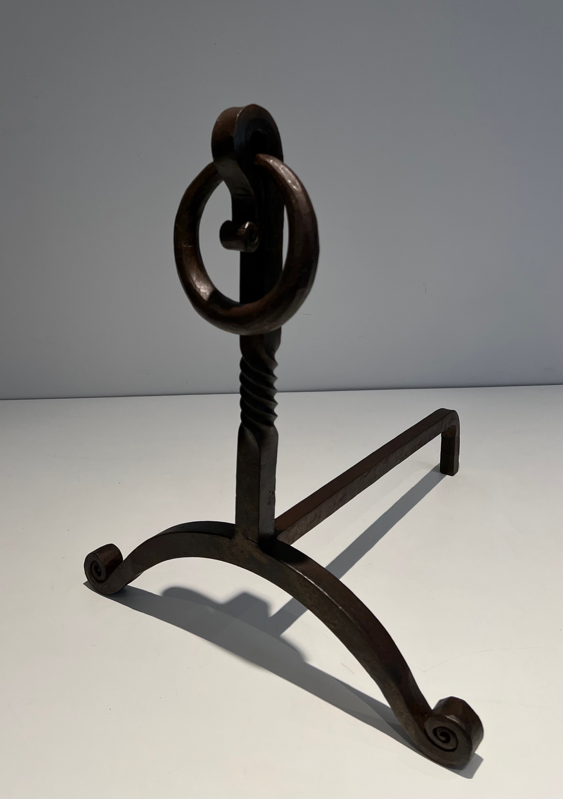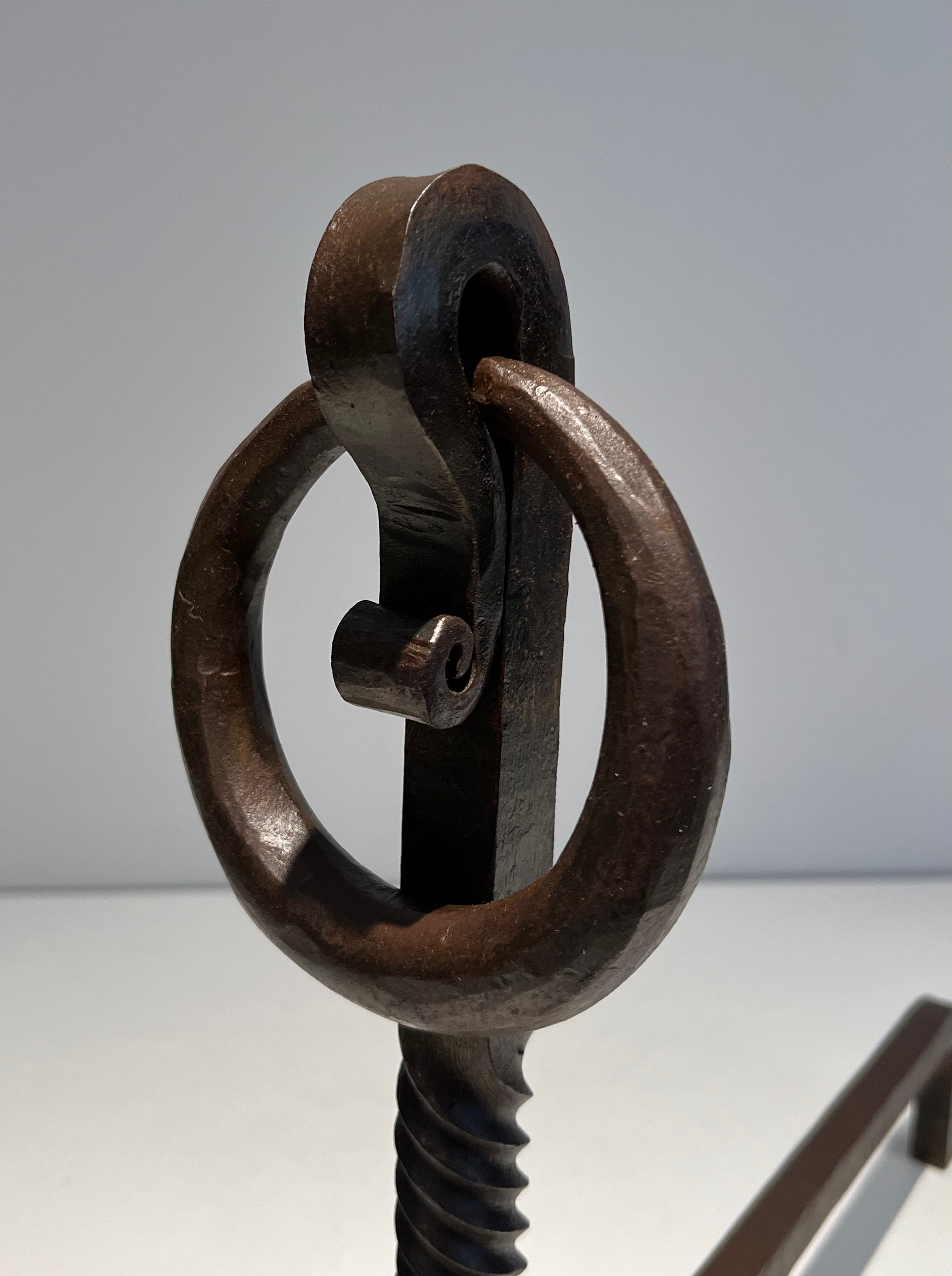 A pair of andirons such as these is at once practical and deeply ornamental — capable of grounding the hearth of a classical salon, a modernist interior, or a country house with equal authority. Their austere beauty deepens in the flickering light of a fire, the iron taking on a rich, almost bronzed quality. An excellent acquisition for the collector of French postwar decorative metalwork.
