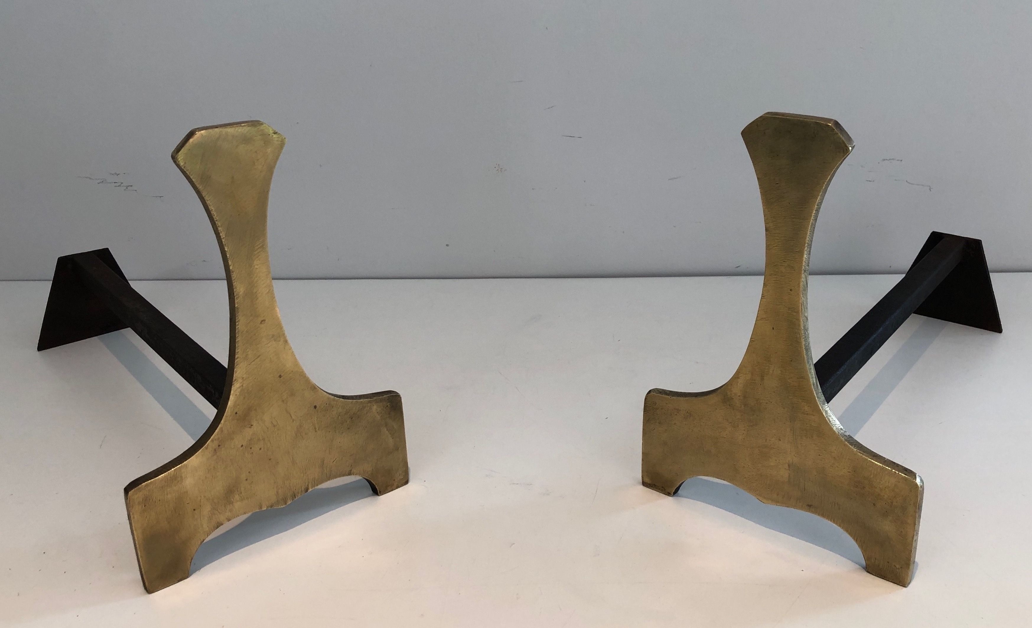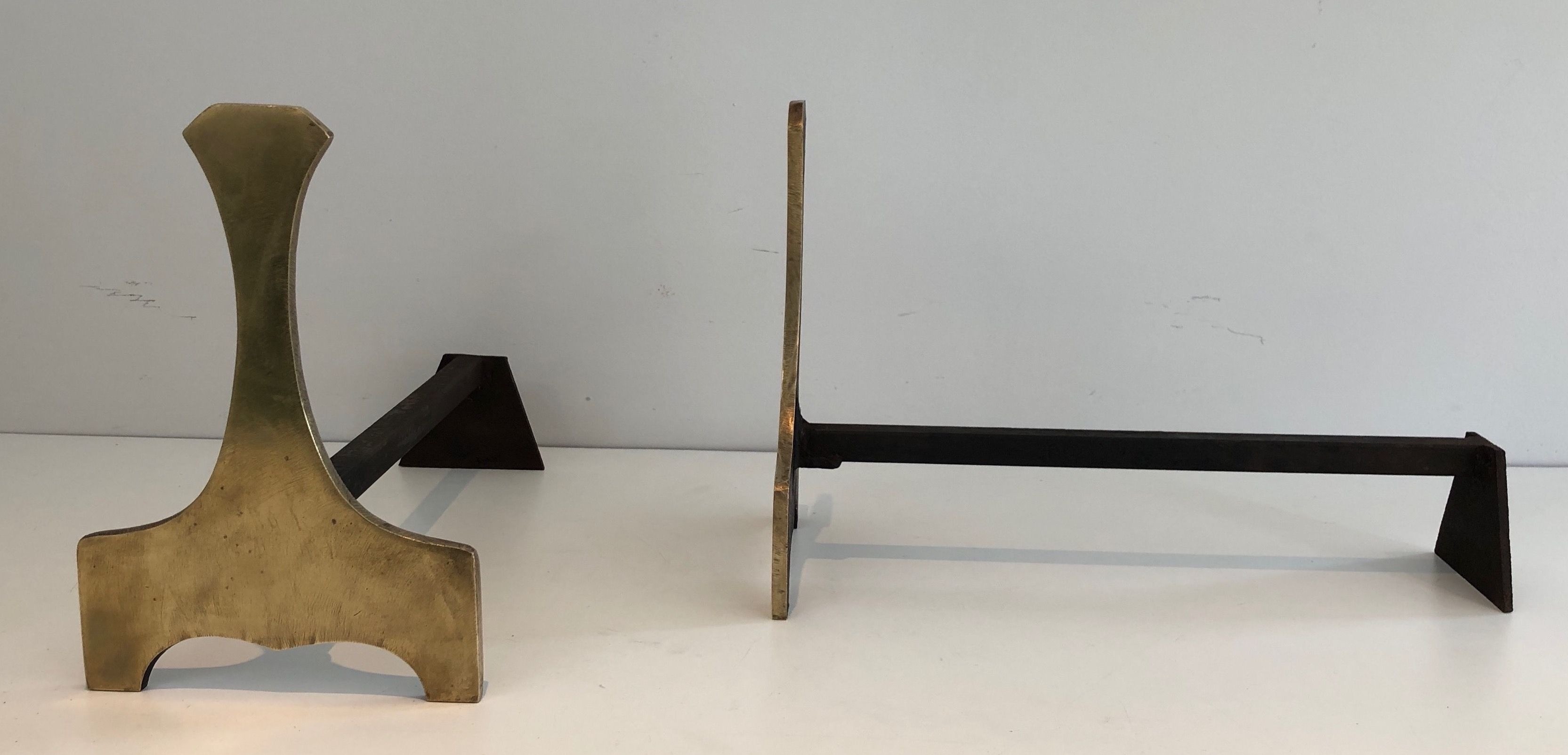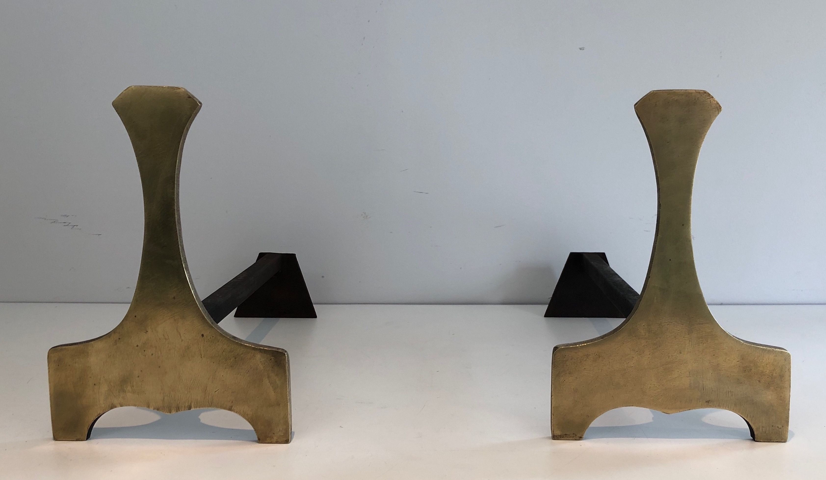 A bold pair of modernist andirons in polished brass, their abstract sculptural form embodying the confident decorative language of French design in the 1970s. The clean geometric lines and assured proportions of the uprights contrast with the functional horizontal bars, creating a composition of architectural simplicity and great visual strength. The brass is warm and luminous, polished to a high finish that catches and reflects the light of the flames it accompanies. French work, circa 1970.