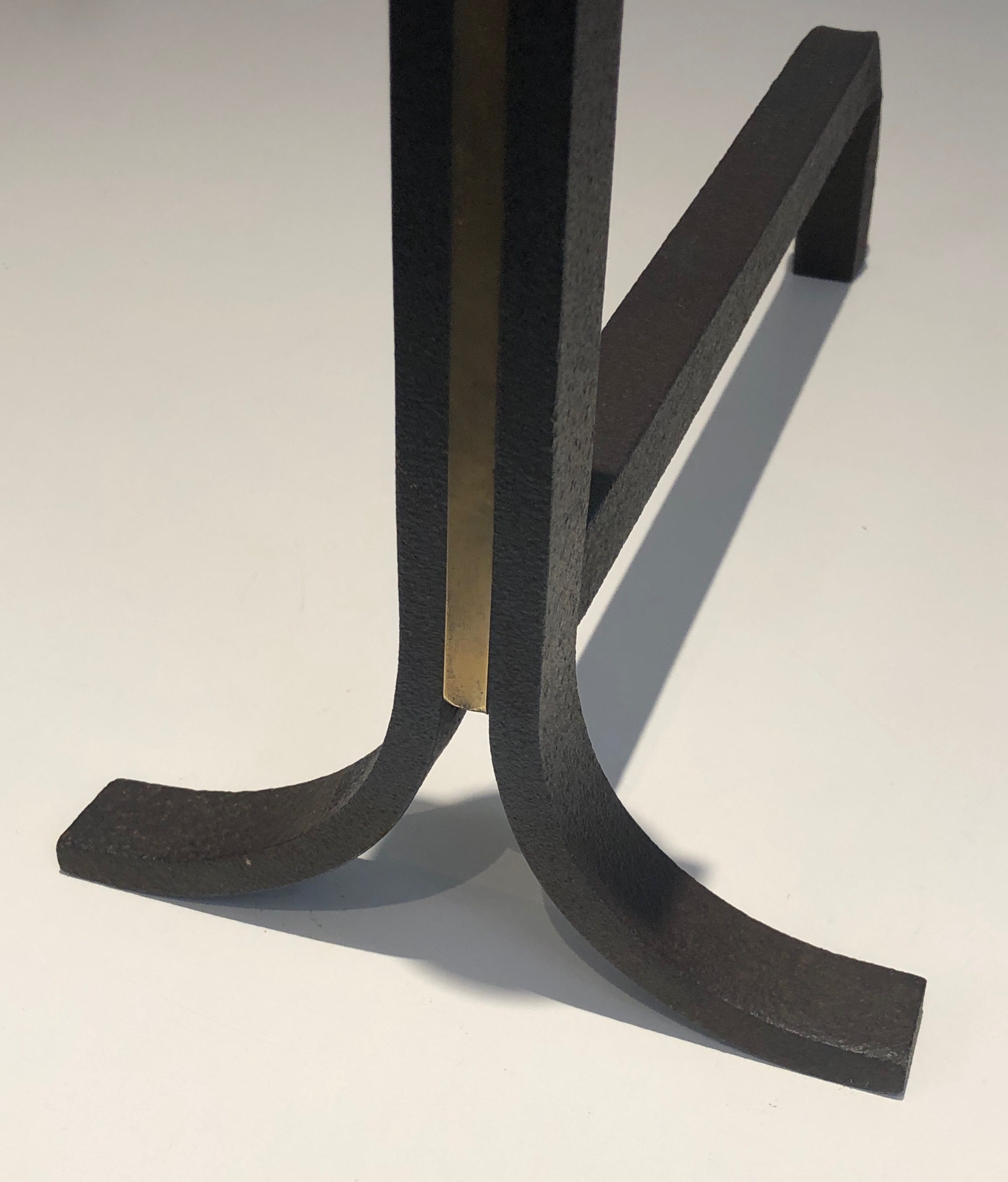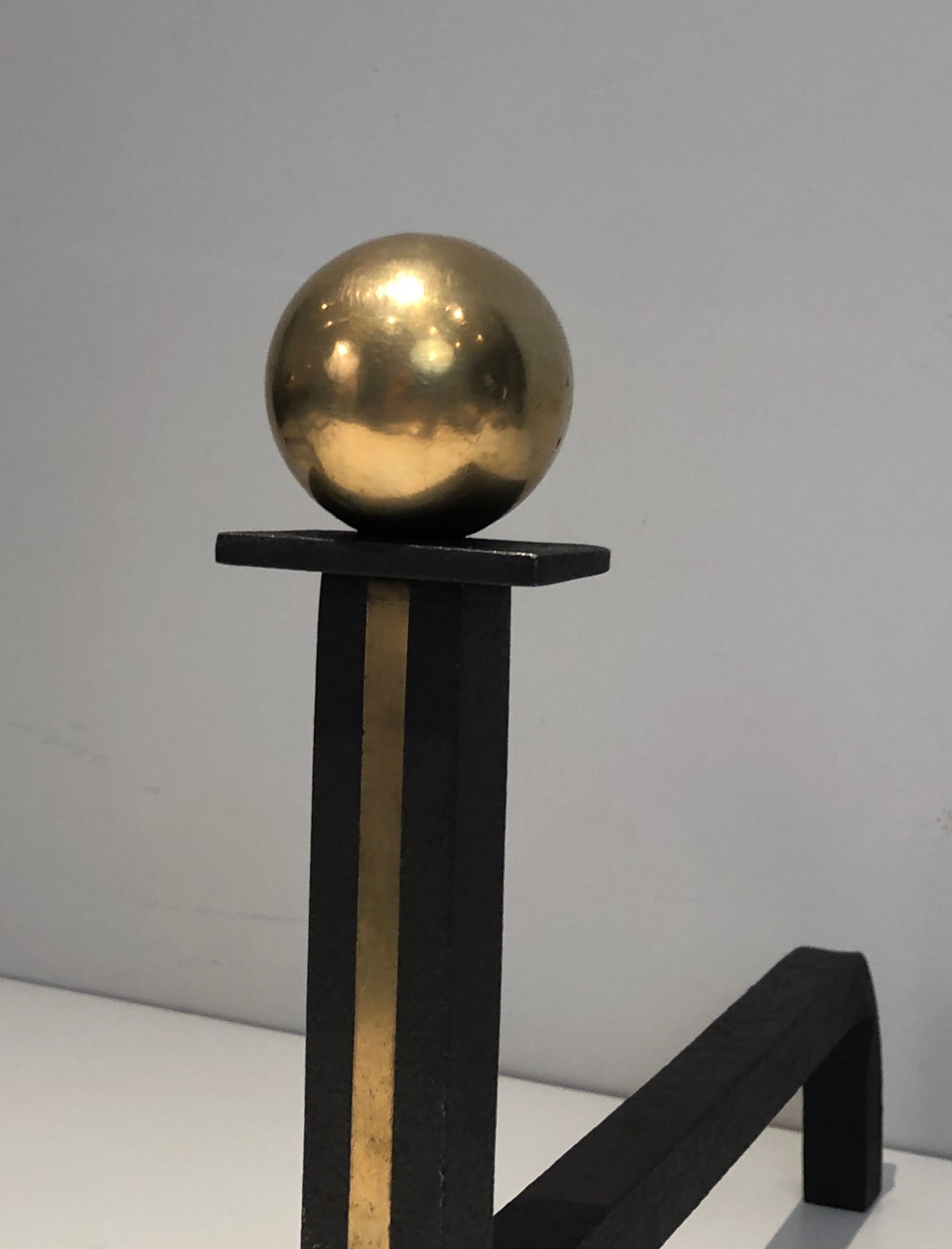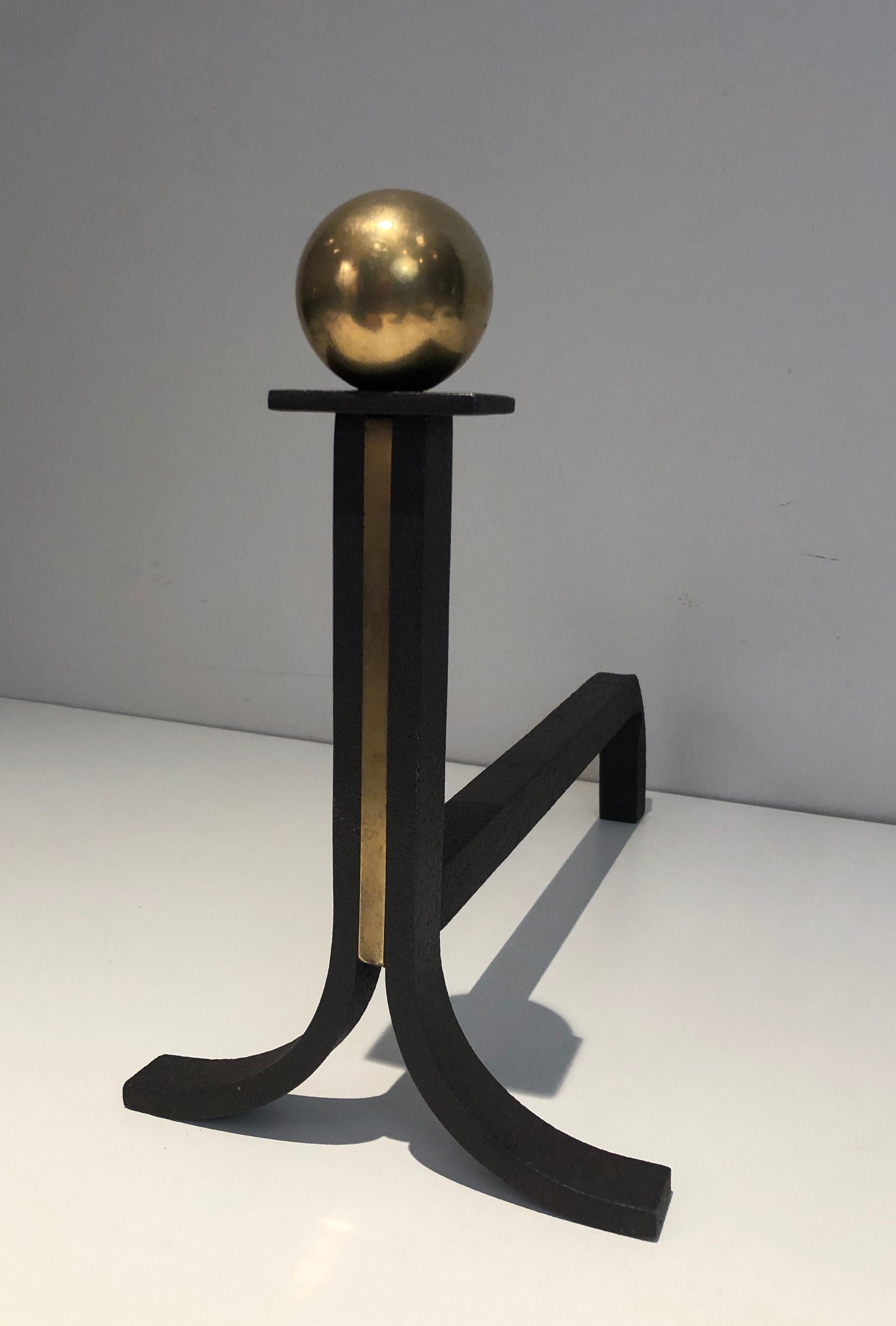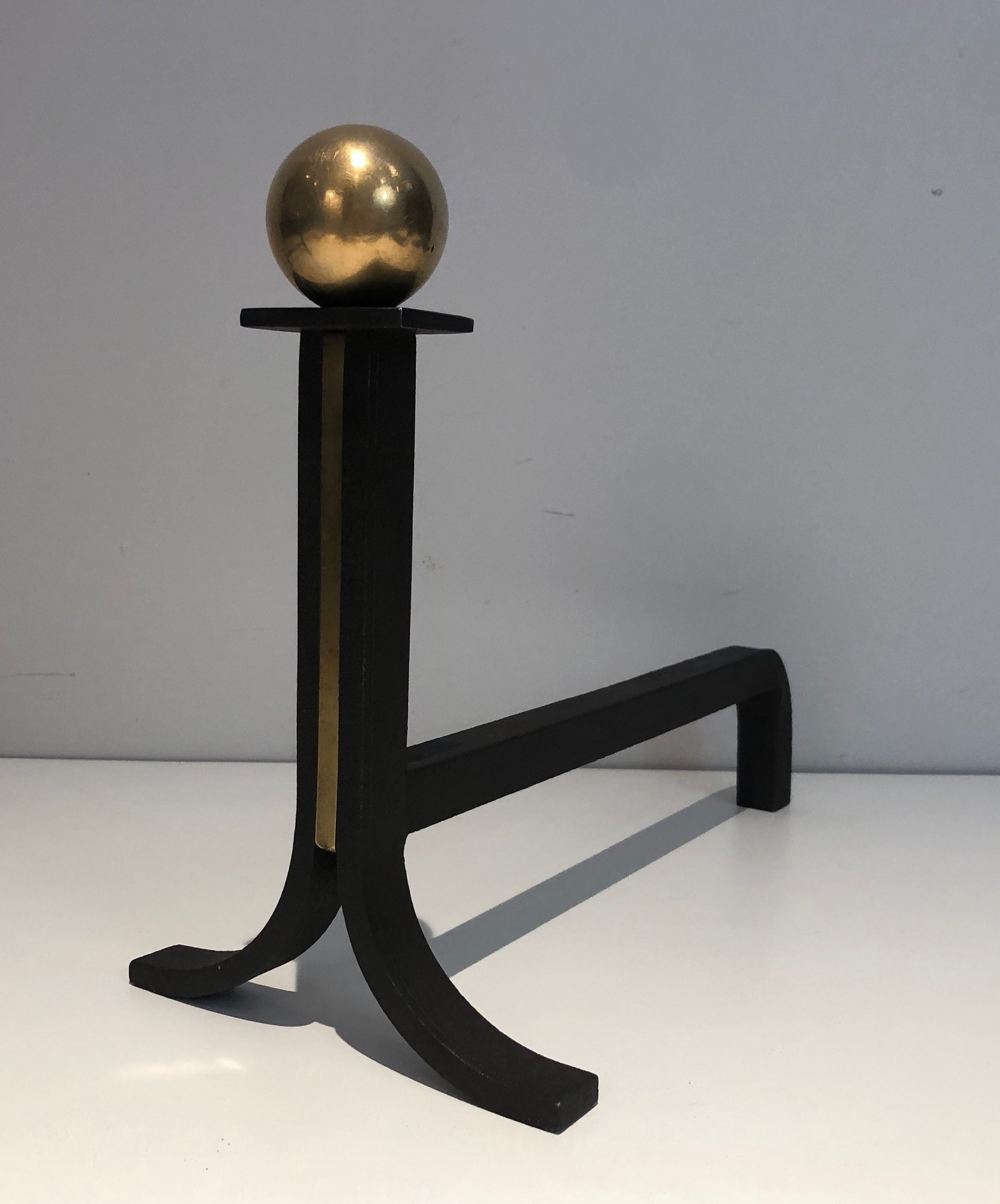Andirons of this quality and design sensibility would be a distinguished addition to any fireplace — whether in a formal salon, a library, or a contemporary living space. Their combination of iron and brass introduces a note of material richness that animates the hearth, while the modernist geometry ensures they sit comfortably in interiors ranging from the period to the thoroughly contemporary. Their attribution to Adnet's aesthetic makes them objects of genuine collector's interest as well as practical accessories of enduring elegance.