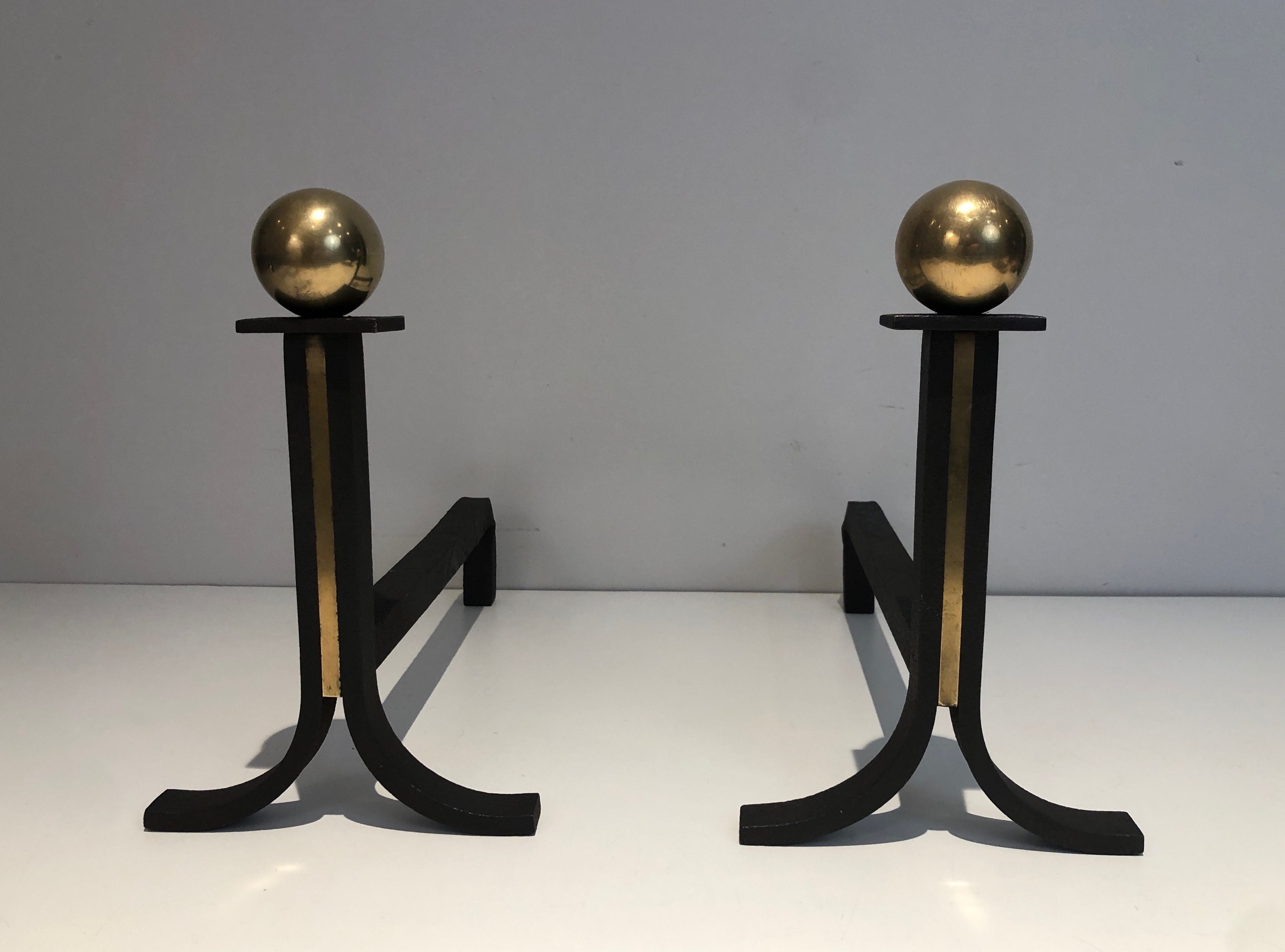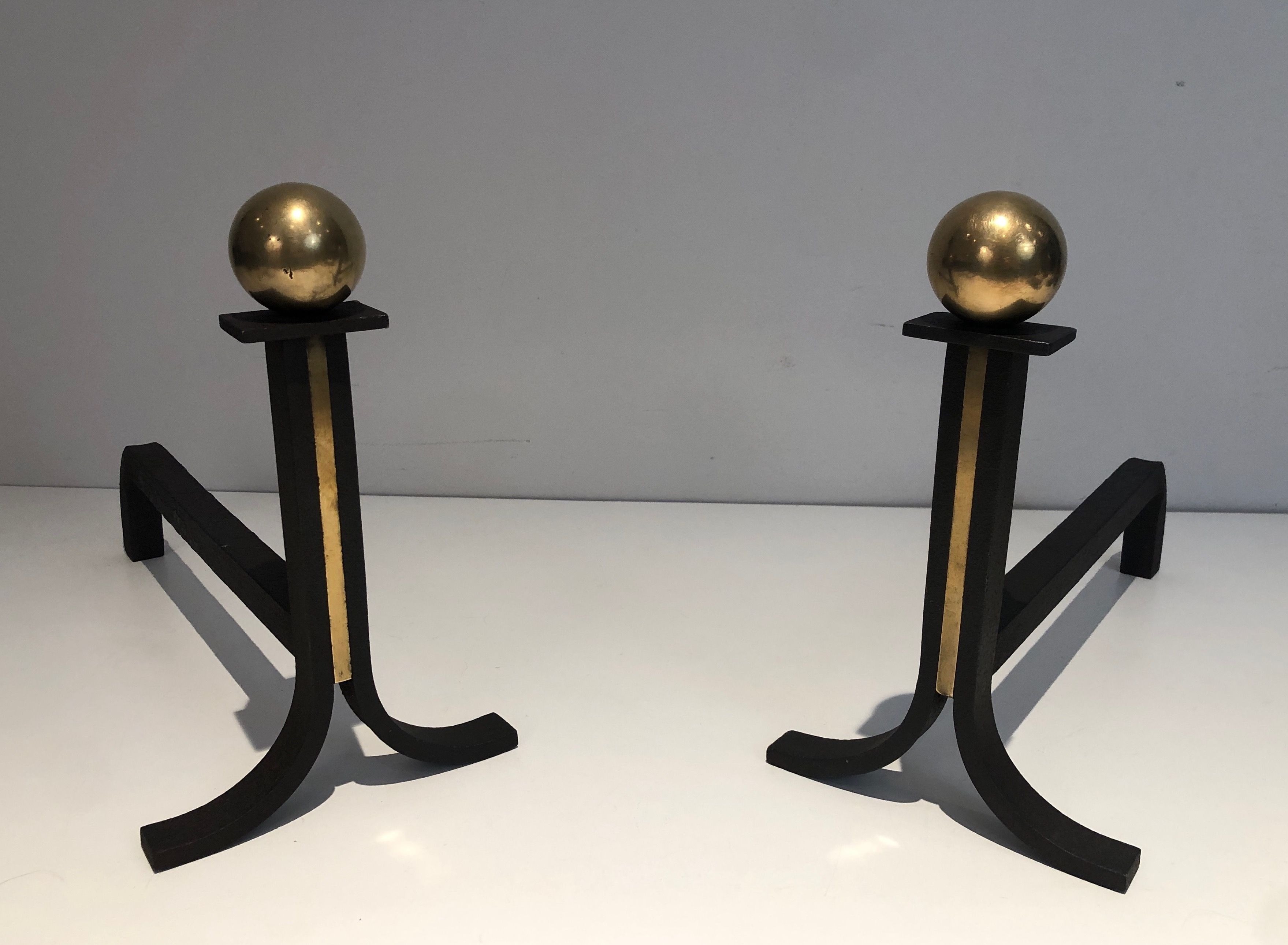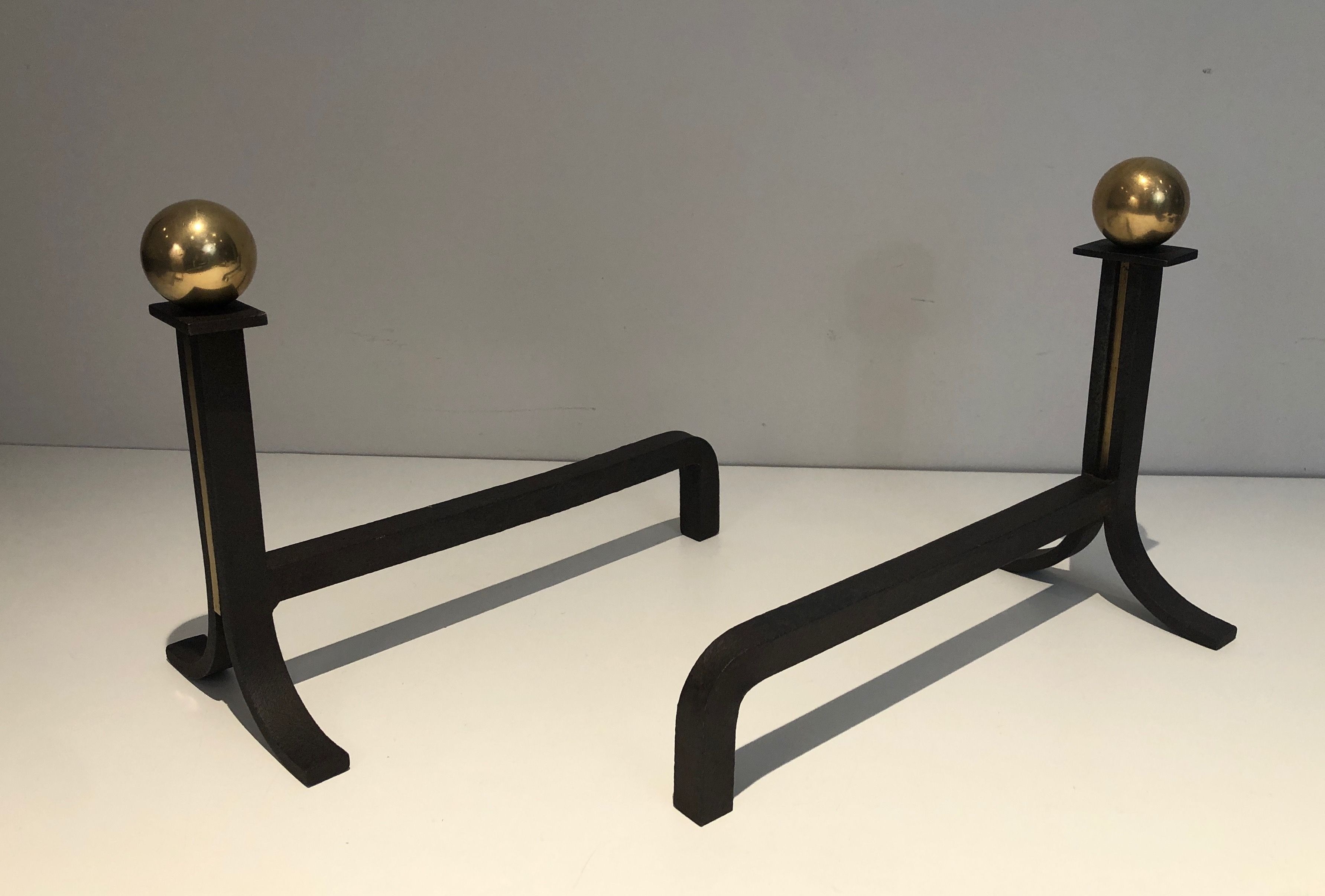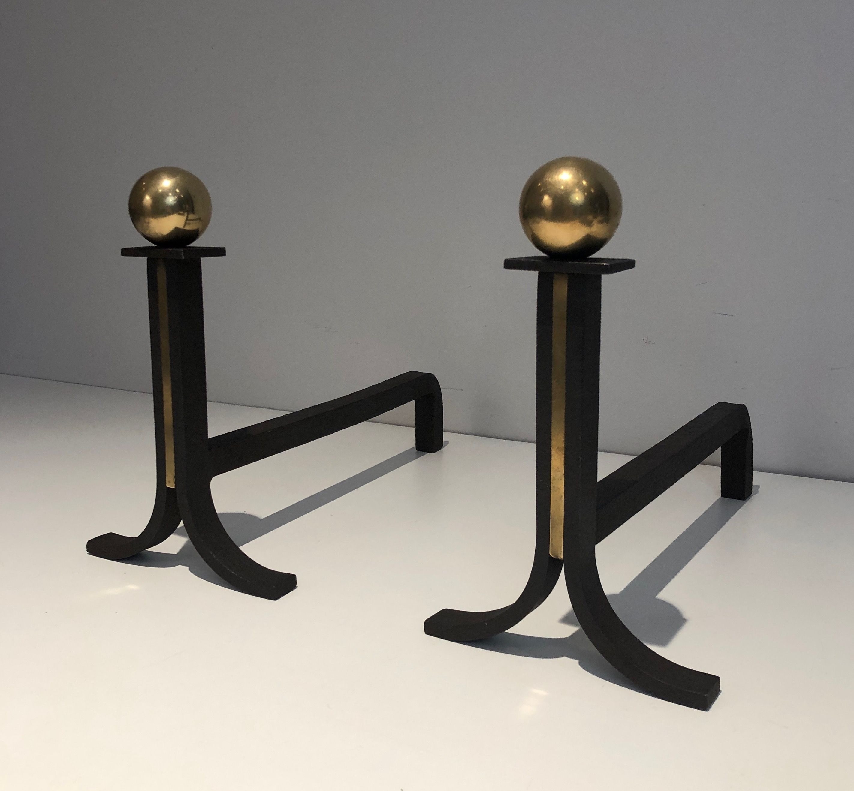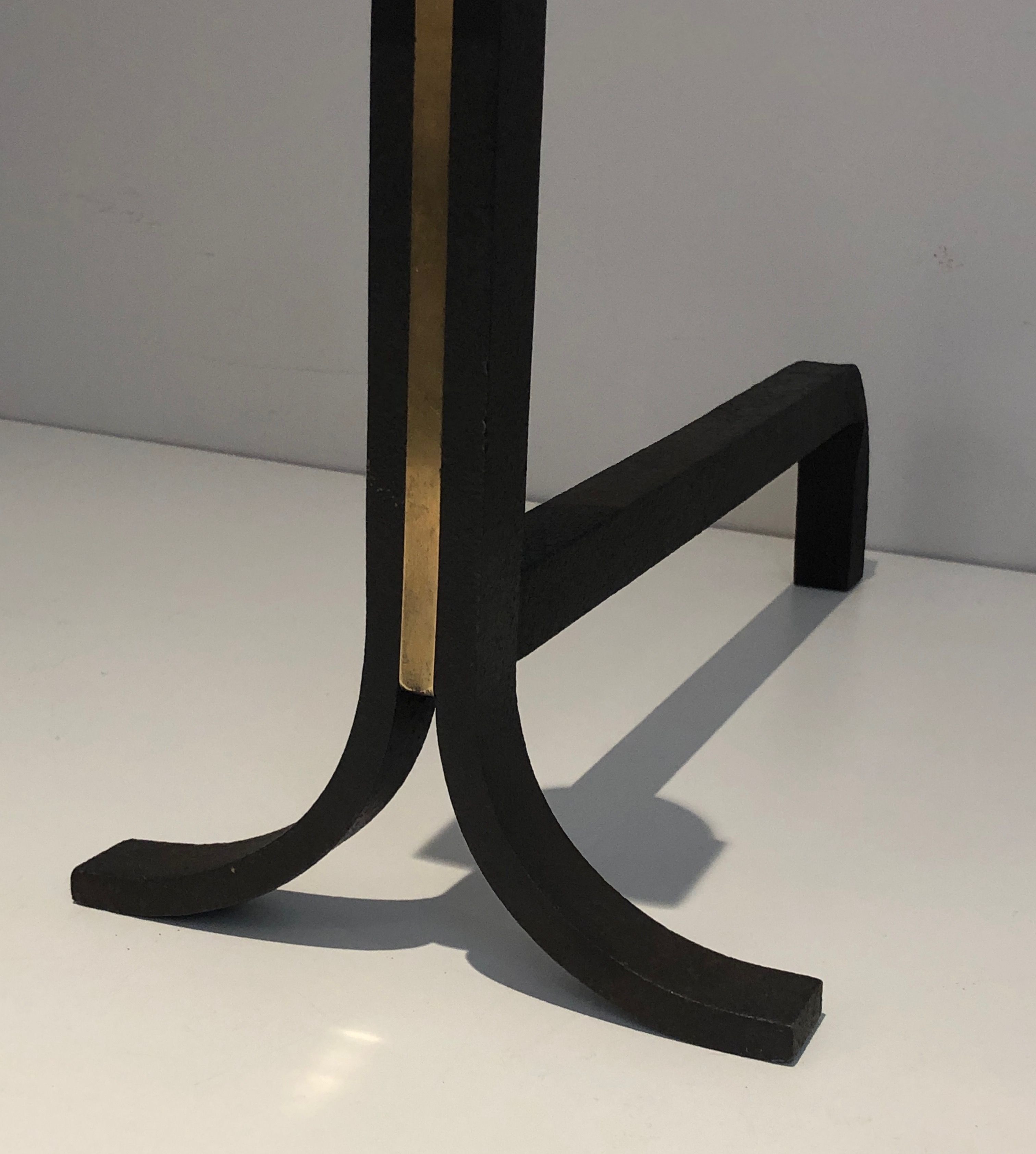 Andirons of this quality and design sensibility would be a distinguished addition to any fireplace — whether in a formal salon, a library, or a contemporary living space. Their combination of iron and brass introduces a note of material richness that animates the hearth, while the modernist geometry ensures they sit comfortably in interiors ranging from the period to the thoroughly contemporary. Their attribution to Adnet's aesthetic makes them objects of genuine collector's interest as well as practical accessories of enduring elegance.
