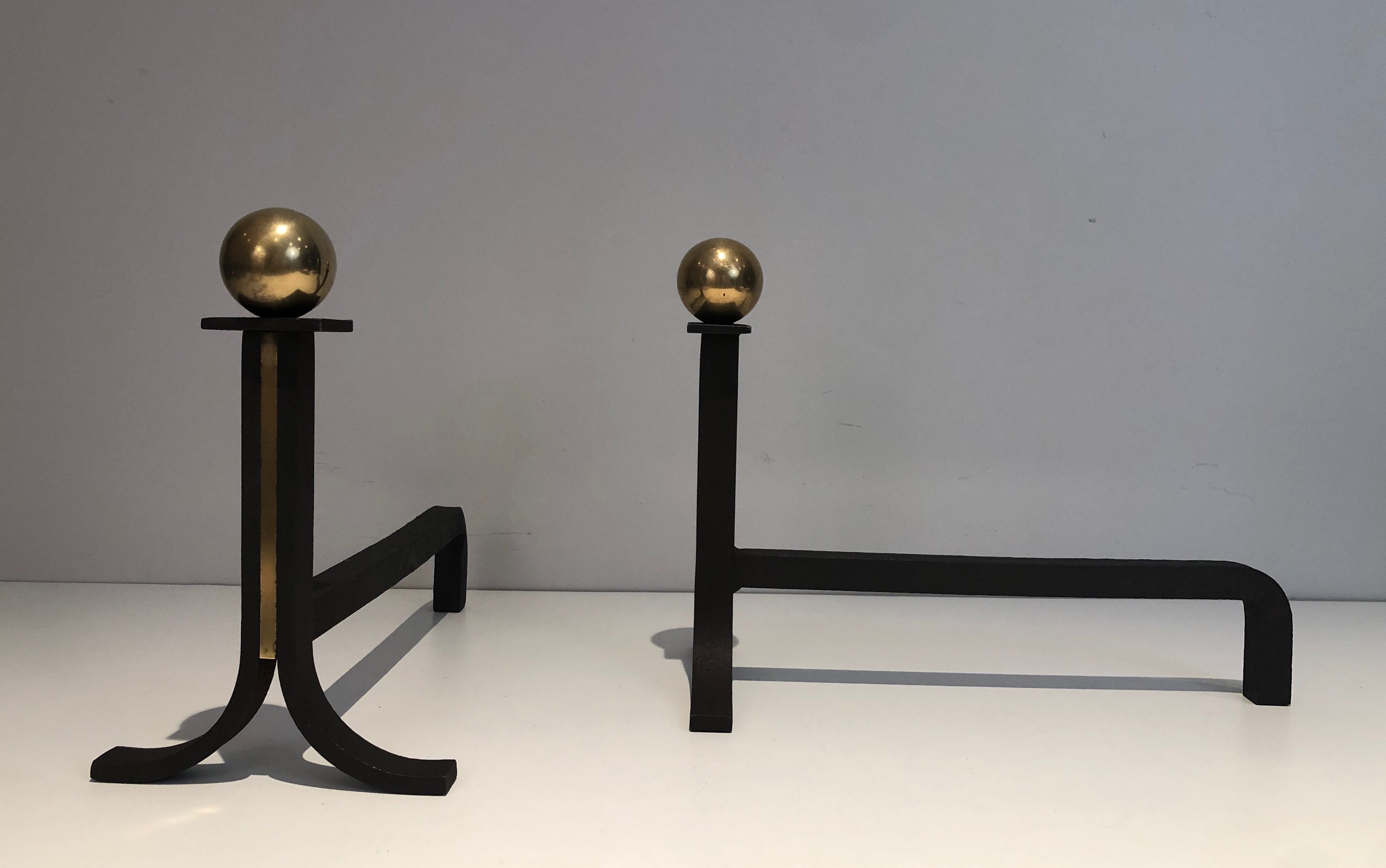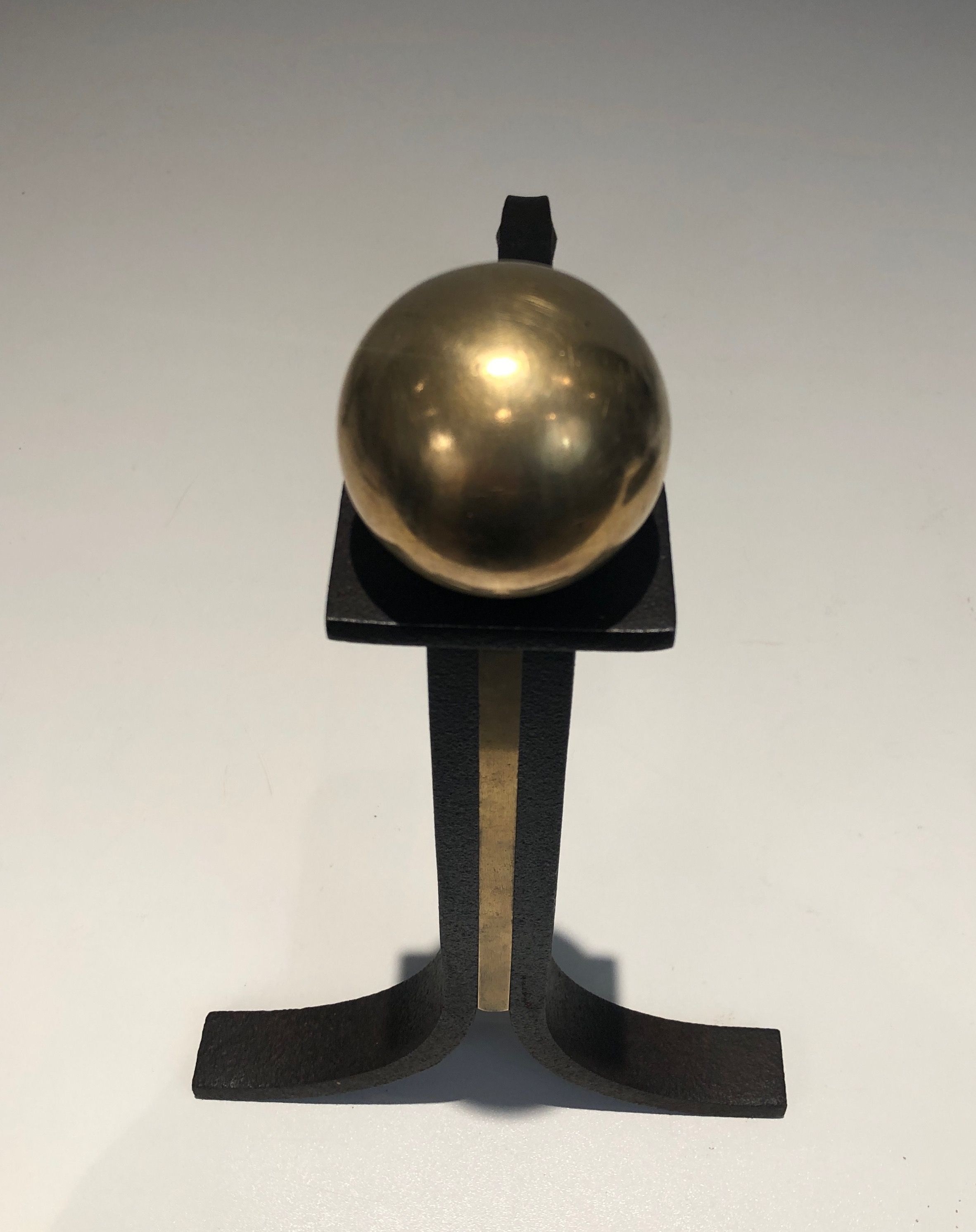 This pair of andirons is executed in a modernist vocabulary that combines the industrial authority of steel and wrought iron with the warm luxury of polished brass. The stark, geometric forms — columns, bars, and horizontal supports assembled with the precision of industrial design — represent a decisive break from the ornate historicism of nineteenth-century fireplace furniture, replacing scrollwork and cast figures with a vocabulary of pure volume and contrasting materials. The two andirons are identical and complementary, their visual presence at once functional and sculptural.
