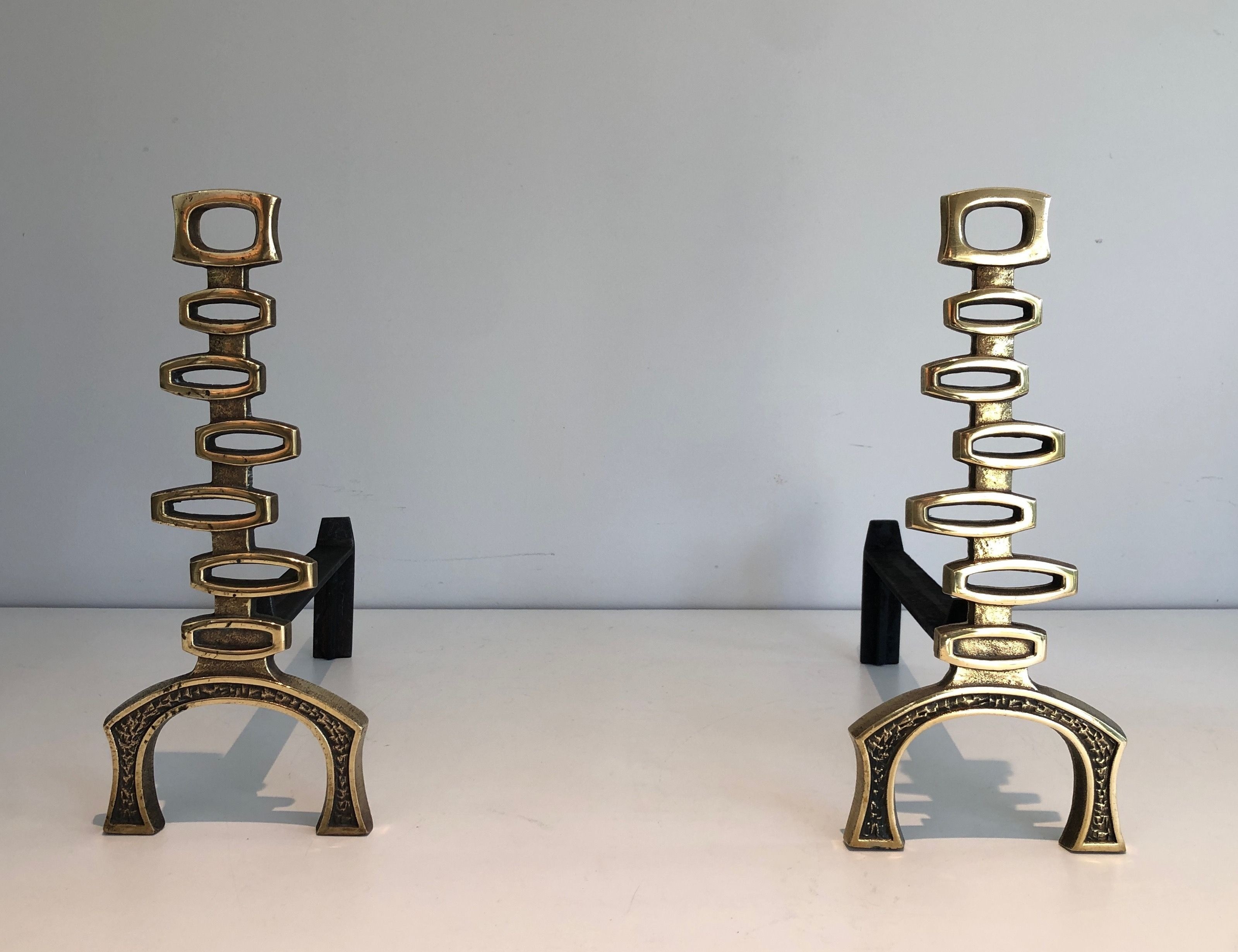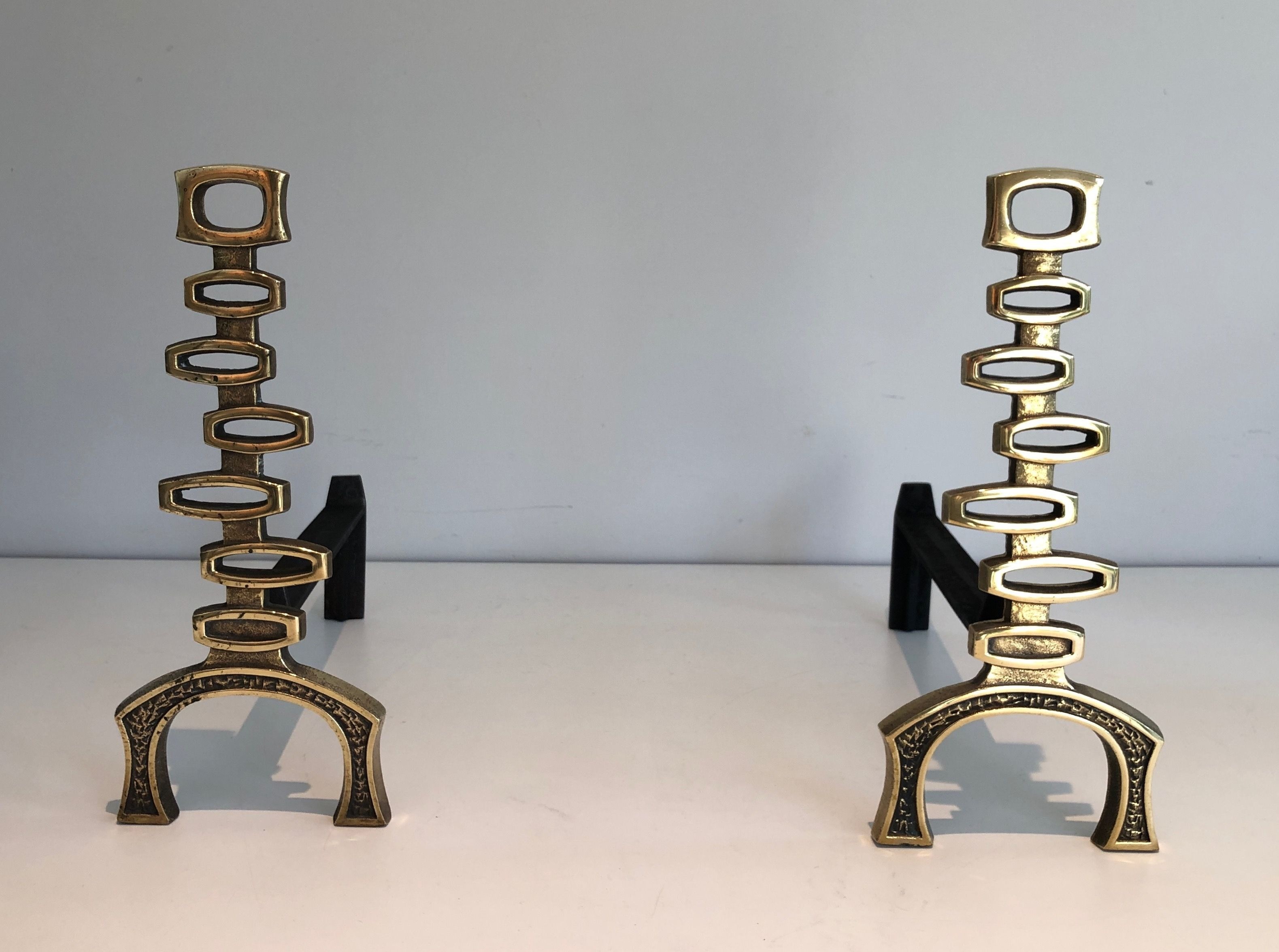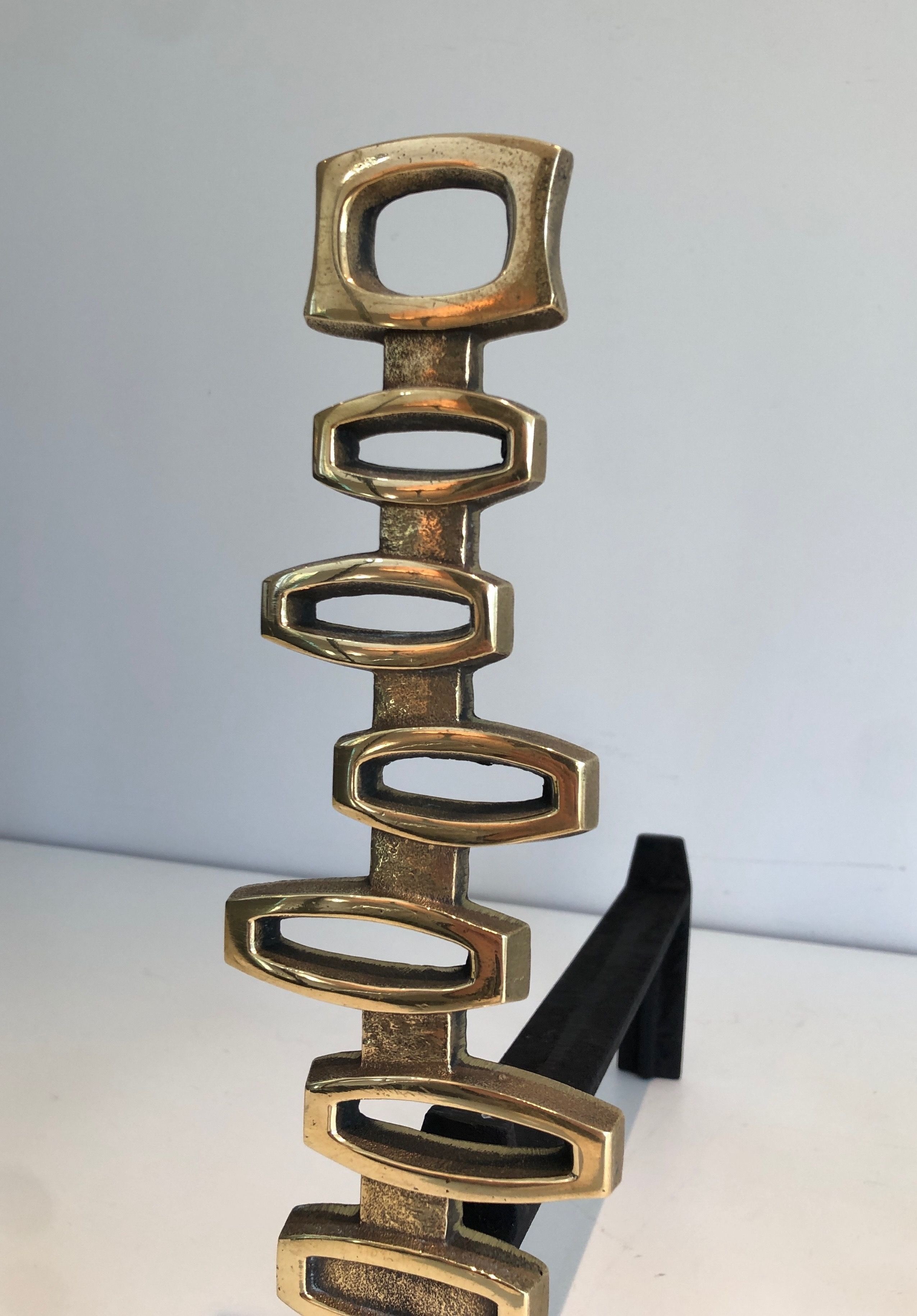 This pair of andirons is executed in polished brass in a vocabulary of modernist abstraction that reflects the confident formal intelligence of Italian design of the early 1970s. The brass supports — reduced to pure geometric forms, whether cylindrical, spherical, or angular — are conceived as sculptural objects in their own right, their formal economy endowing them with a timeless presence that transcends the purely functional. The warm golden patina of the polished brass catches the light of the fire with particular beauty, the flames animating the reflective surfaces of the metal with a living and fluctuating luminosity that transforms the fireplace into a stage for the complementary brilliances of fire and refined metalwork.