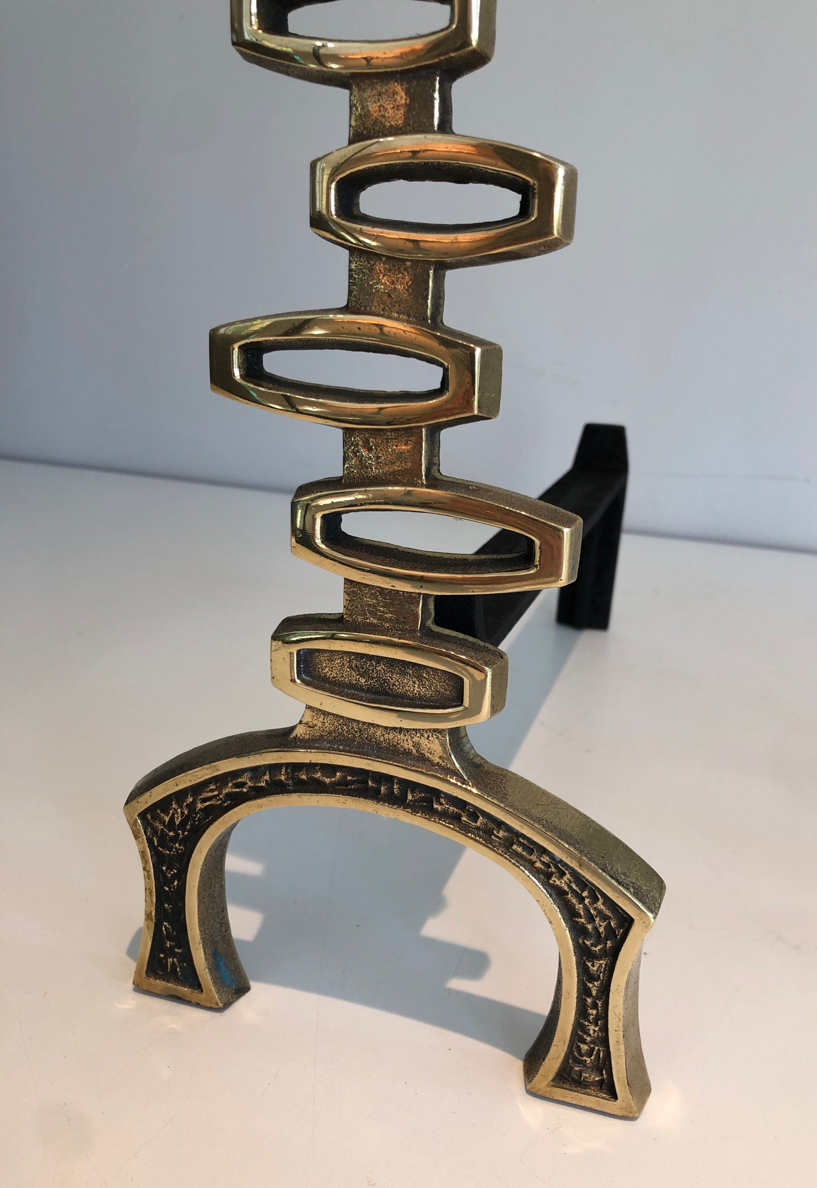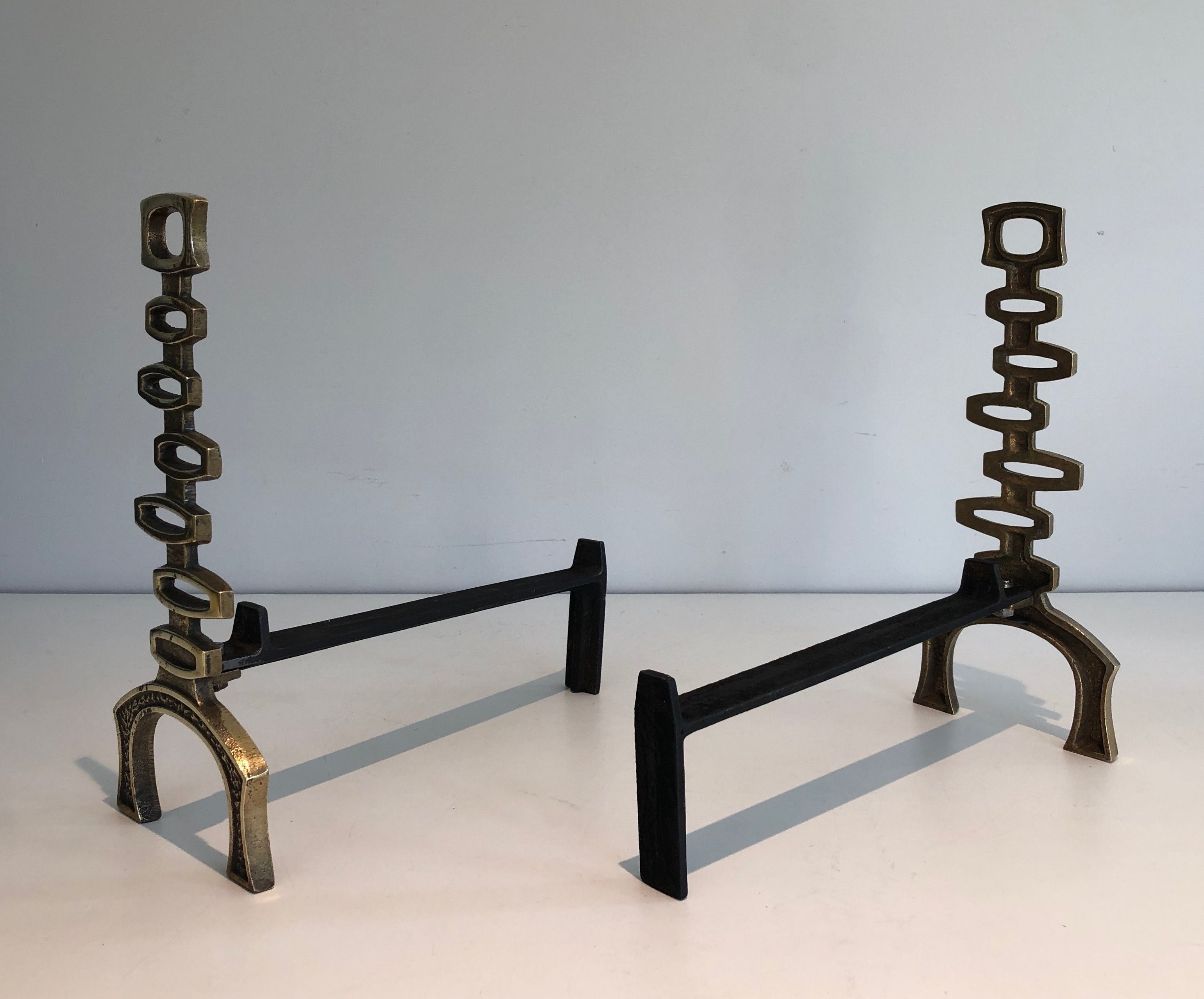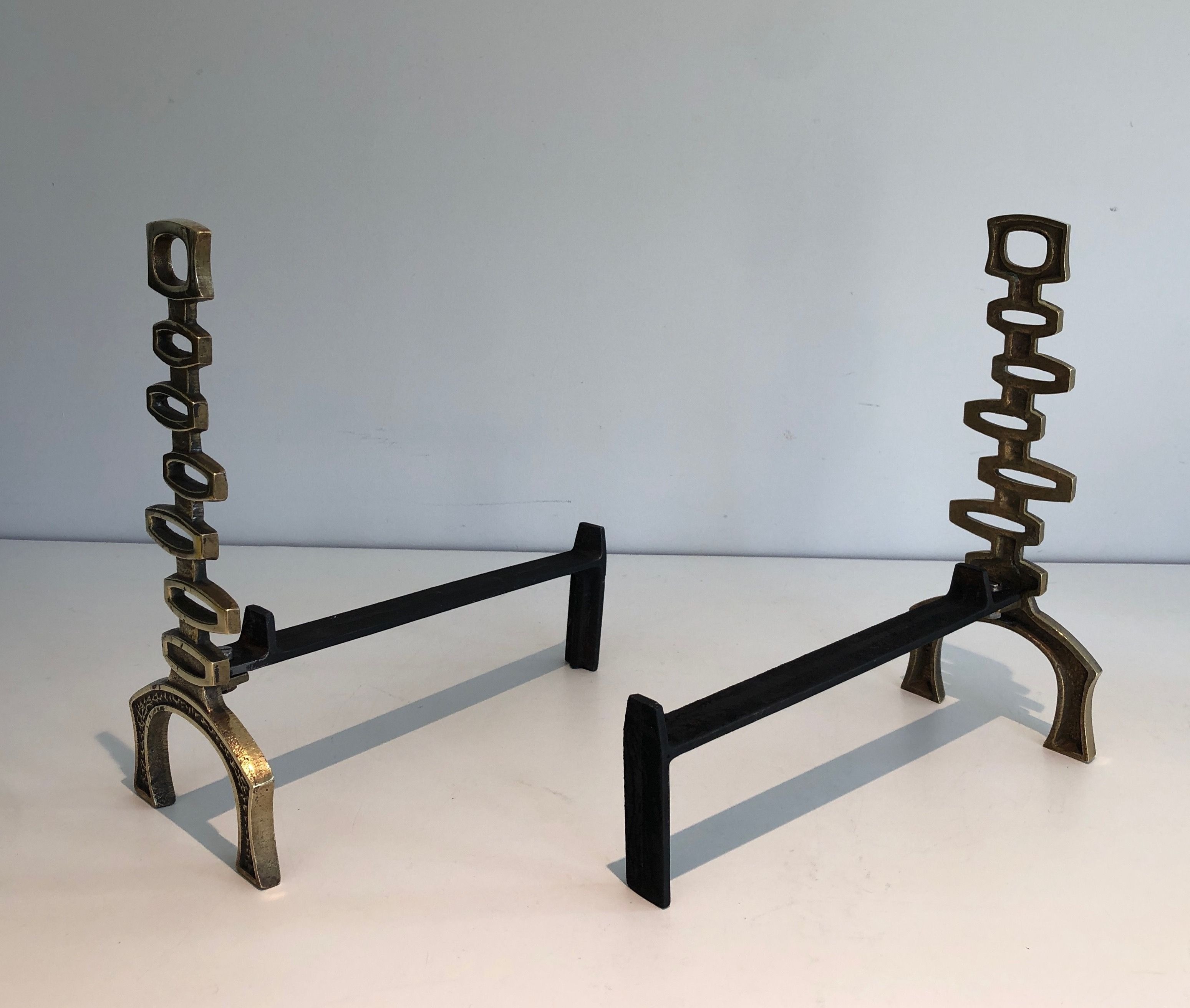 This pair of andirons is executed in polished brass in a vocabulary of modernist abstraction that reflects the confident formal intelligence of Italian design of the early 1970s. The brass supports — reduced to pure geometric forms, whether cylindrical, spherical, or angular — are conceived as sculptural objects in their own right, their formal economy endowing them with a timeless presence that transcends the purely functional. The warm golden patina of the polished brass catches the light of the fire with particular beauty, the flames animating the reflective surfaces of the metal with a living and fluctuating luminosity that transforms the fireplace into a stage for the complementary brilliances of fire and refined metalwork.