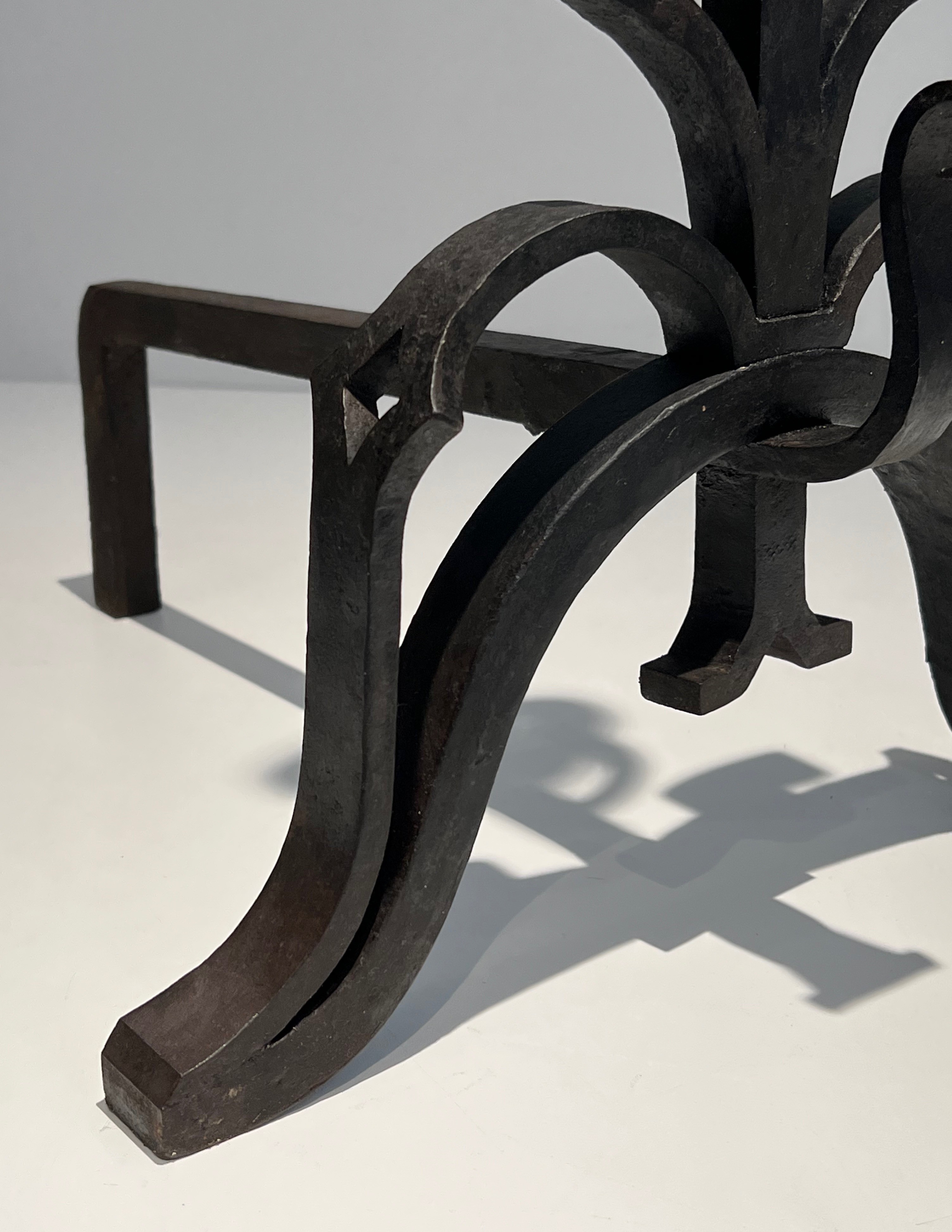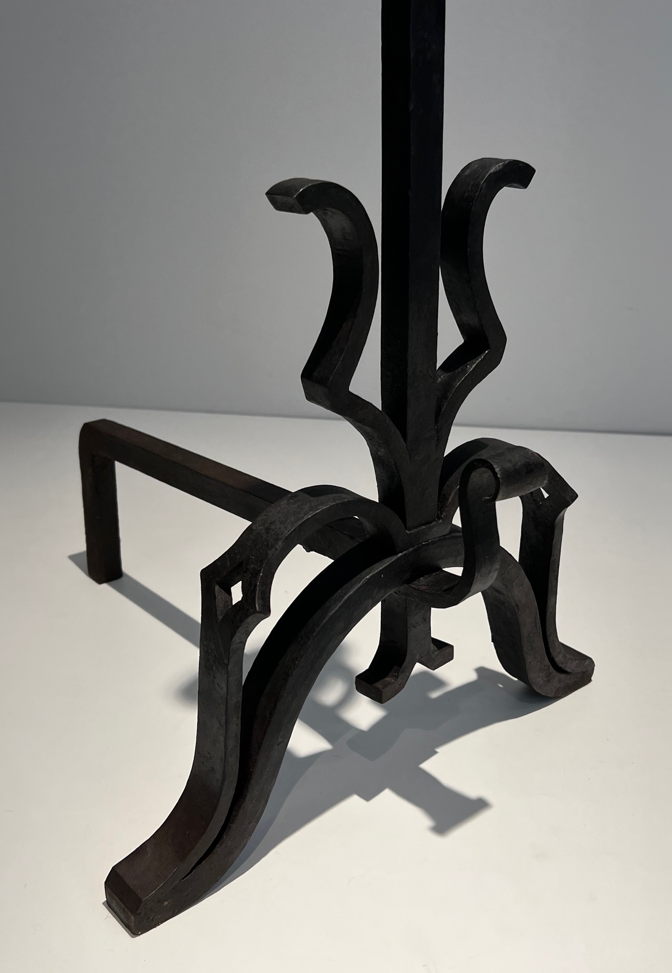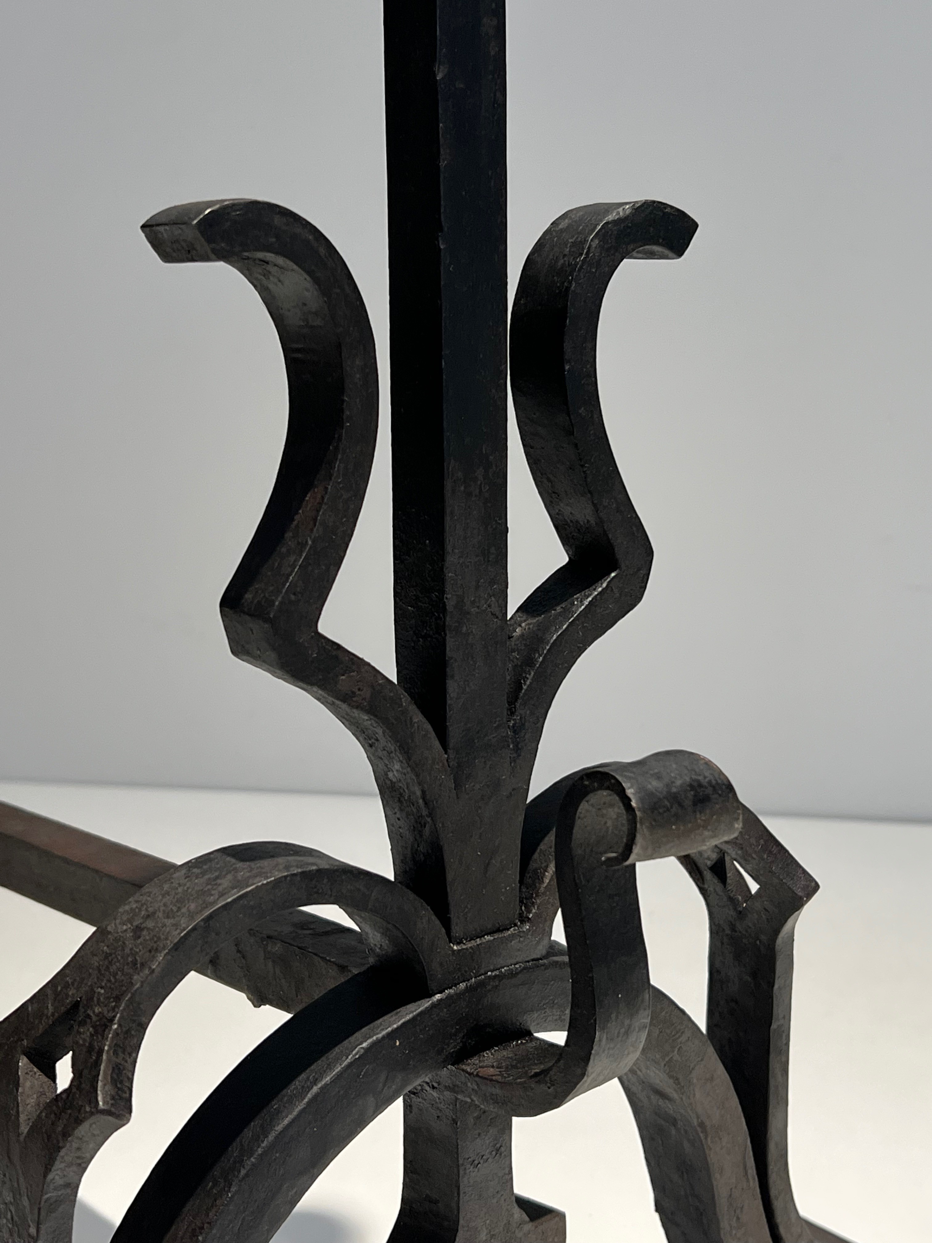 Monumental andirons of this calibre belong to the great tradition of French decorative ironwork stretching from the forge masters of the Renaissance and Baroque era to the distinguished metalworkers of the twentieth century. In grand French residences — châteaux, hôtels particuliers, and the great country houses of the aristocracy and haute bourgeoisie — andirons of significant scale were considered essential furnishings for the principal reception rooms, where their imposing presence anchored the composition of the entire space. The combination of cast iron for the decorative elements and wrought iron for the structural parts reflects the sound technical judgement of an experienced craftsman.
