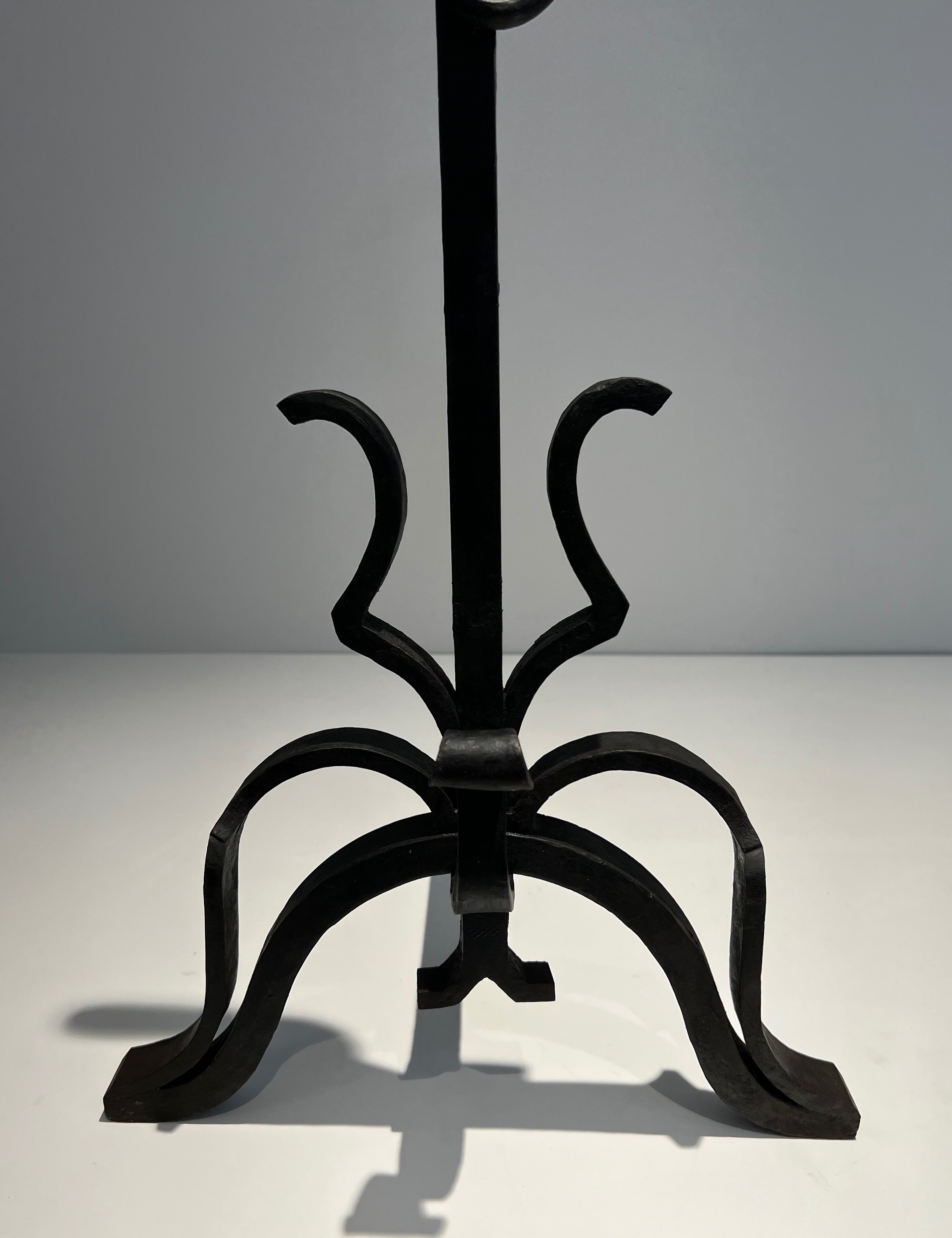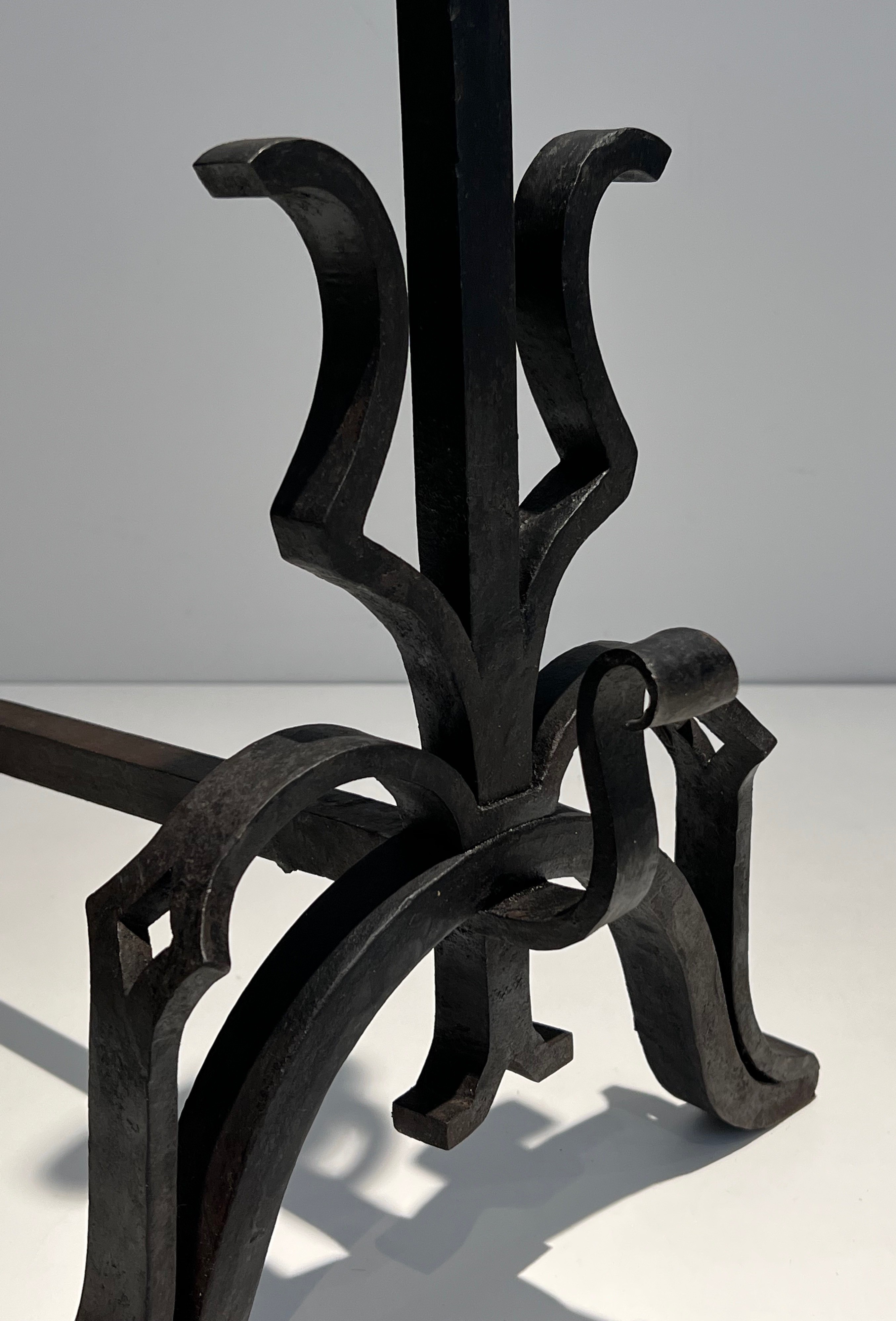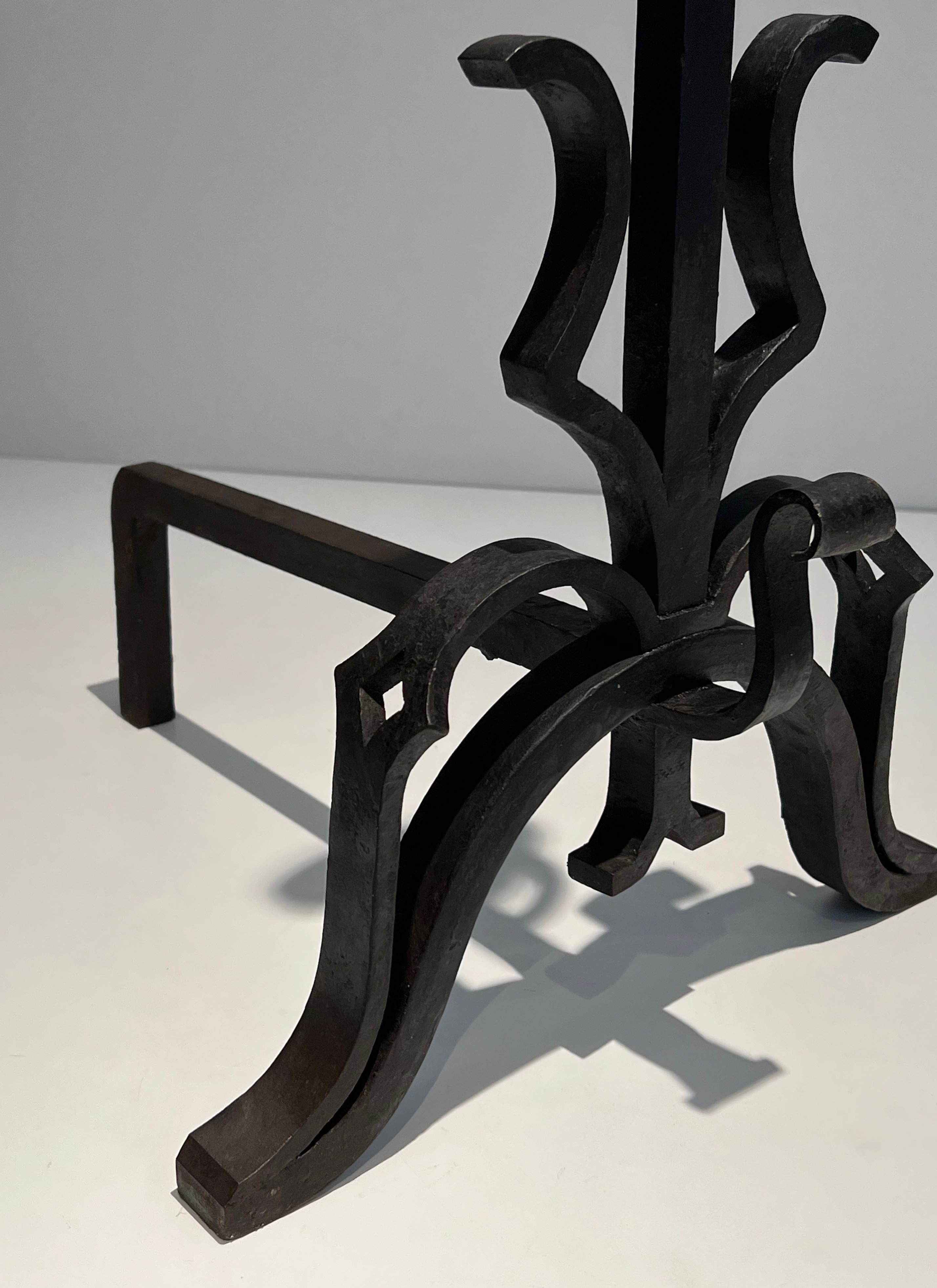 Monumental andirons of this calibre belong to the great tradition of French decorative ironwork stretching from the forge masters of the Renaissance and Baroque era to the distinguished metalworkers of the twentieth century. In grand French residences — châteaux, hôtels particuliers, and the great country houses of the aristocracy and haute bourgeoisie — andirons of significant scale were considered essential furnishings for the principal reception rooms, where their imposing presence anchored the composition of the entire space. The combination of cast iron for the decorative elements and wrought iron for the structural parts reflects the sound technical judgement of an experienced craftsman.