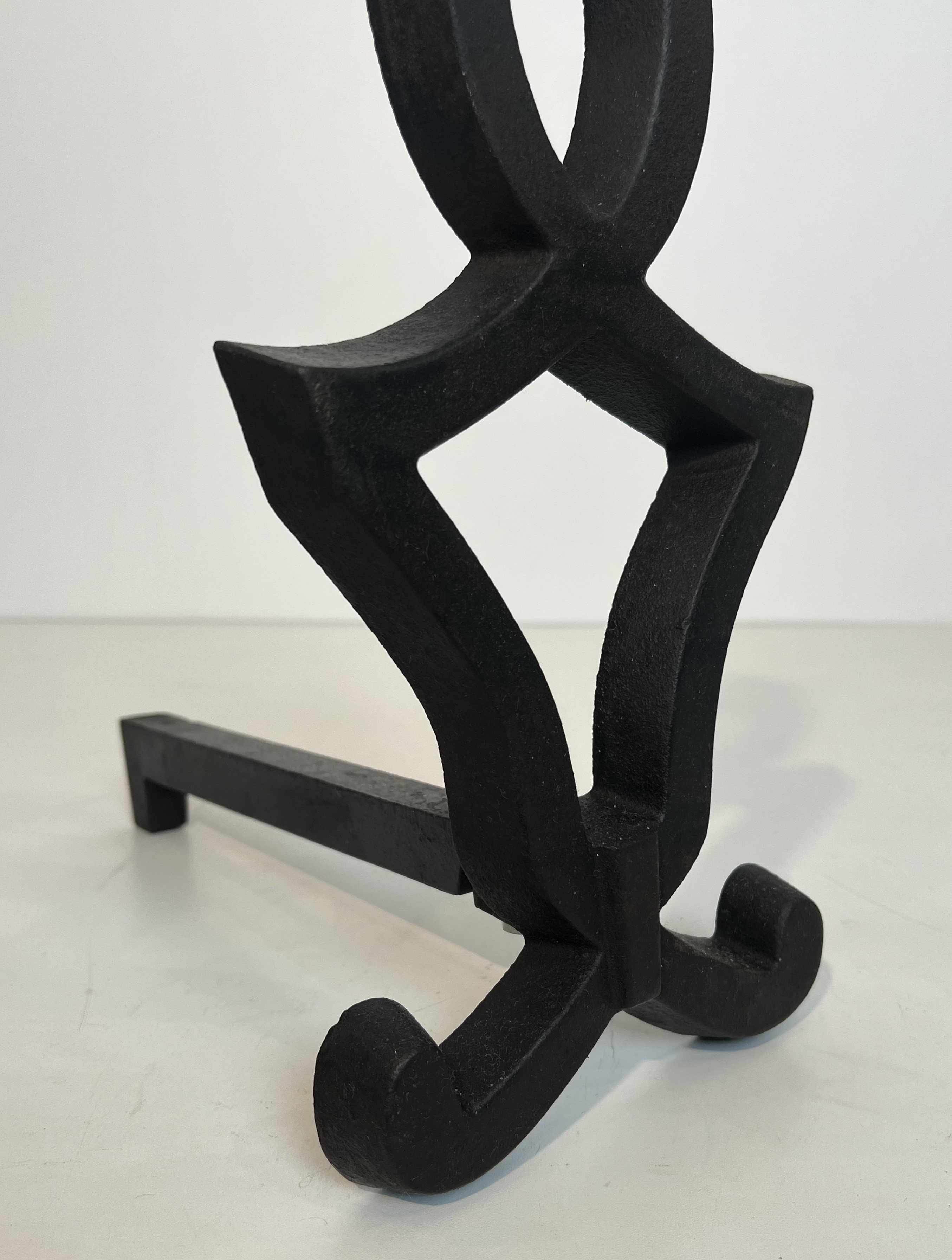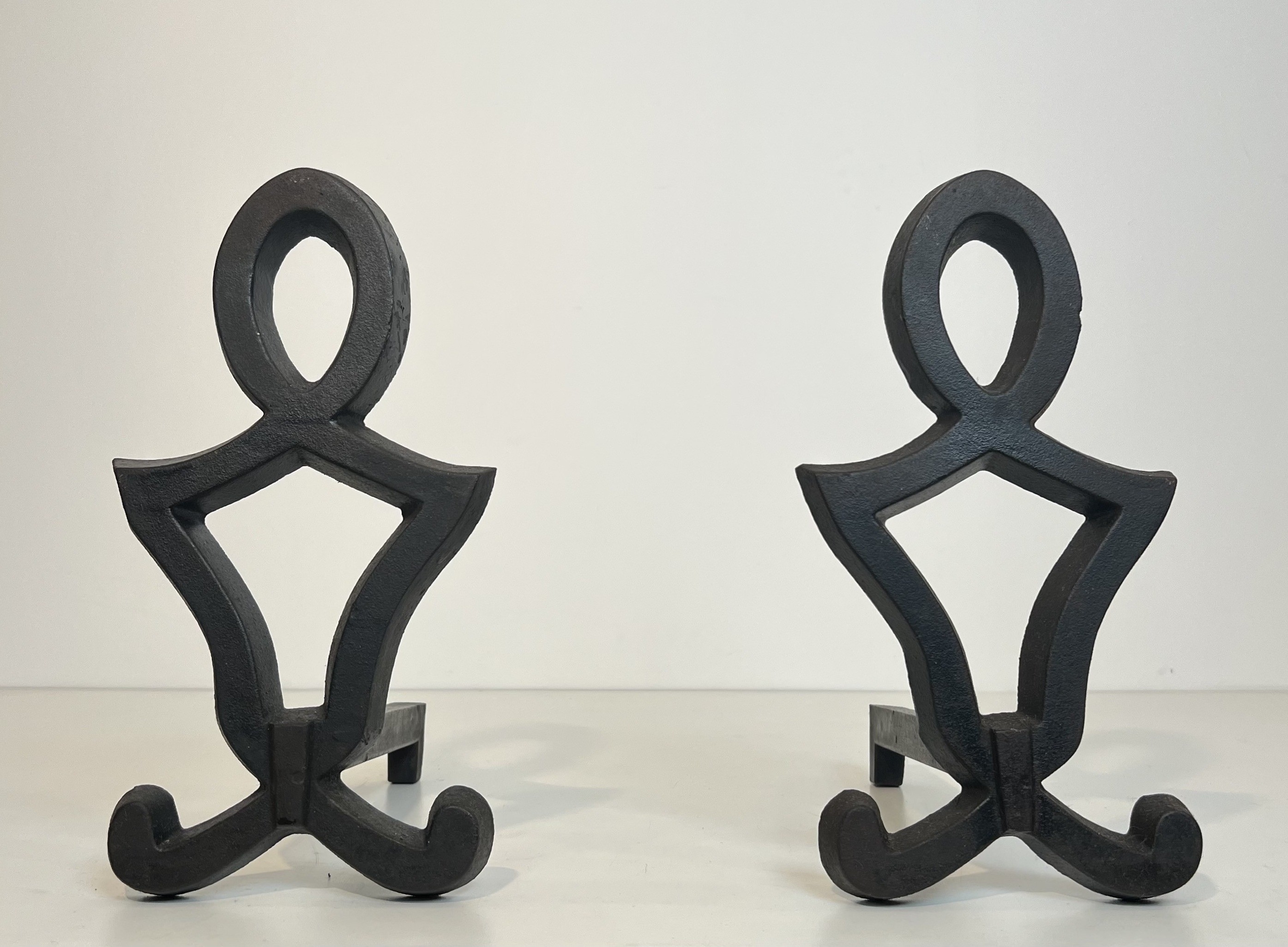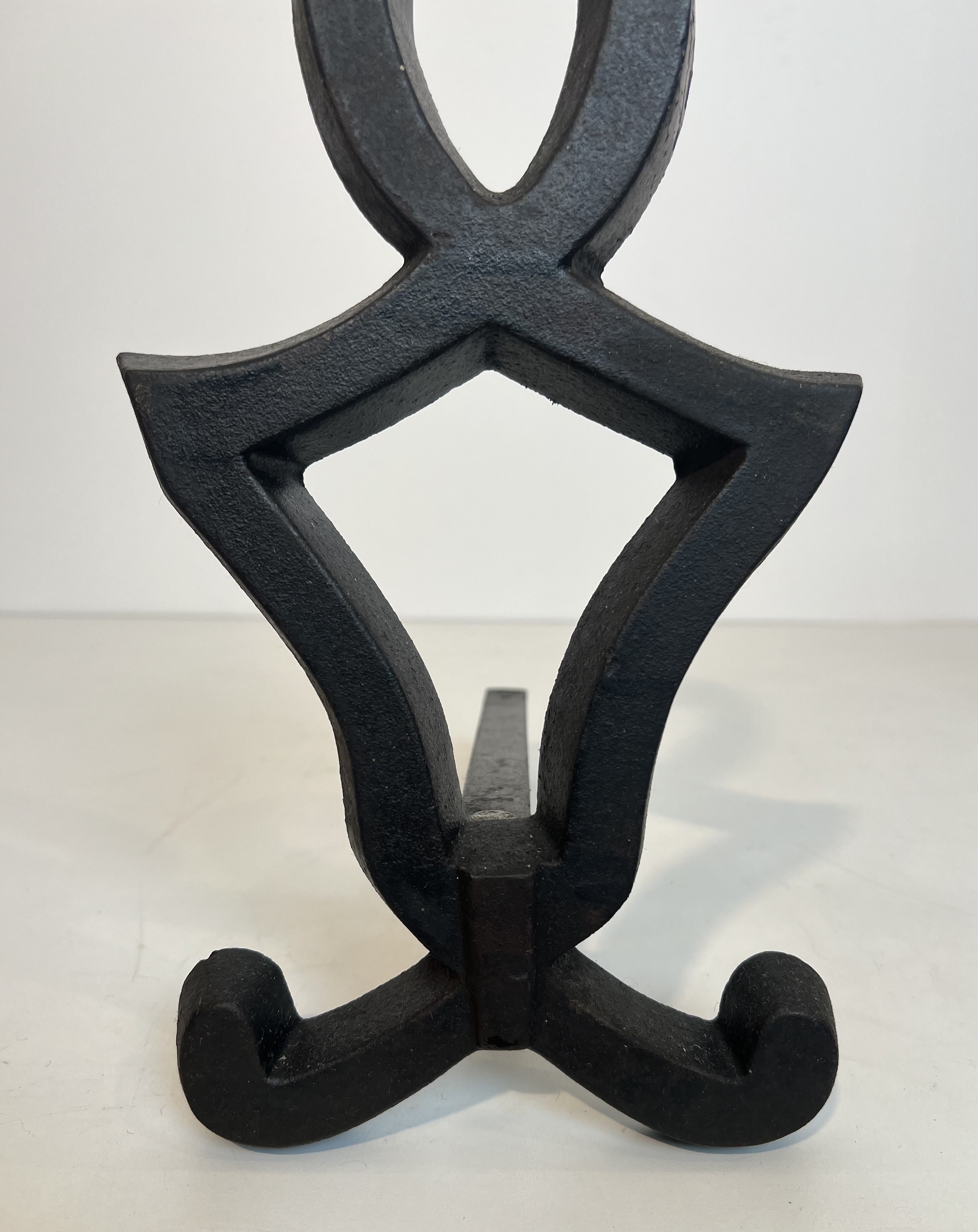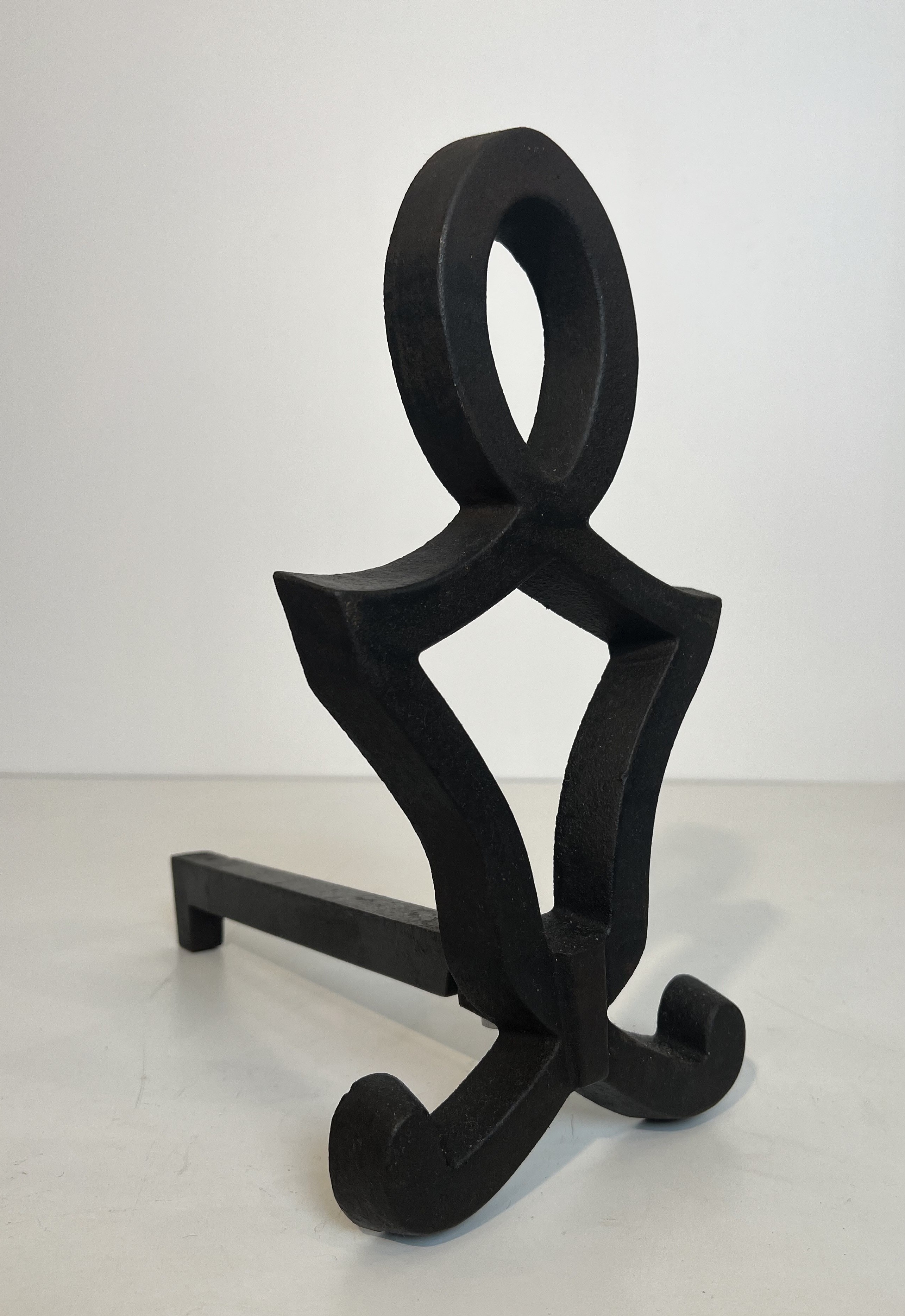 This exceptional pair of modernist andirons in cast iron and wrought iron is a significant work by Raymond Subes, one of the most celebrated French metalworkers of the twentieth century. Produced circa 1940, the pieces exemplify the rigorous geometric aesthetic and superb technical execution that made Subes the preeminent ferronnerie artist of his generation. The interplay of cast and wrought iron allows for a dialogue between mass and line, the solid cast bases supporting finely worked wrought iron uprights of architectural precision. Together, they form a pair of objects that are simultaneously functional, sculptural, and authoritative.