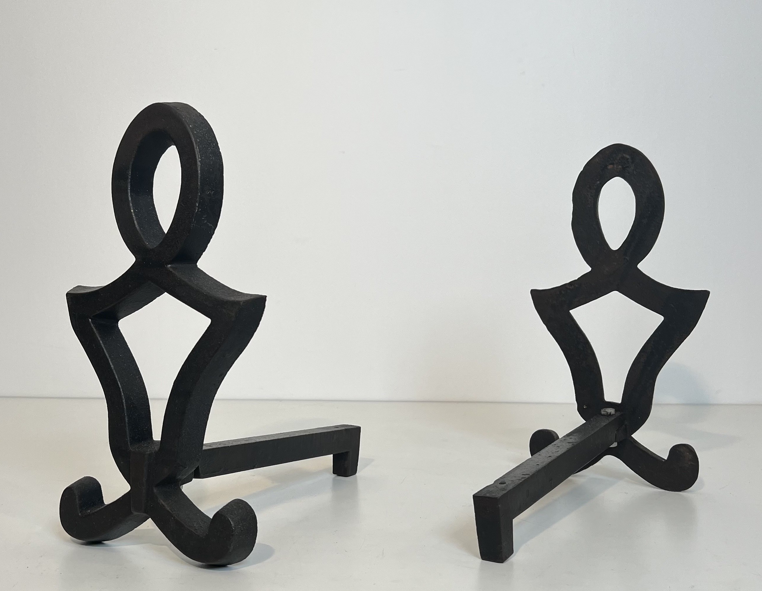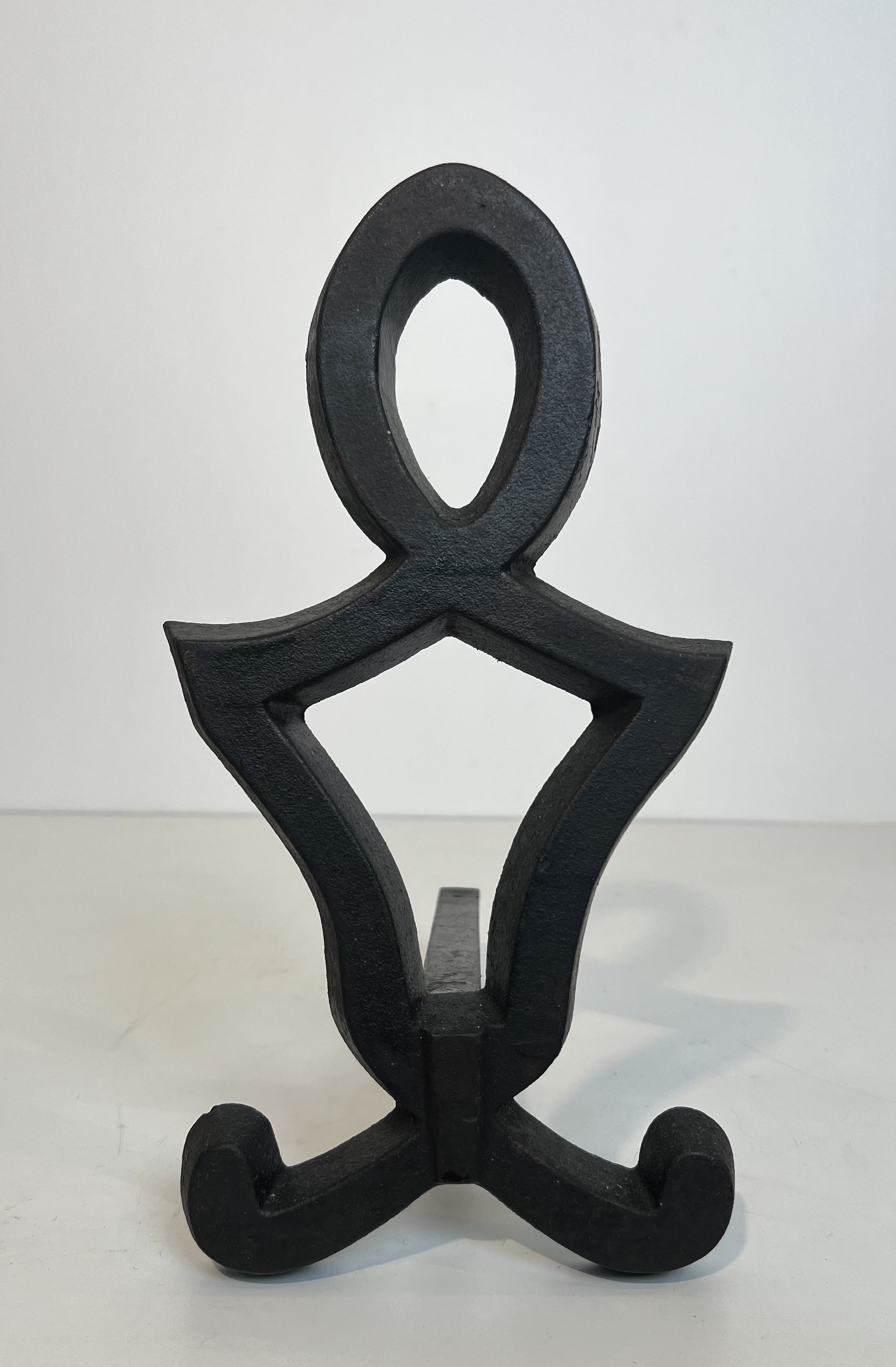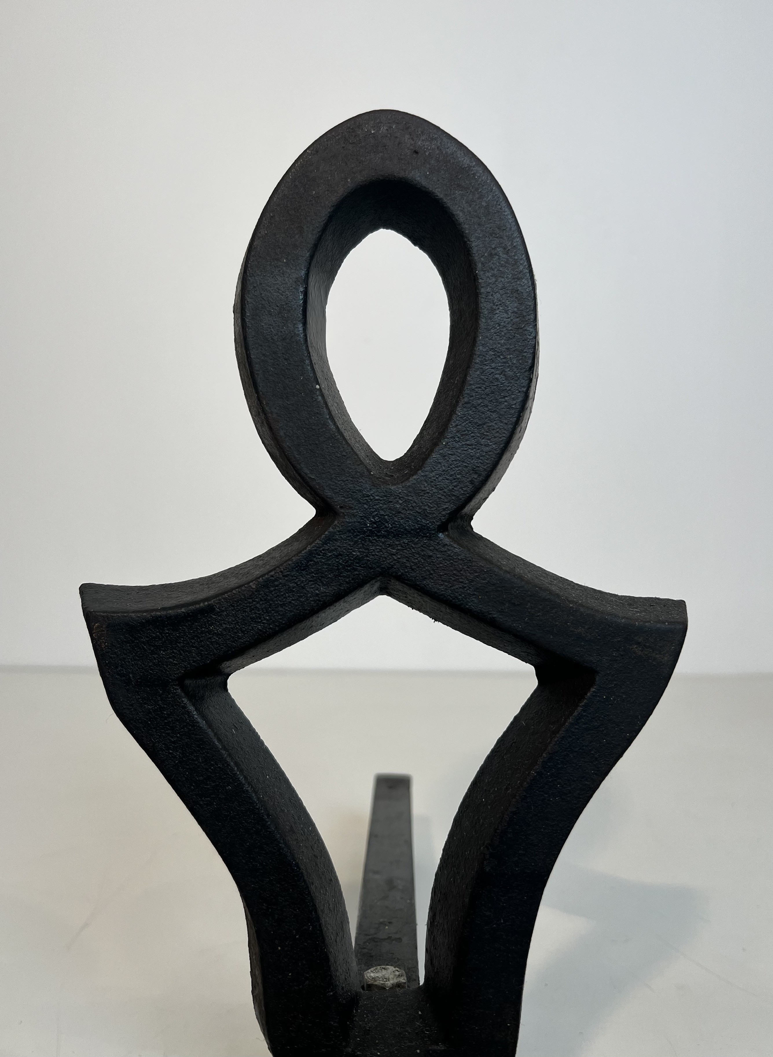 This exceptional pair of modernist andirons in cast iron and wrought iron is a significant work by Raymond Subes, one of the most celebrated French metalworkers of the twentieth century. Produced circa 1940, the pieces exemplify the rigorous geometric aesthetic and superb technical execution that made Subes the preeminent ferronnerie artist of his generation. The interplay of cast and wrought iron allows for a dialogue between mass and line, the solid cast bases supporting finely worked wrought iron uprights of architectural precision. Together, they form a pair of objects that are simultaneously functional, sculptural, and authoritative.