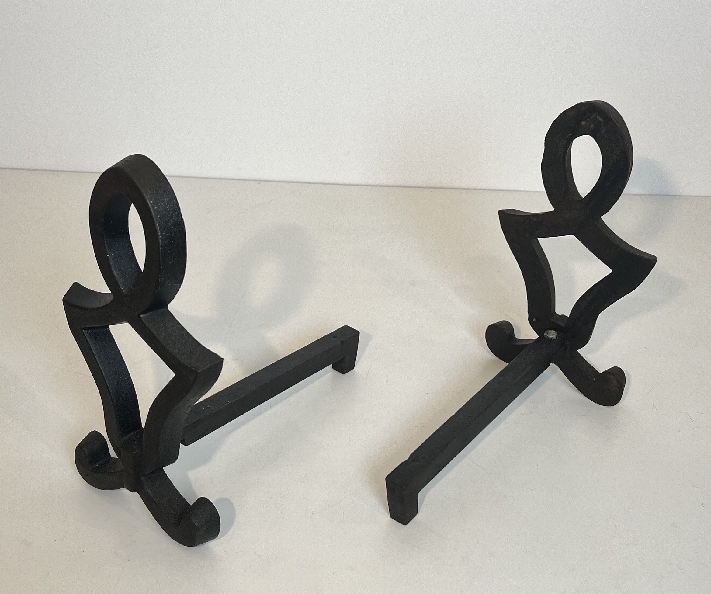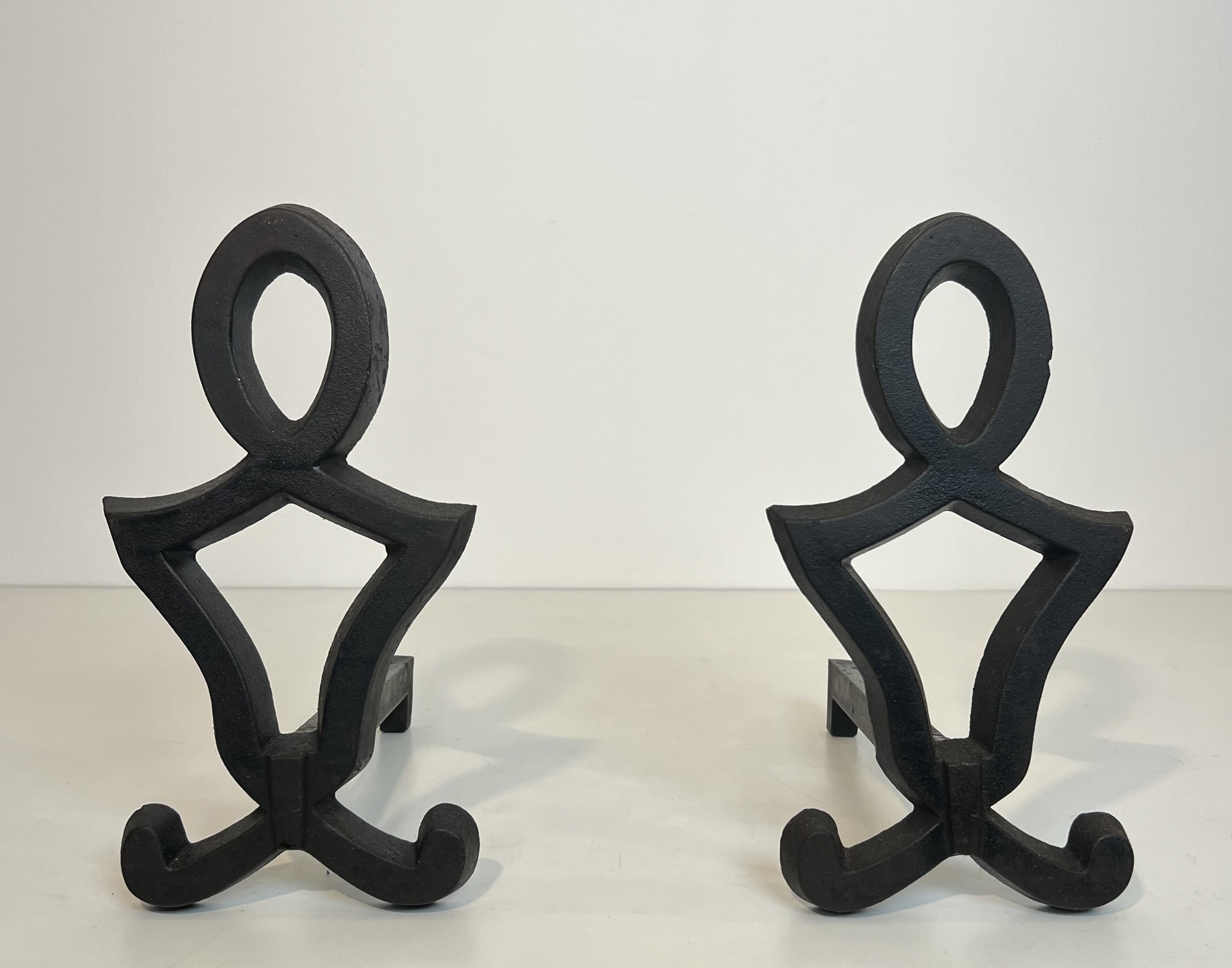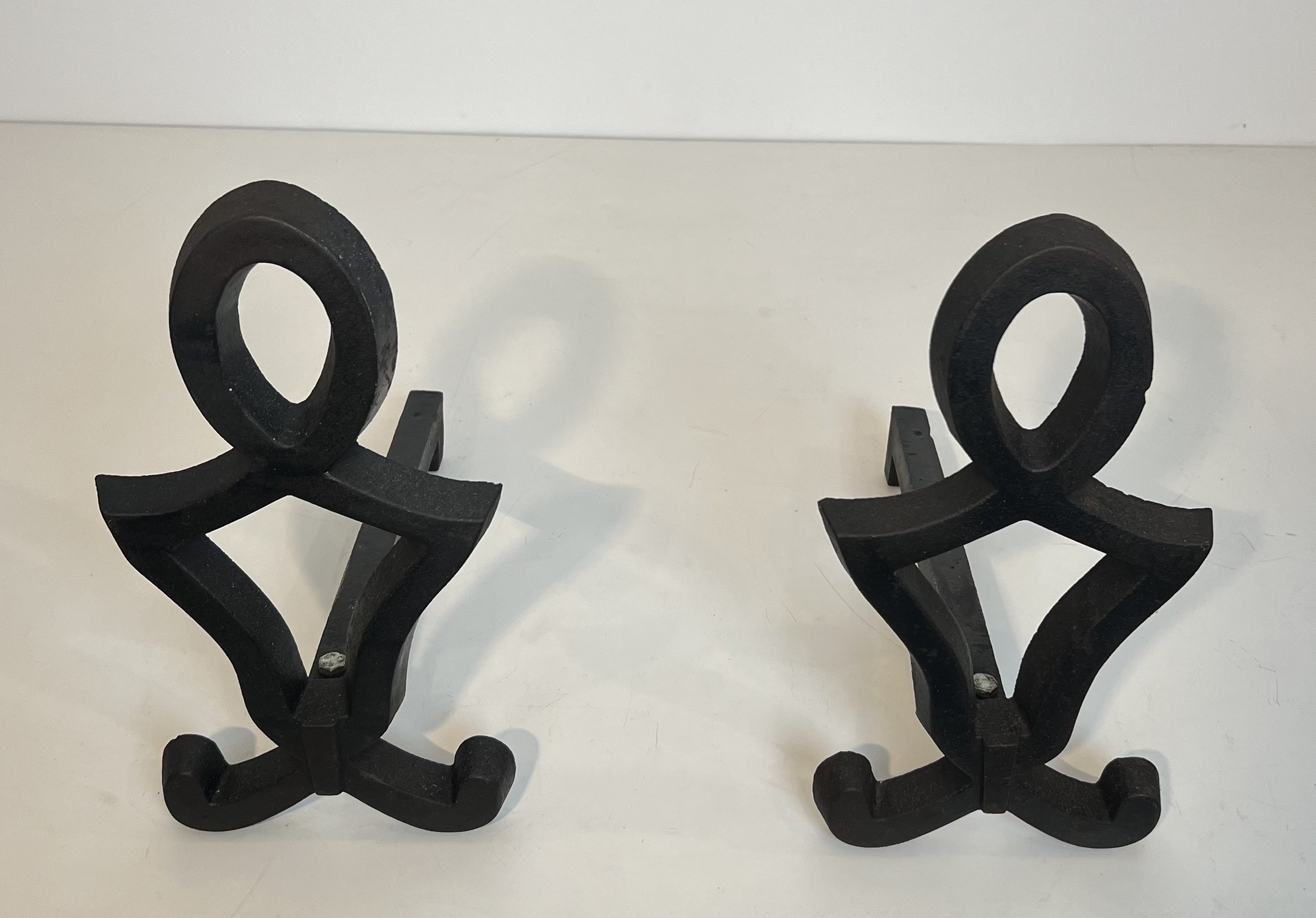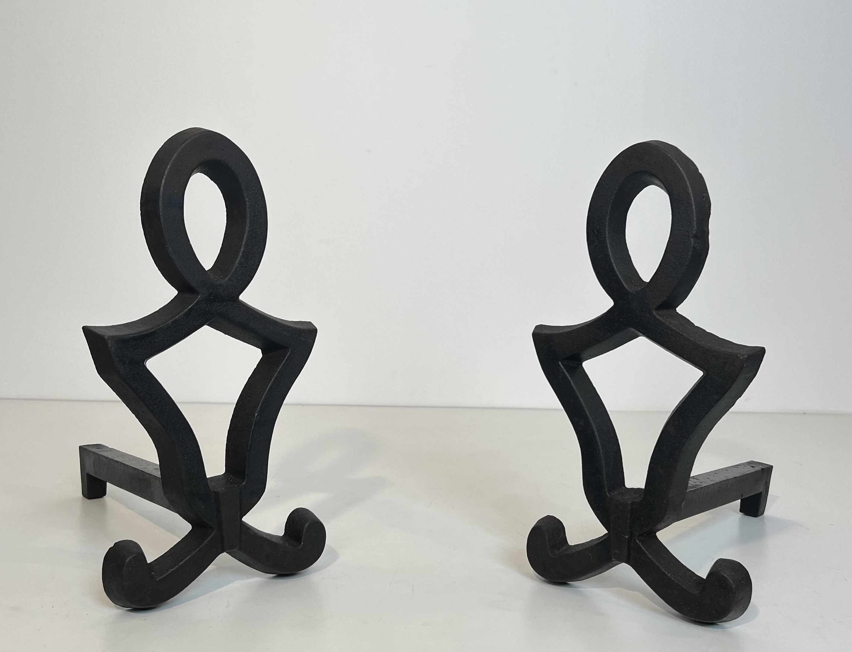 This exceptional pair of modernist andirons in cast iron and wrought iron is a significant work by Raymond Subes, one of the most celebrated French metalworkers of the twentieth century. Produced circa 1940, the pieces exemplify the rigorous geometric aesthetic and superb technical execution that made Subes the preeminent ferronnerie artist of his generation. The interplay of cast and wrought iron allows for a dialogue between mass and line, the solid cast bases supporting finely worked wrought iron uprights of architectural precision. Together, they form a pair of objects that are simultaneously functional, sculptural, and authoritative.