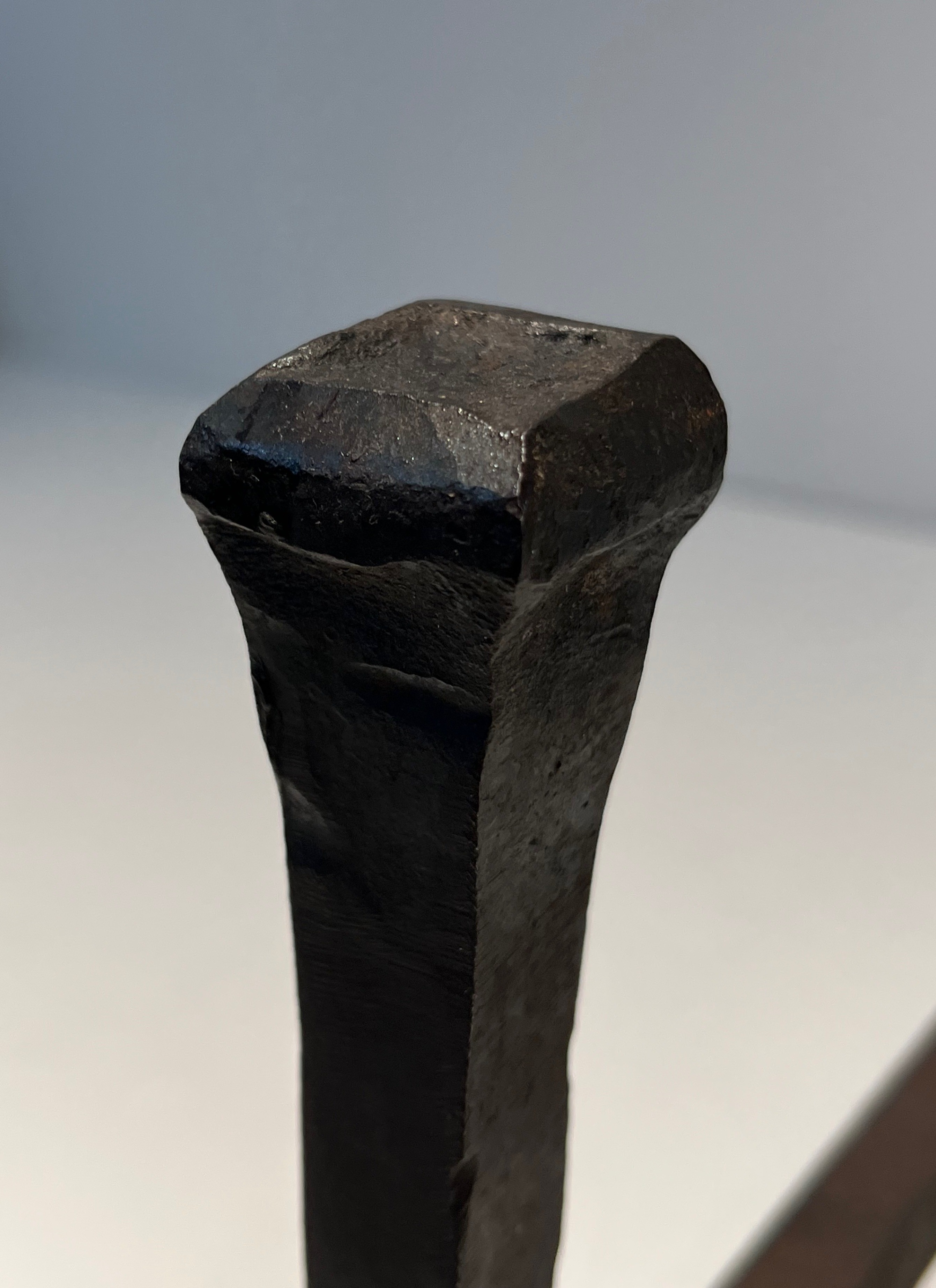 This pair of andirons combining cast iron and wrought iron illustrates the technical richness of French decorative ironwork in the 1970s, a period that saw many craftsmen renewing their connection with ancestral metallurgical traditions whilst adapting them to a contemporary formal vocabulary. Cast iron, obtained by pouring into moulds, and wrought iron, shaped at heat under the blacksmith's hammer, complement each other here to form andirons of fine visual bearing and unquestionable robustness.