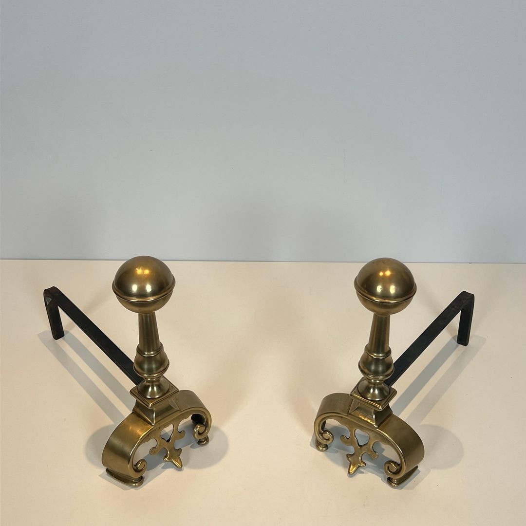 A pair of neoclassical brass andirons of the type produced by the most accomplished French bronziers of the Belle Époque. Each upright rises from an ornate cast base enriched with scrollwork and foliage, its turned column culminating in a polished sphere finial—a form at once classical in its antecedents and satisfyingly resolved in proportion. The ball finial on a turned shaft is among the most canonical of French andiron types, appearing with consistent authority from the Louis XVI period through the Empire and into the neoclassical revivals of the late nineteenth and early twentieth centuries. The warm, polished brass finish presents with the depth and luminosity characteristic of quality period metalwork.