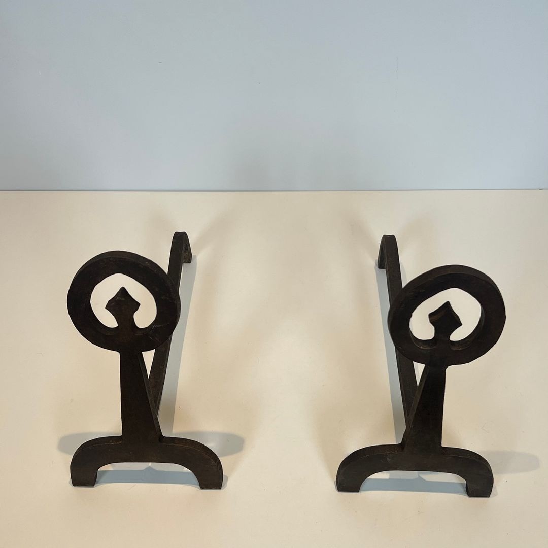 Pair of modernist andirons in blackened wrought iron, each with an open ring finial on a slender vertical rod supported by a low, wide-splayed tripod base. French work, circa 1970. W. 16 × D. 36.5 × H. 28.5 cm.