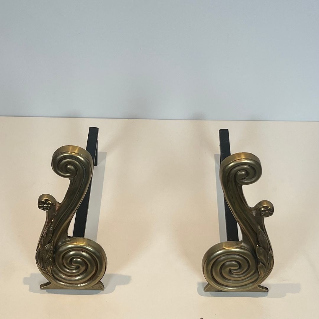 Pair of Louis XVI style andirons in gilded bronze and wrought iron, the uprights formed as tightly coiled volutes on scrolled bases. Signed Armor Din. French, circa 1940. W. 12 × D. 39.5 × H. 28.5 cm.