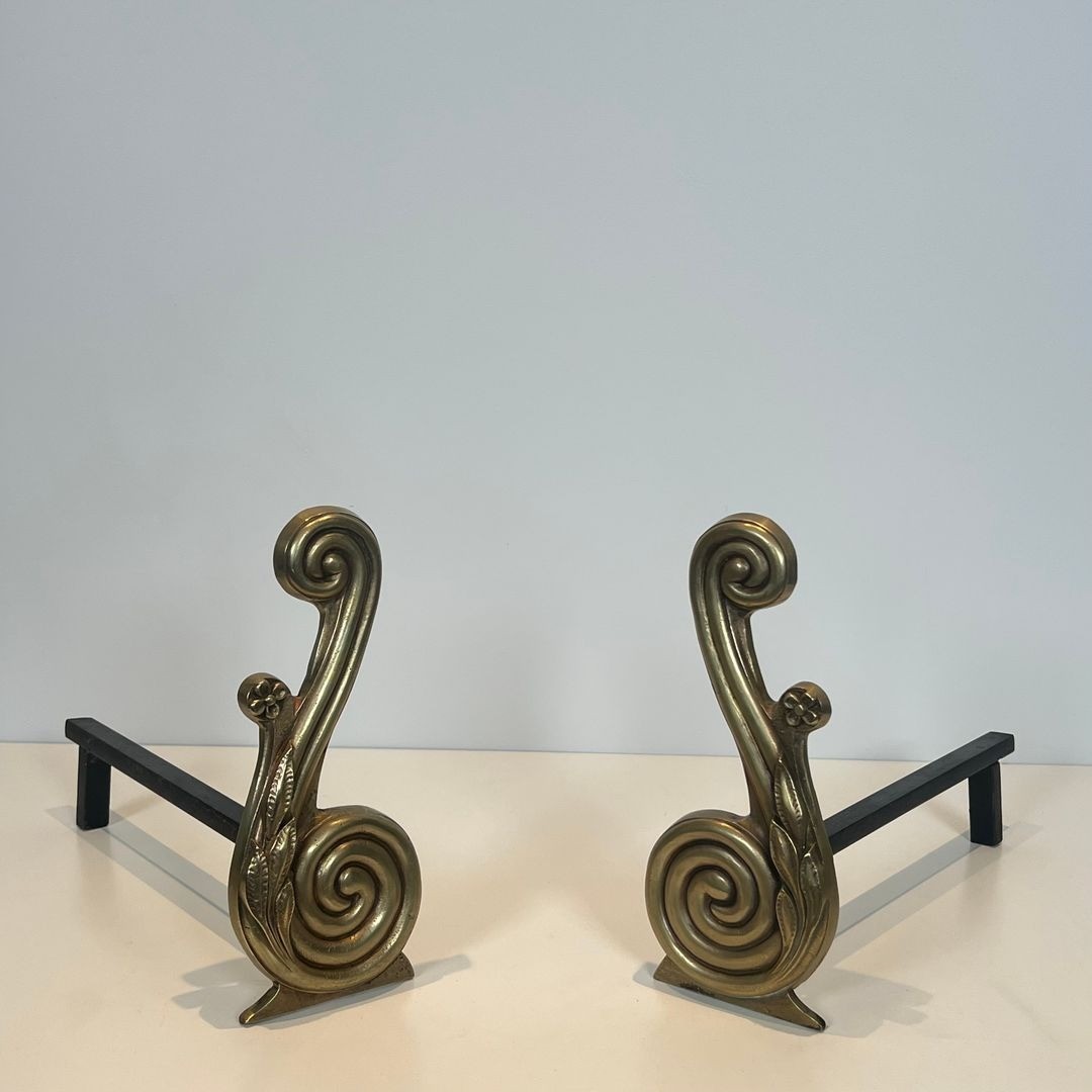 Signed Armor Din, these andirons bear the mark of a French foundry or atelier active in the interwar period. The quality of the bronze casting is notable: the volute is cleanly defined, the surface evenly worked, and the junction between the cast bronze upright and the wrought iron hearth bar is neatly executed. Such signed pieces occupy a distinguished position in the hierarchy of French decorative metalwork, bridging the gap between period reproductions and true artisanal commissions.