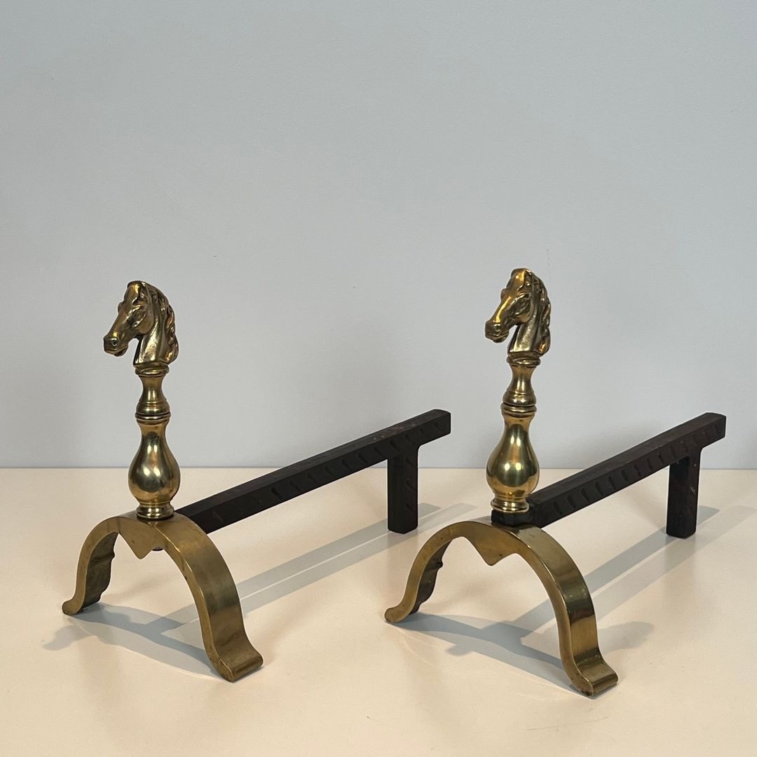 Pair of brass horse head andirons, each upright surmounted by a cast horse head finial above a turned column, on a tripod base with ball feet, joined by a connecting log rail. French, circa 1970. W. 19 × D. 37.5 × H. 27.5 cm.