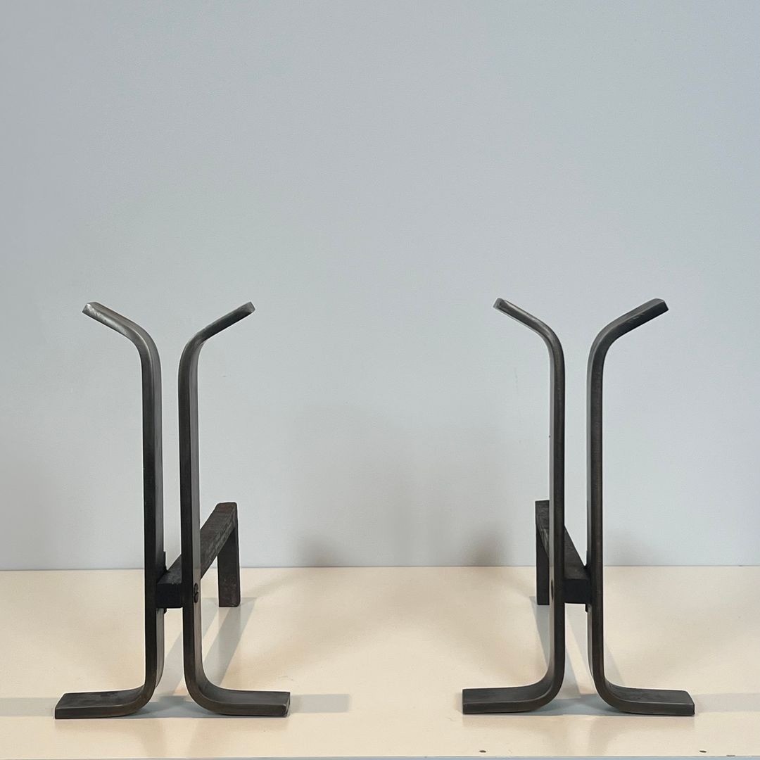 The bifurcated upright — a single stem that divides into two arching arms — is among the most efficient formal solutions in the modernist designer’s vocabulary: economical in means, strong in silhouette, and capable of expressing the quality of the material through the precision of the bend. These steel andirons, French, circa 1970, are an exemplary realization of that principle: each upright rises from a flat rectangular base, forks into two gracefully curved arms that sweep upward and outward, and presents as a clean, resolved graphic form against the fireplace opening.