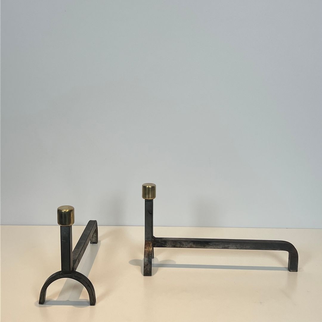 Pair of compact modernist andirons with cylindrical brass cap finials on forked wrought iron uprights. W. 12 × D. 39 × H. 21 cm. French work, circa 1970.