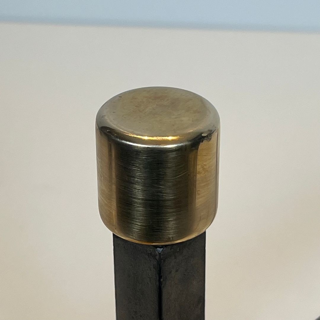 These compact modernist andirons achieve a quiet formal distinction through the combination of two simple elements: a cylindrical brass cap finial and a forked wrought iron upright whose two legs splay outward to form a stable, A-frame-like structure. The contrast between the warm polished brass at the top and the matte black iron of the body is a material dialogue characteristic of the most refined French fireplace accessories of the postwar decades, here deployed with particular economy in a design of considerable sculptural presence given its modest dimensions.