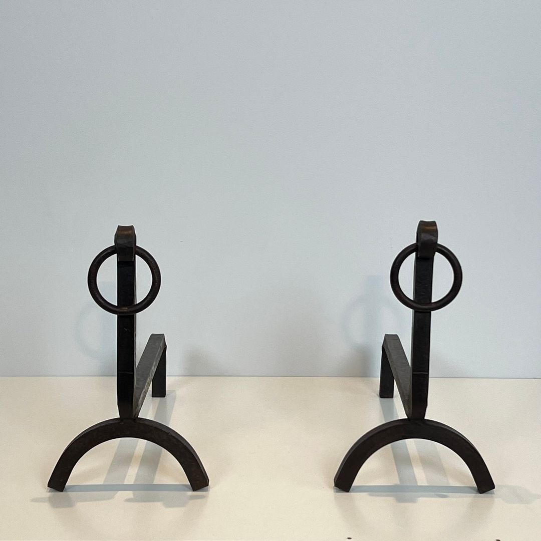 Pair of modernist wrought iron andirons with circular ring finials on slender uprights and arched bases. W. 19 × D. 41 × H. 33 cm. French work, circa 1940.