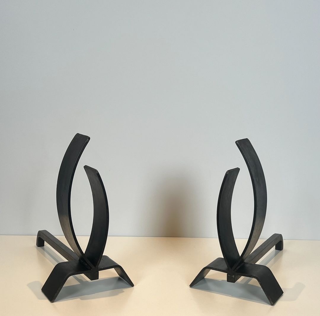 Pair of modernist matte black steel andirons with dramatically arched upswept uprights on flat rectangular base plates. W. 21 × D. 43 × H. 36.5 cm. French work, circa 1970.