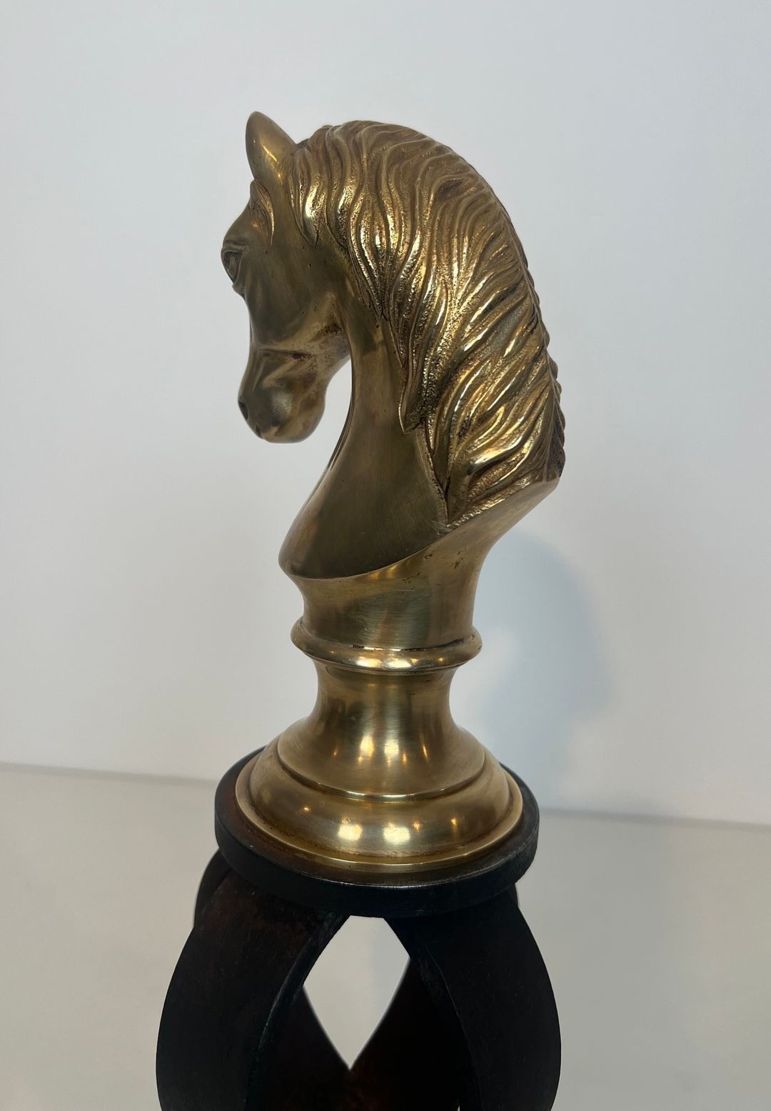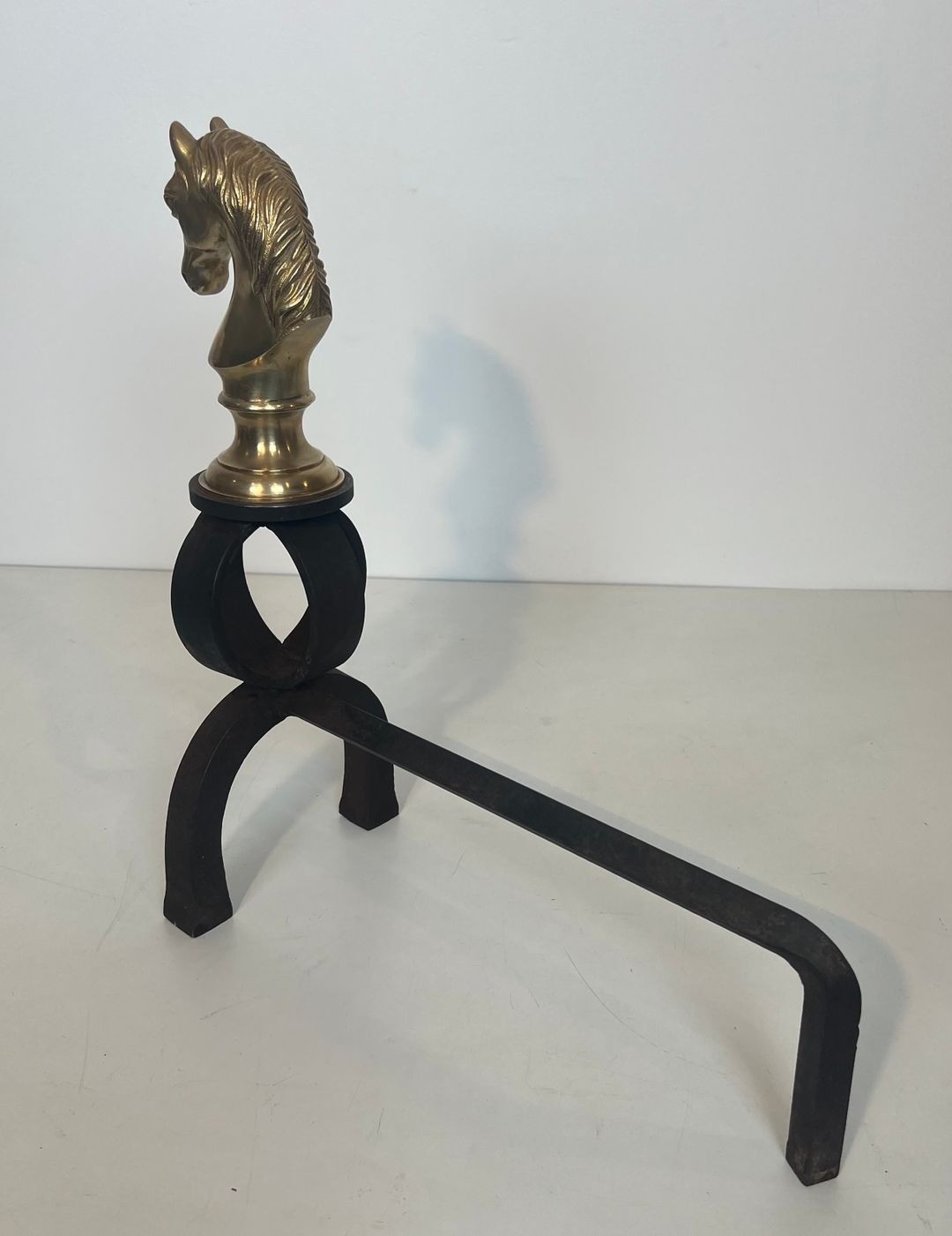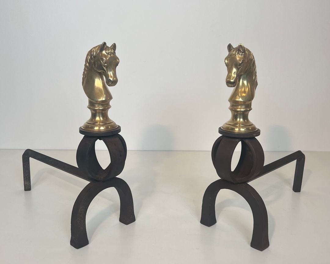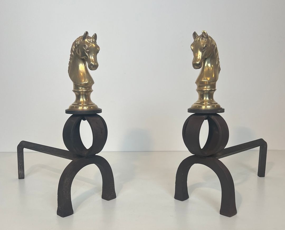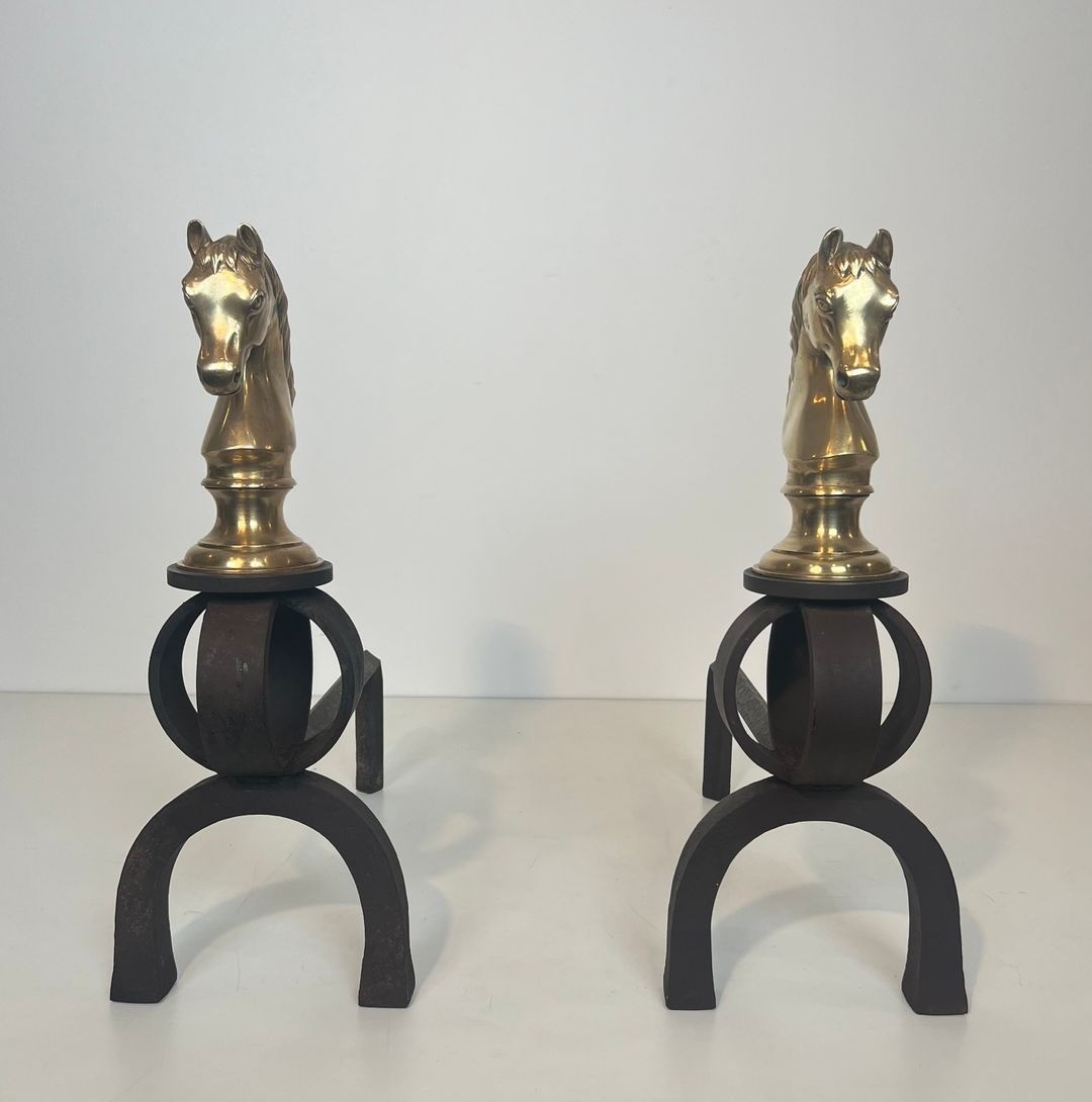 The horse heads are cast in bronze and finished to a warm gilt tone, each depicting a spirited animal with flowing mane and alert expression, set upon a circular ring of wrought iron that forms the upright of each andiron. The contrast between the polished gold of the bronze and the matte black of the forged iron is handled with the confident material authority characteristic of the best Belle Époque decorative production — a contrast that would be further heightened by firelight reflecting off the polished surface of each horse head. The modelling is accomplished, the alert, slightly forward-tilted head suggesting a horse at peak tension, fully alive to its surroundings.