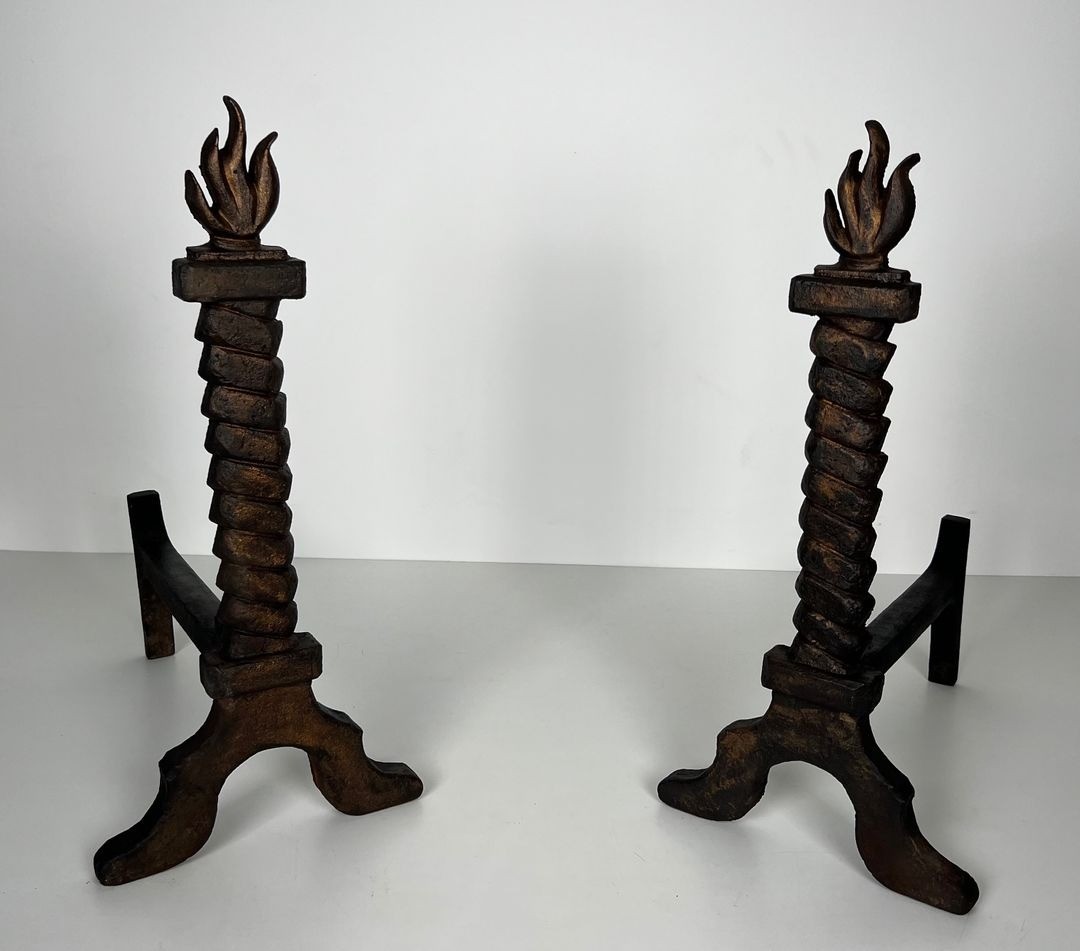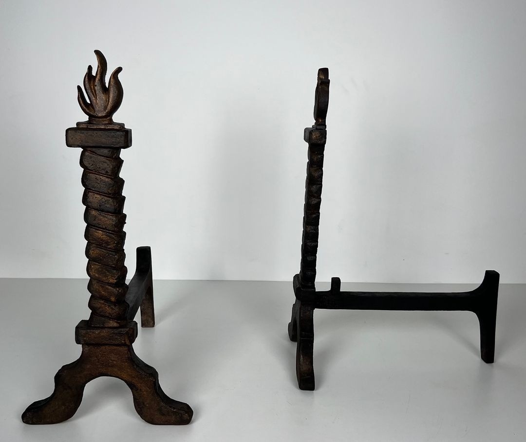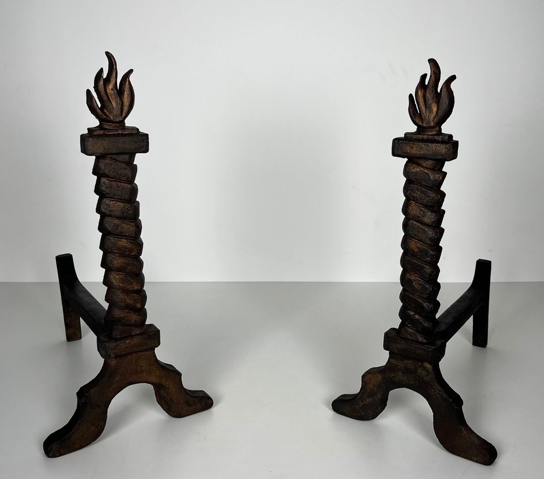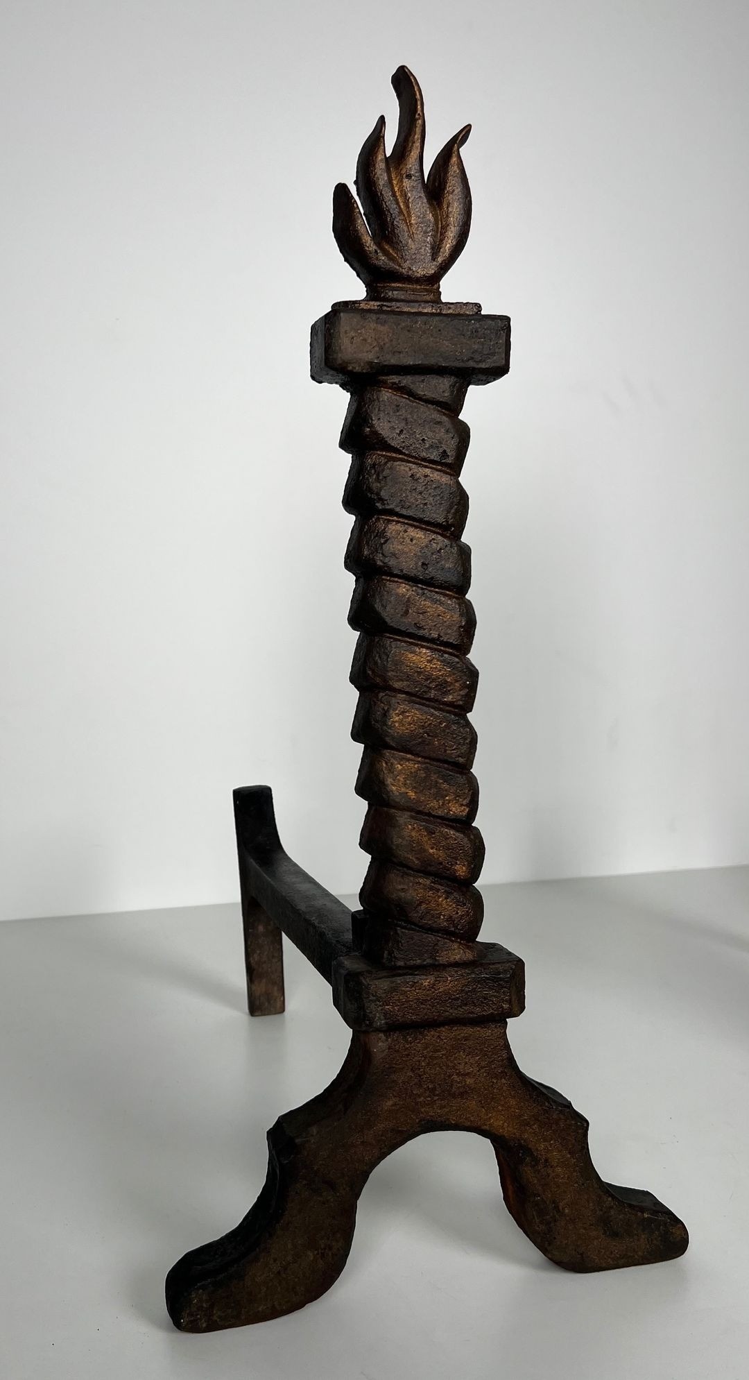 The uprights are formed from dark wrought iron shafts enriched with a twisted section, creating a rich play of light along the column — a technique drawn from the vocabulary of traditional French blacksmithing but elevated here to a refined decorative register. The flame finials — cast separately in iron and finished with a warm gilt patina — crown each column with a burst of light and movement, the spreading tongues of flame creating a silhouette of considerable drama against any fireplace surround. The contrast between the dark iron column and the warm gold of the flame is a signature element of the Poillerat aesthetic and one of the most effective material juxtapositions in French Art Deco metalwork.