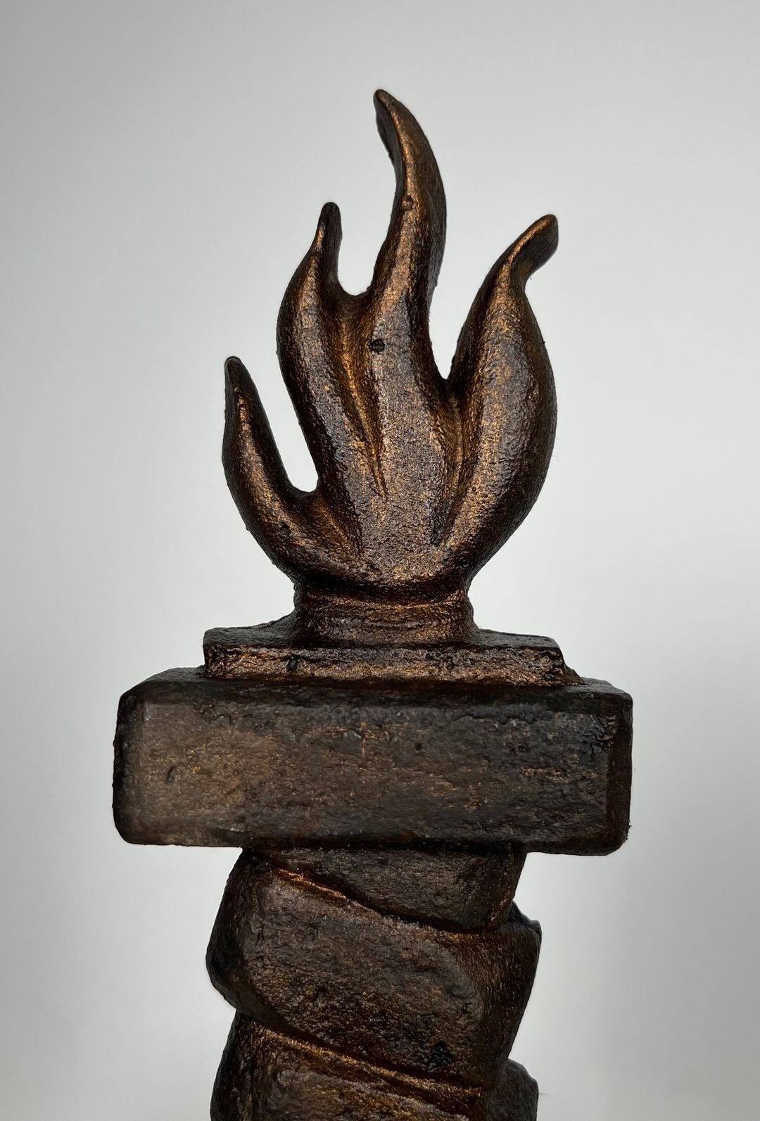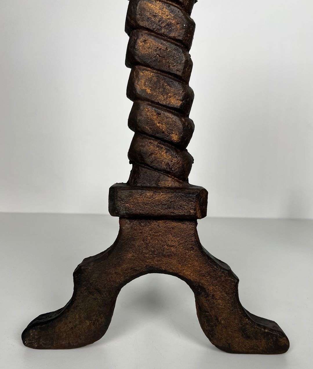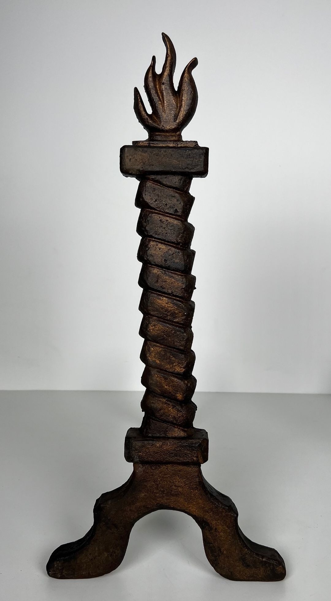 The uprights are formed from dark wrought iron shafts enriched with a twisted section, creating a rich play of light along the column — a technique drawn from the vocabulary of traditional French blacksmithing but elevated here to a refined decorative register. The flame finials — cast separately in iron and finished with a warm gilt patina — crown each column with a burst of light and movement, the spreading tongues of flame creating a silhouette of considerable drama against any fireplace surround. The contrast between the dark iron column and the warm gold of the flame is a signature element of the Poillerat aesthetic and one of the most effective material juxtapositions in French Art Deco metalwork.