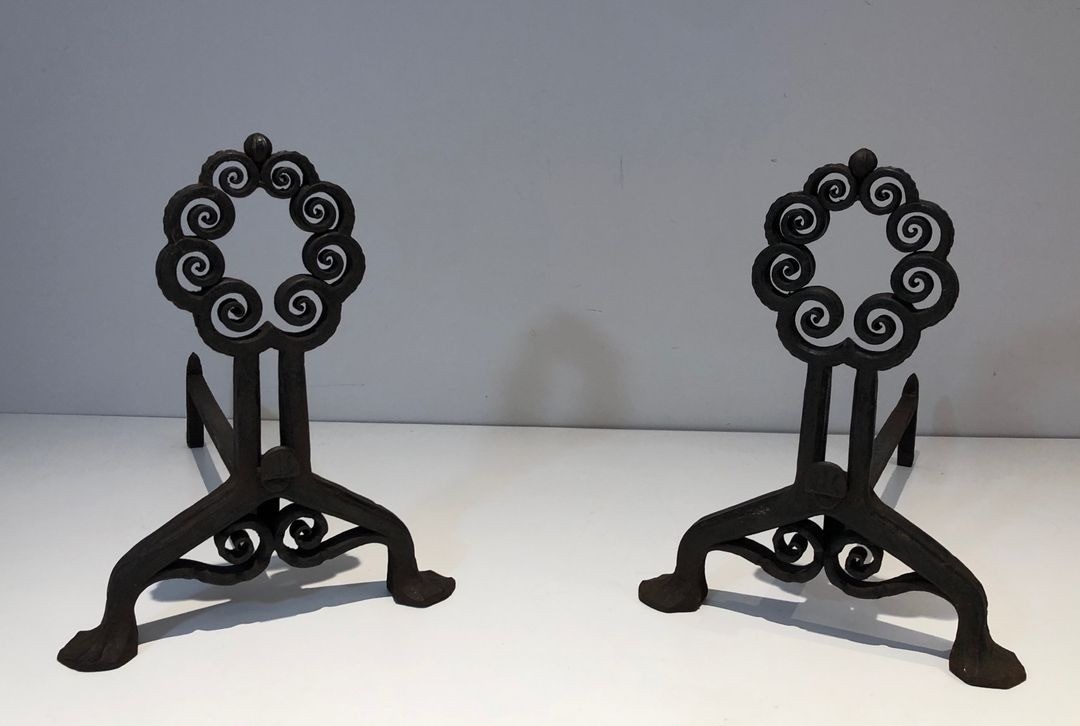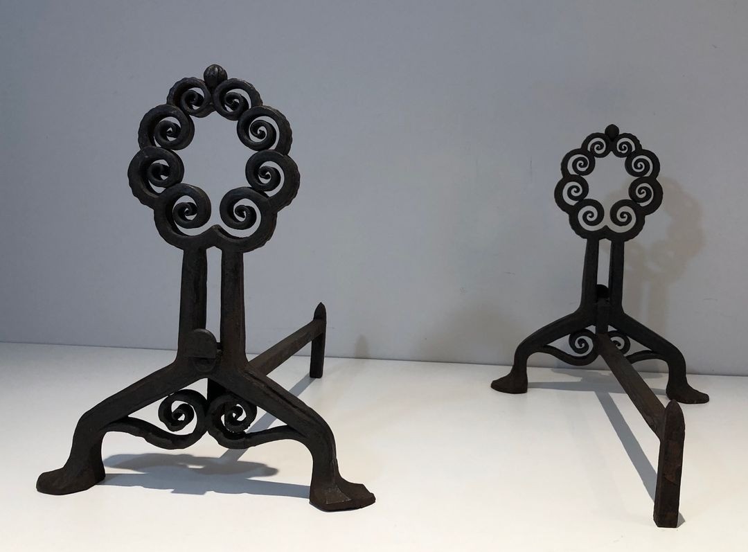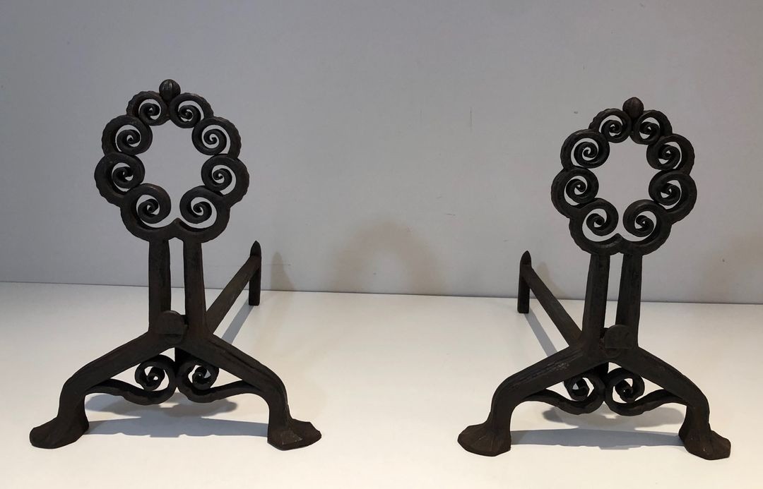 Pair of Art Nouveau Wrought Iron Andirons with Circular Scrollwork, Signed Wanner Geneva