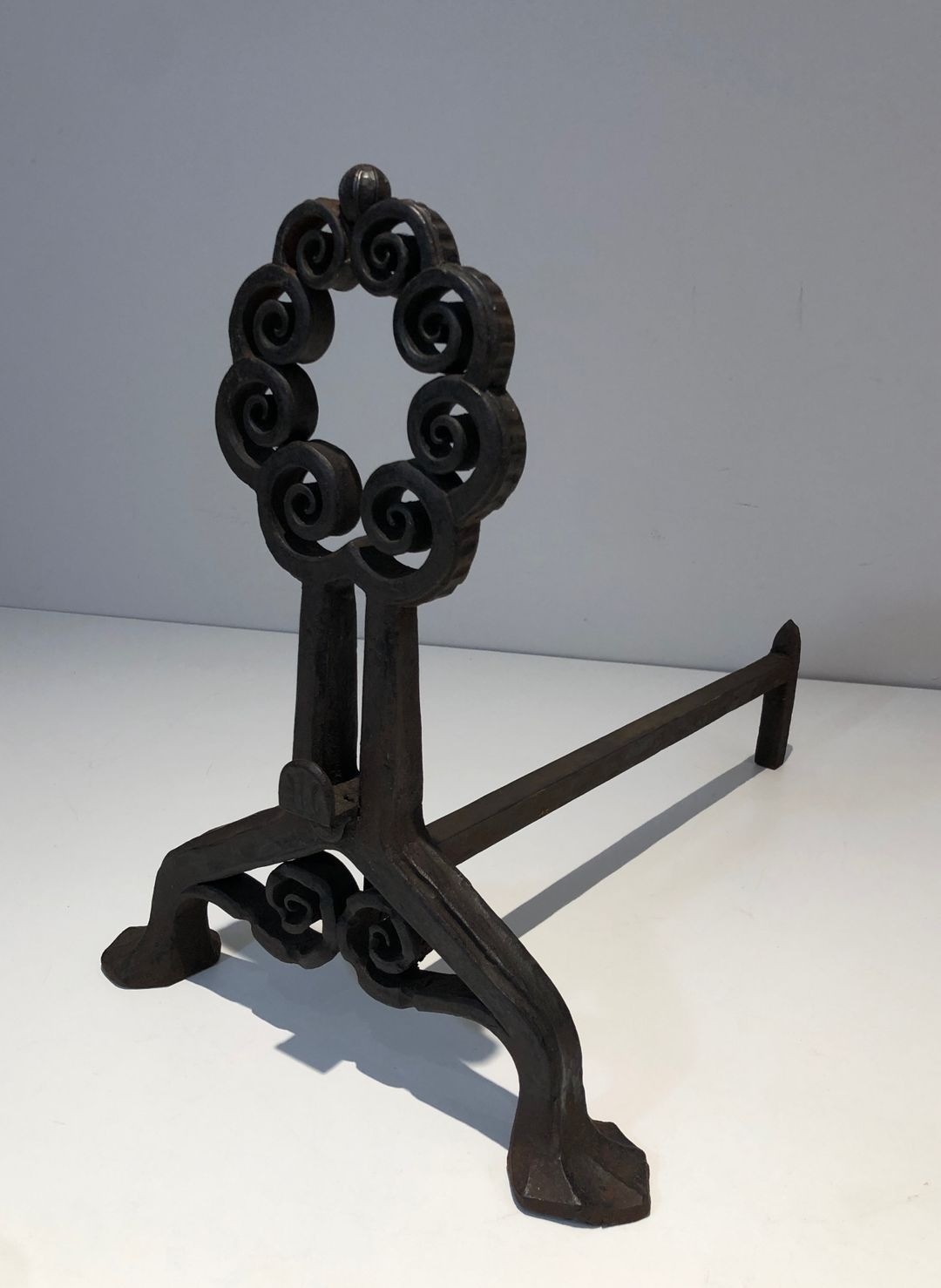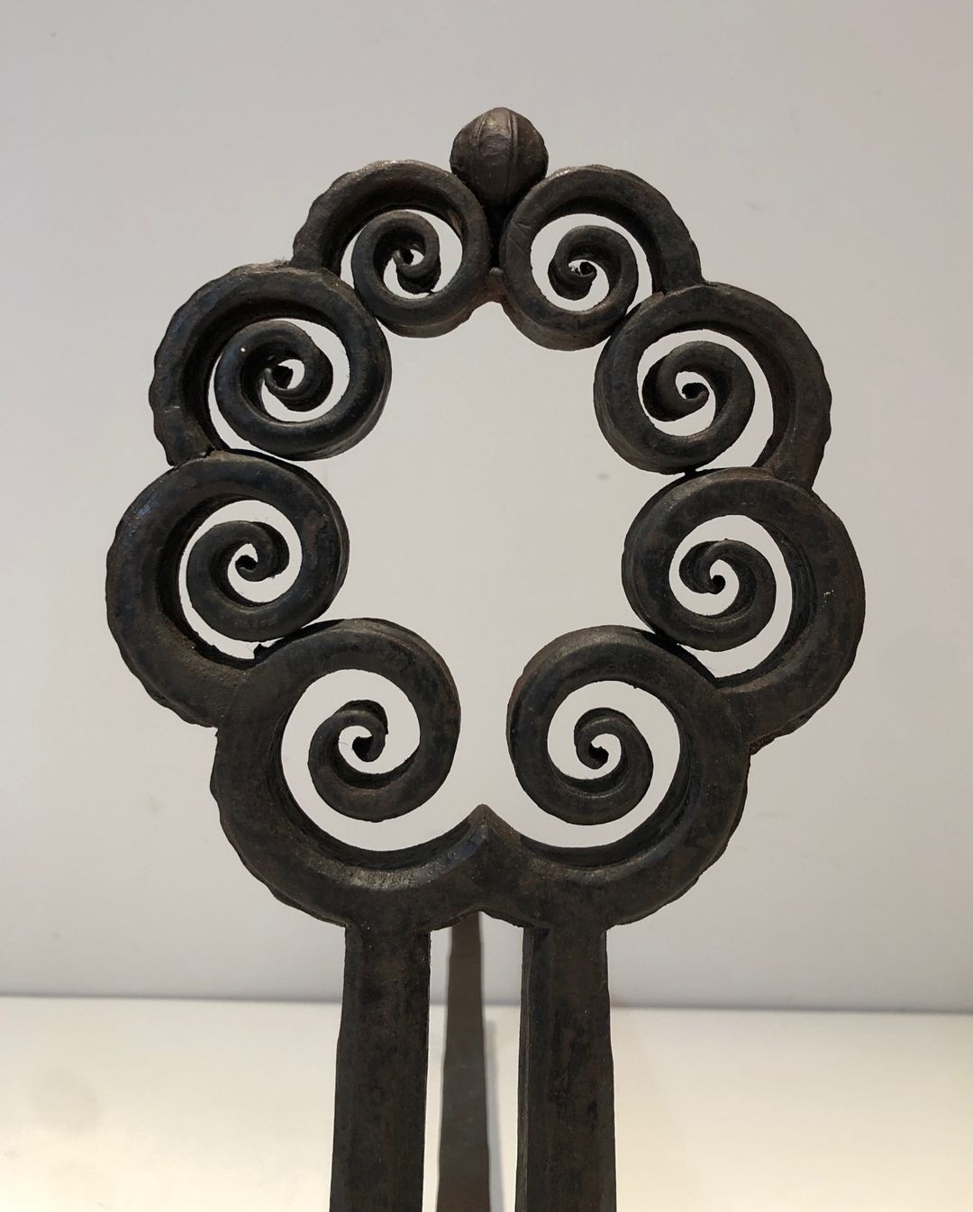 The base of each andiron is structured with confident practical authority: extended feet providing a stable footprint on the hearth, and substantial horizontal log bars projecting to support the firewood. The proportions are carefully balanced — at 36 centimetres tall, the uprights draw the eye without overpowering the hearth surround, while the 47-centimetre depth ensures ample log support. The pair was clearly conceived as a unified composition, with each piece a mirror image of the other.