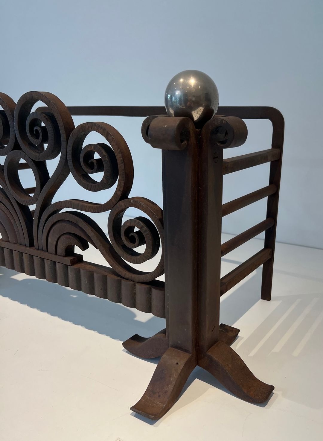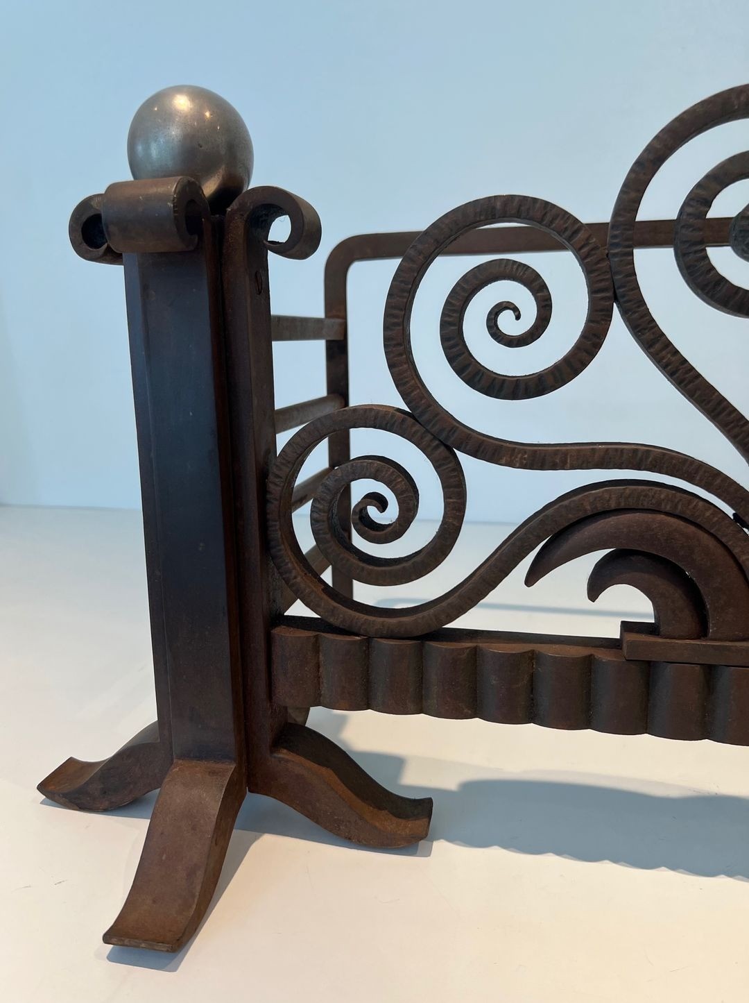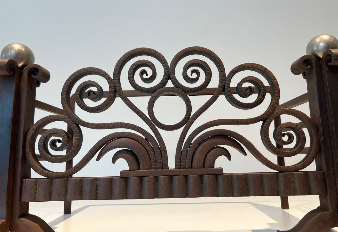 A distinguished addition to any collection of Art Deco decorative arts, this piece evokes the extraordinary flowering of French metalwork in the years between the wars, when the forge once again became a medium of high artistic ambition. It would sit comfortably alongside signed works by Brandt, Poillerat, or Subes, and would bring drama and historical depth to any fireplace in a period interior.