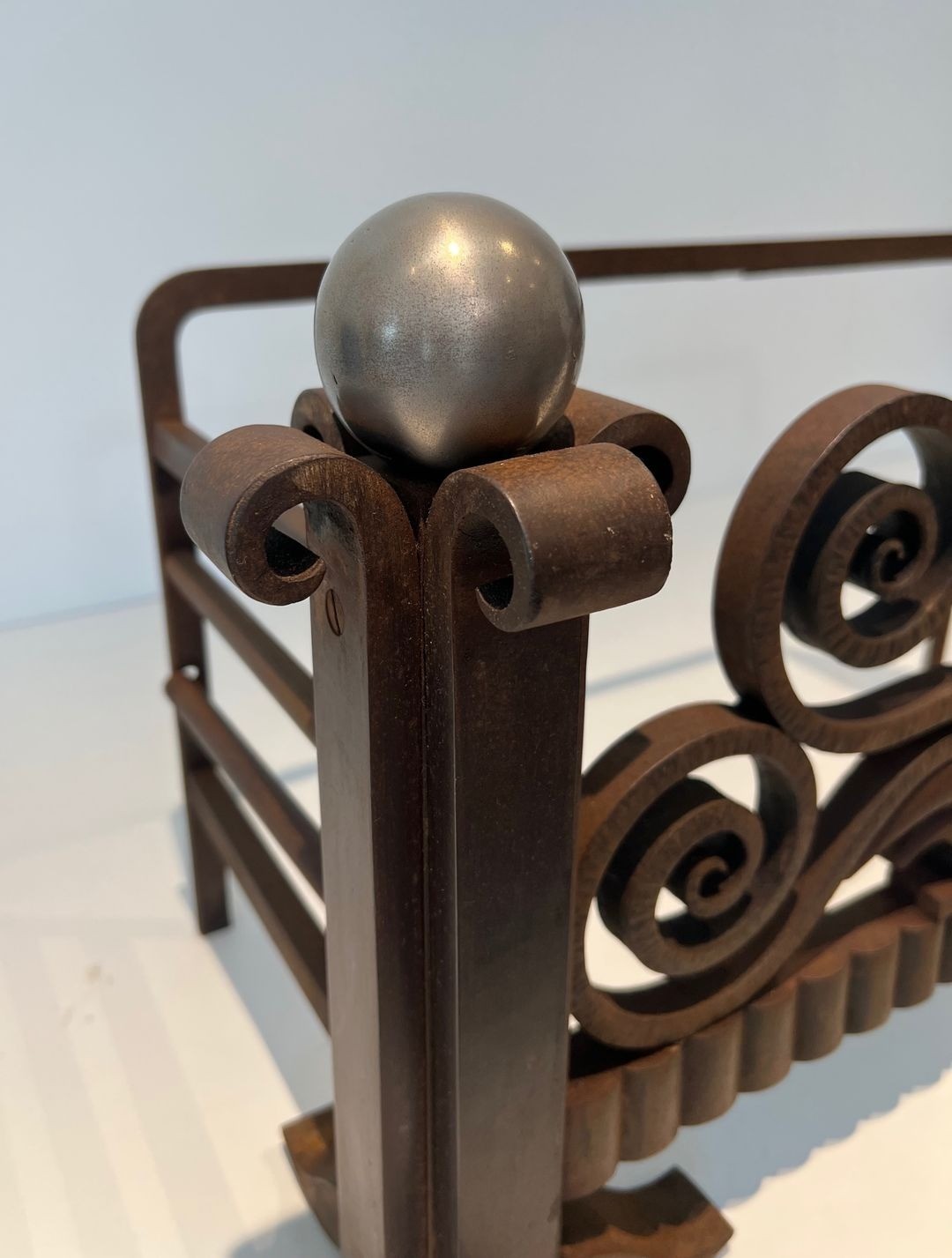 The lower register presents a comb-like horizontal rail that provides structural rigidity while echoing the rhythmic linearity so characteristic of the Moderne aesthetic. Scroll feet anchor the ensemble with elegant authority, ensuring stability on the hearth without sacrificing decorative refinement. Whether configured as a log cradle supporting and displaying a generous pile of firewood, or as a pair of freestanding andirons, the piece functions with equal grace in either role — a testament to the functional ingenuity that Brandt himself championed.