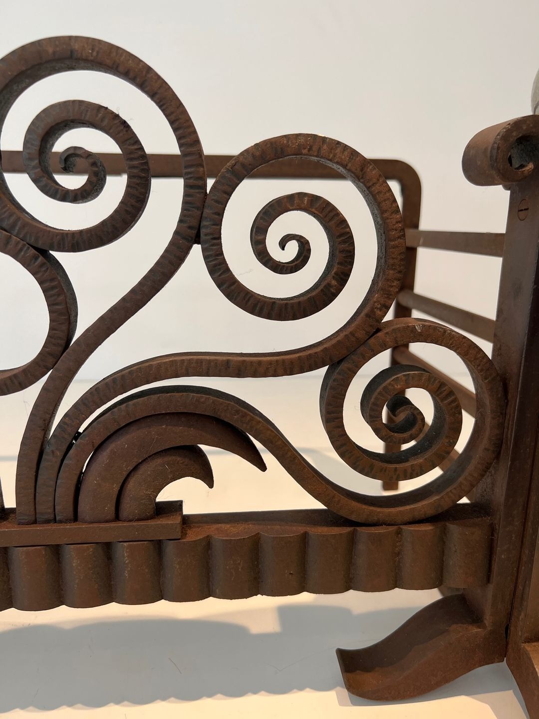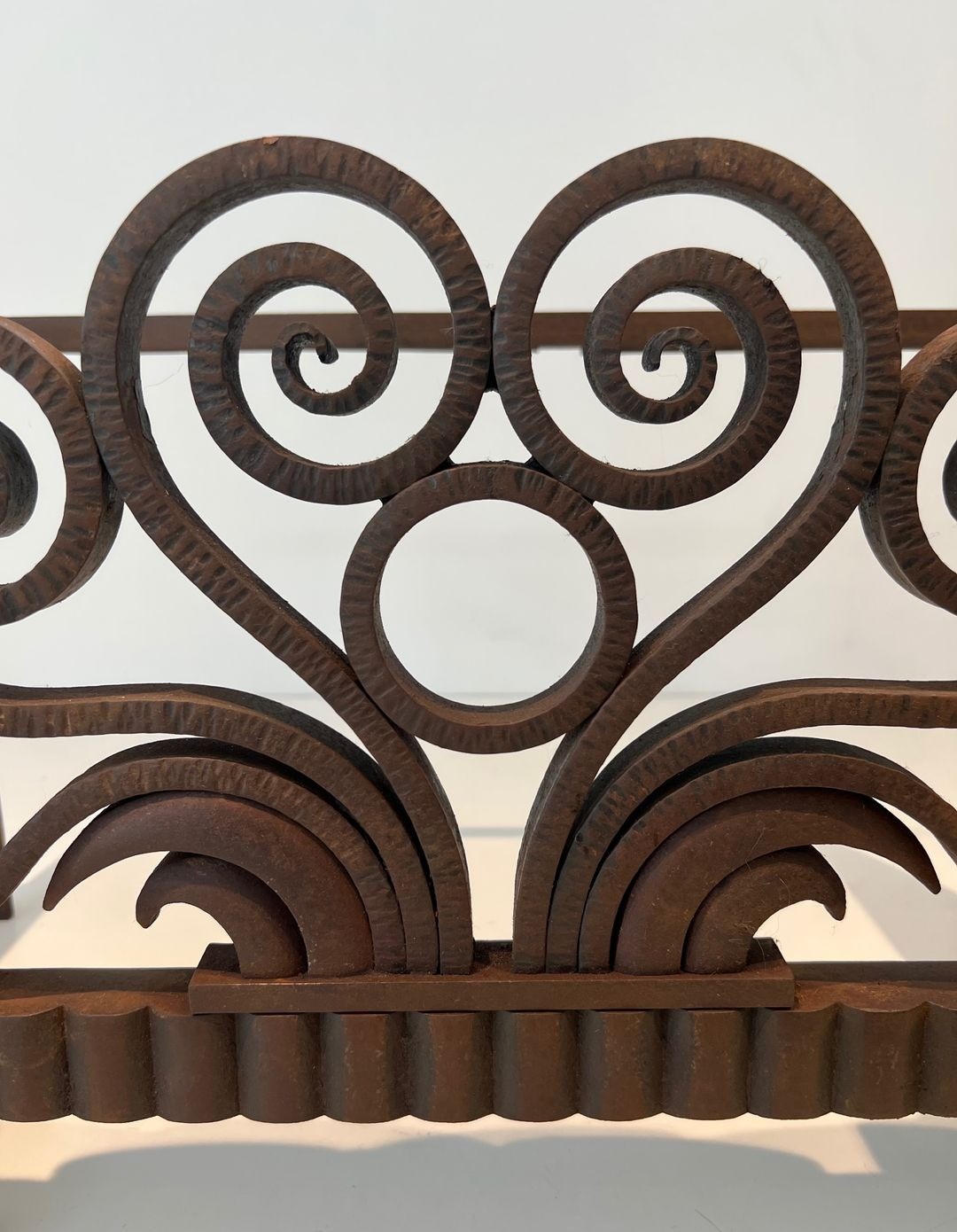 The upper frieze is dominated by a spectacular composition of triple spiral scrollwork interlaced with double-C volutes, an arrangement that recalls Brandt’s most celebrated panels and grilles exhibited at the Salon des Artistes Décorateurs and at the 1925 Exposition Internationale des Arts Décoratifs. Sinuous wave and vegetal motifs flow between the spirals, hammered to a fine relief that catches the light at every angle, revealing the skill of a blacksmith working at the summit of his craft. Chrome-finished horizontal bars punctuate the composition, introducing a contrast of industrial brilliance against the warm, matte texture of the hand-worked iron.